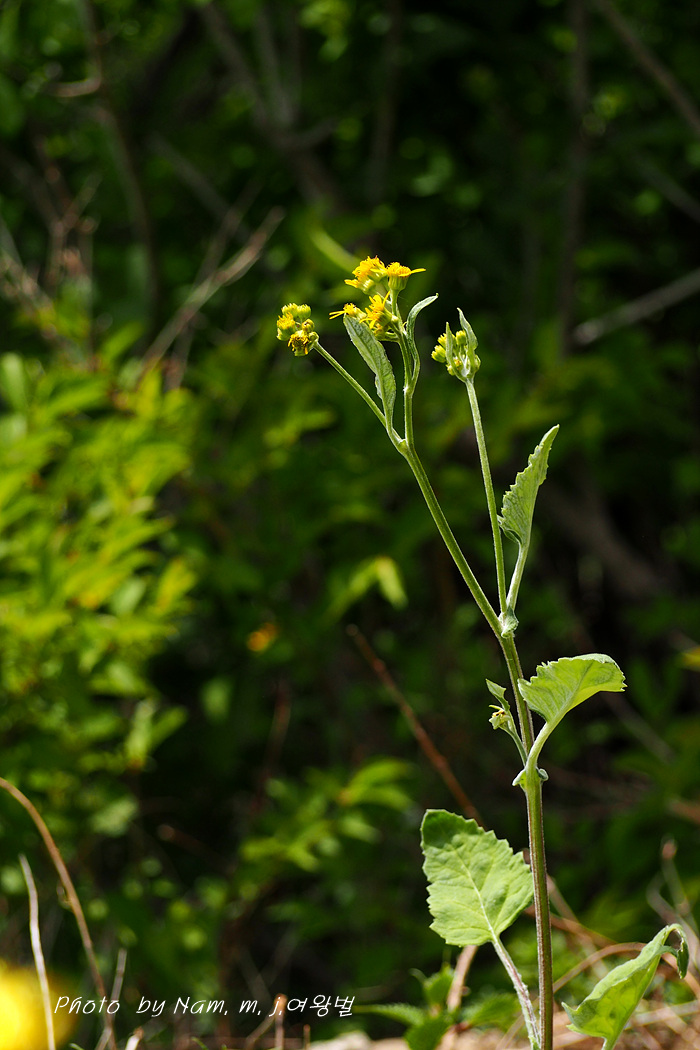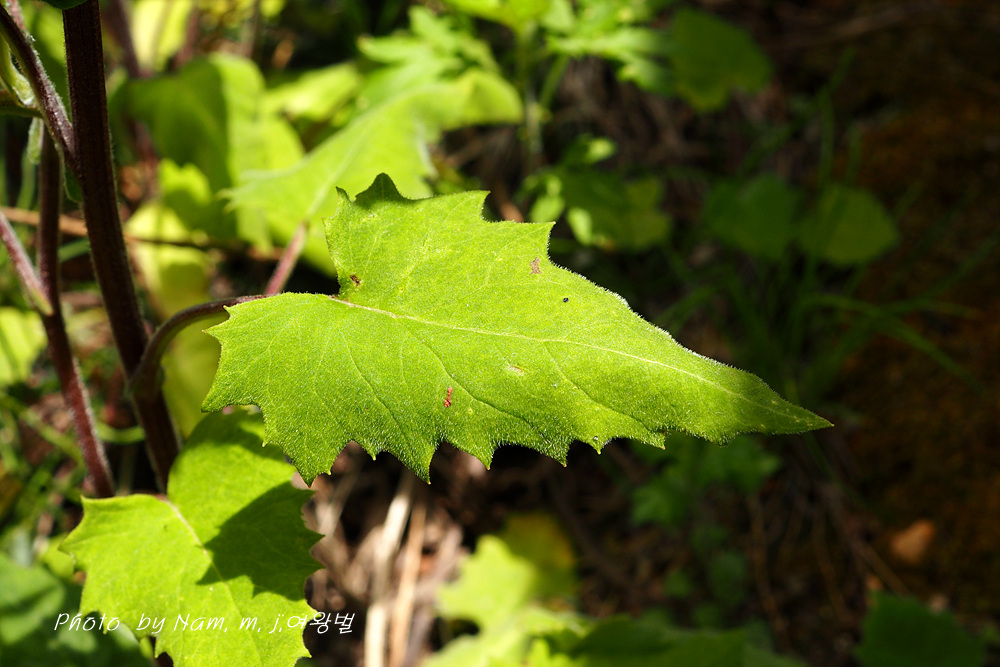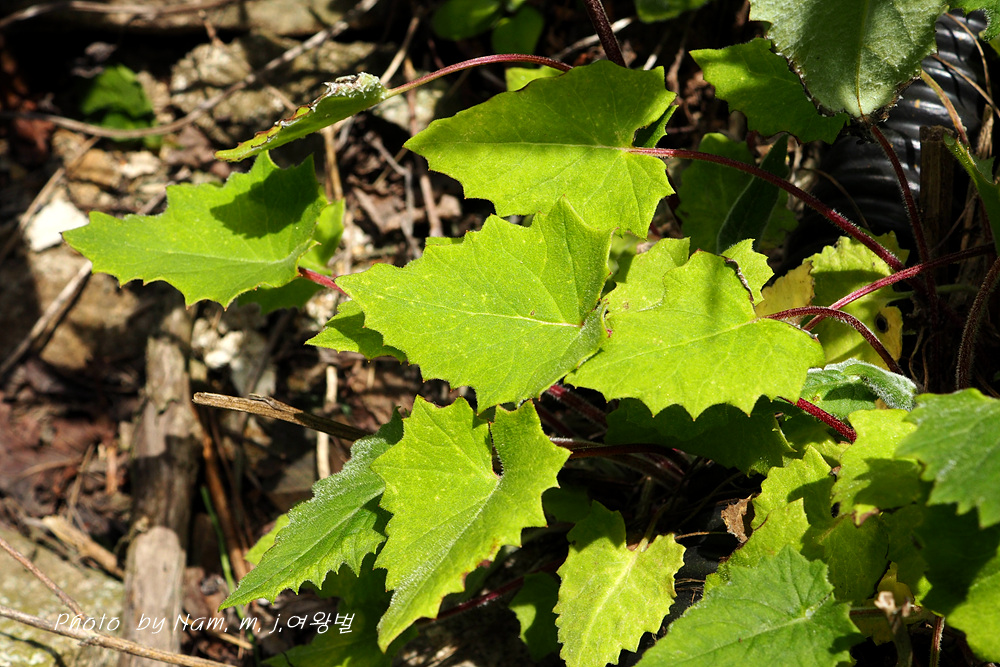 줄기잎은 어긋나며 3각상 심장형으로 끝은 뾰족하며 밑은 다소 심장형이고 표면에는 털이 약간 나고