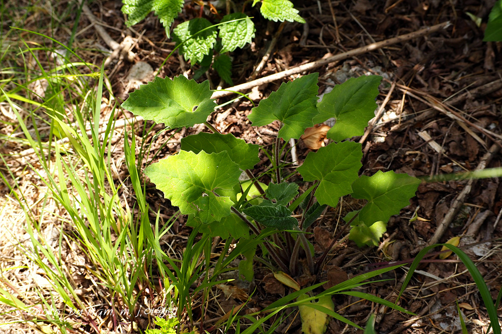 잎자루가 길며 잎몸은 세모꼴 심장 모양이며 꽃이 필 때 쯤 뿌리잎은 없어진다.