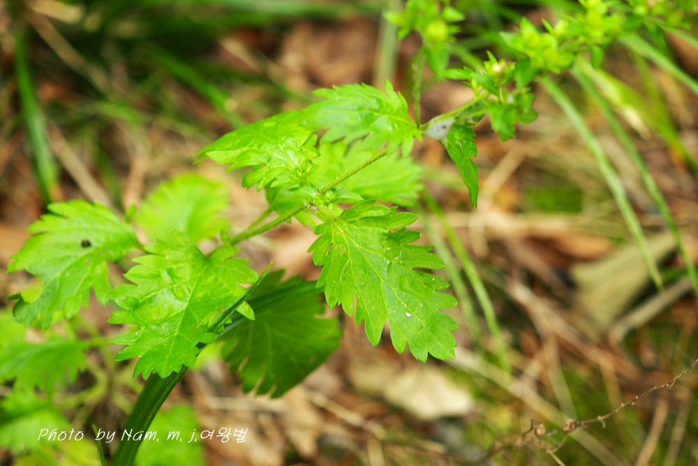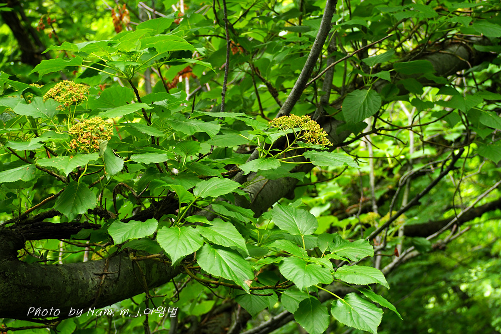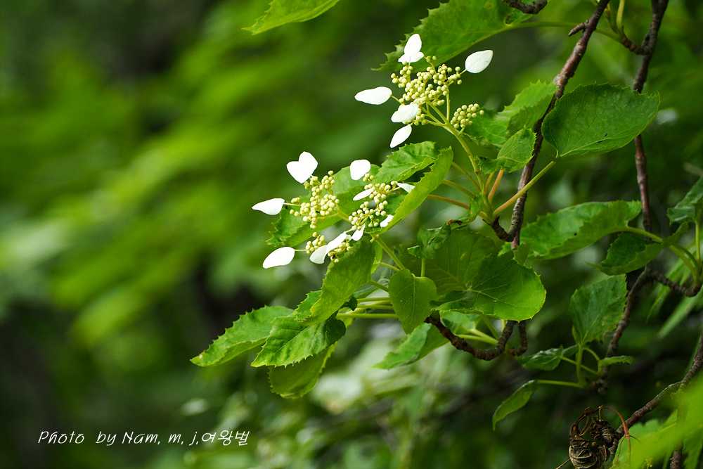 등수국에 비하여 가장자리 헛꽃잎이 1장이고 잎의 거치가 크고 억센 느낌이다