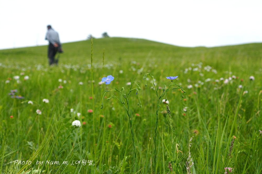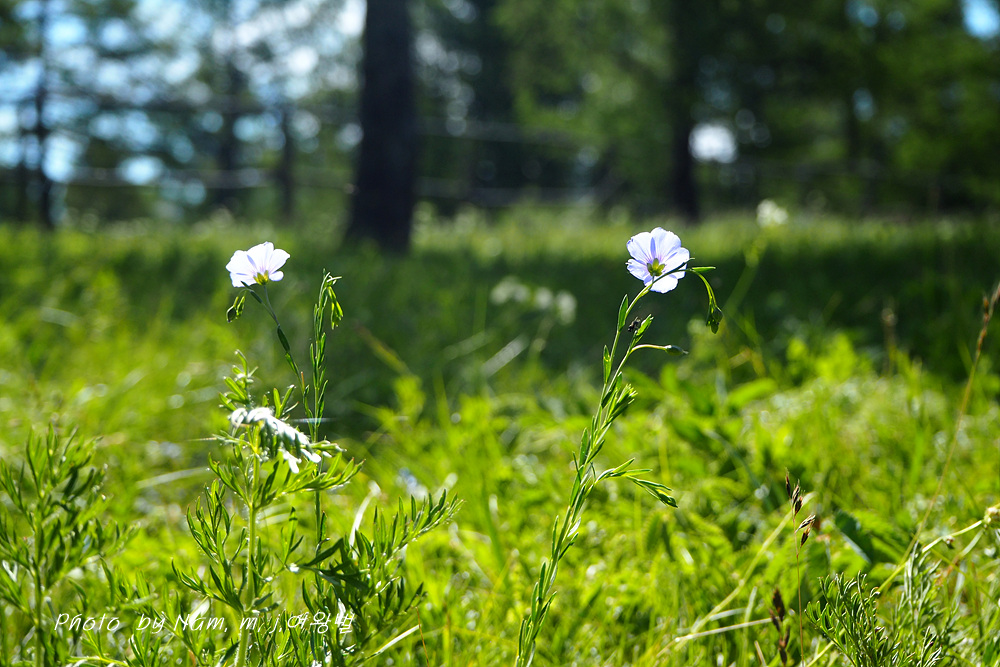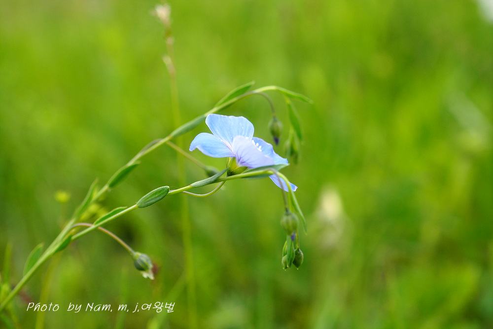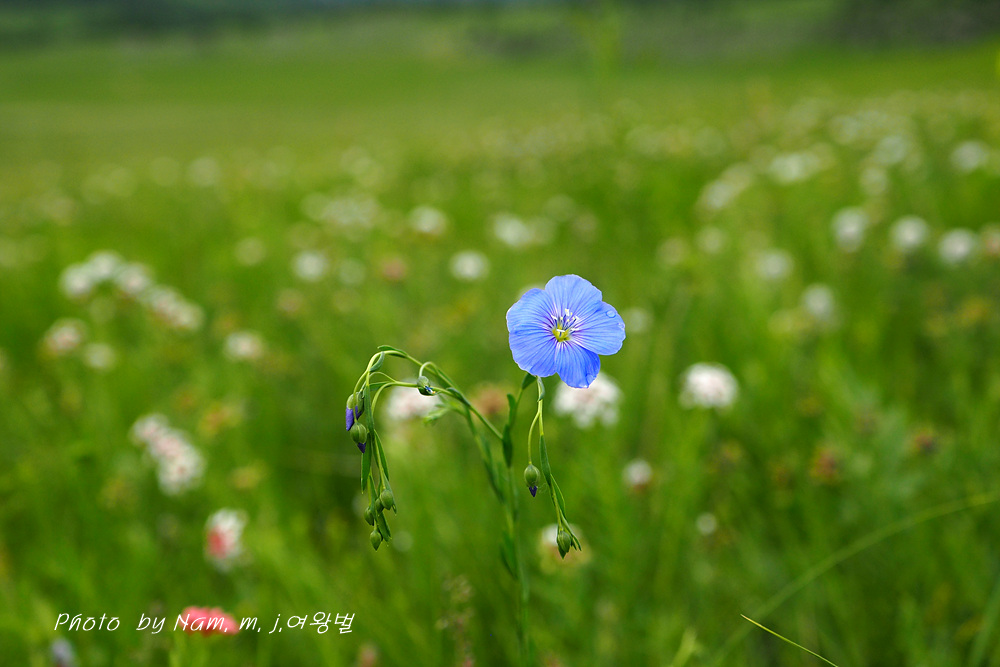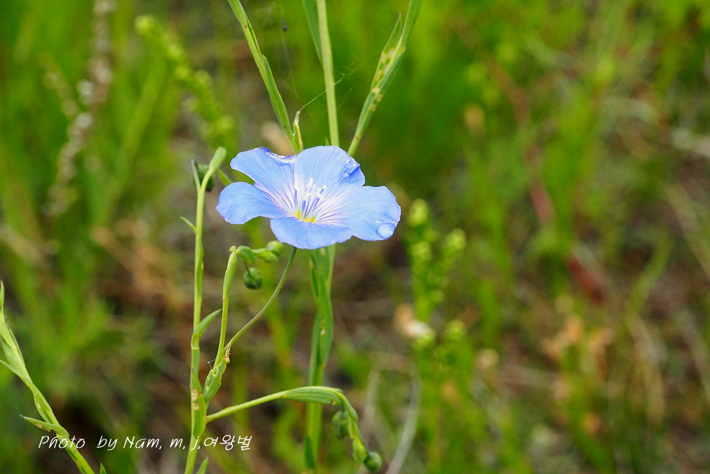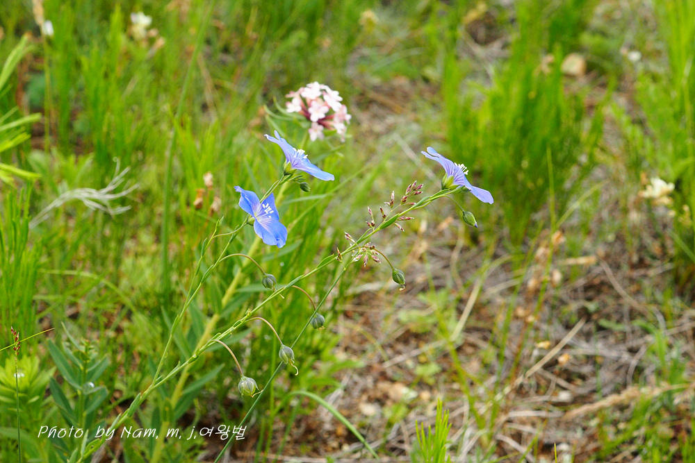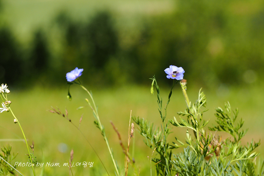피뿌리풀이 깔린 언덕에 구슬처럼 동그란 방울 열매를 단 아마가 파랗게 꽃잎을 펼쳤다.