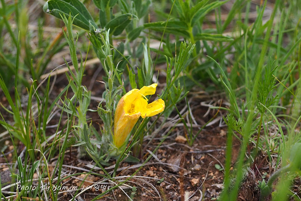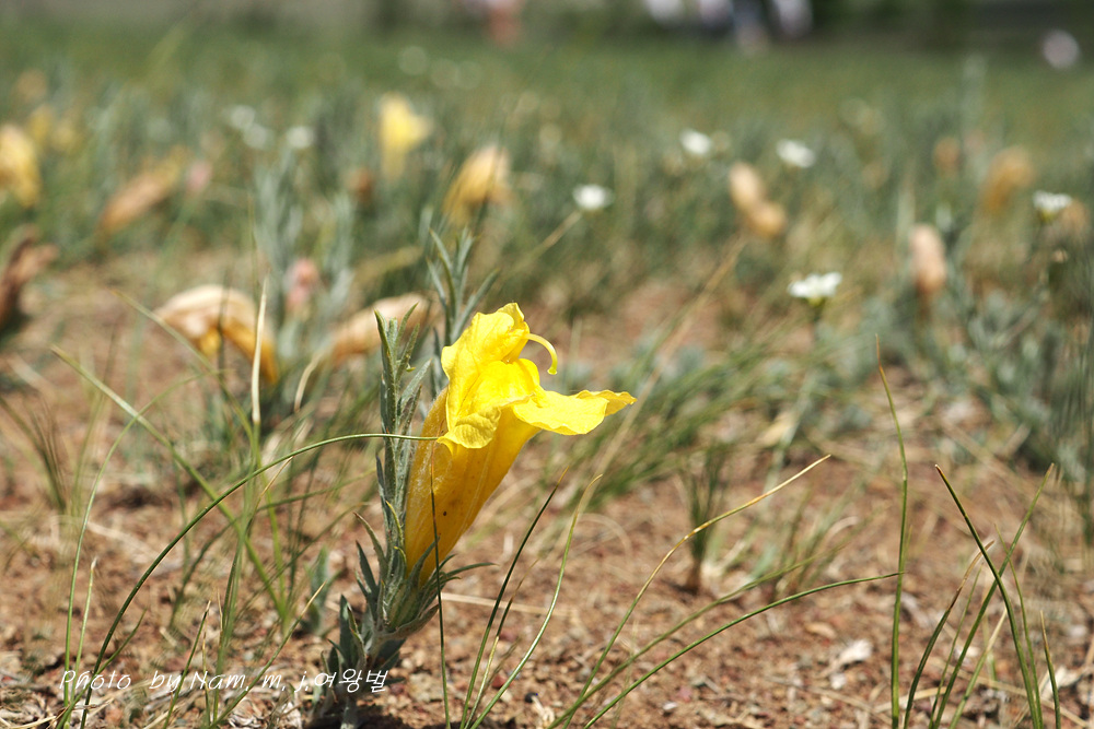 바닥에 앉은뱅이처럼 바짝 붙어서 피어 있는 노란꽃이 신기하다.