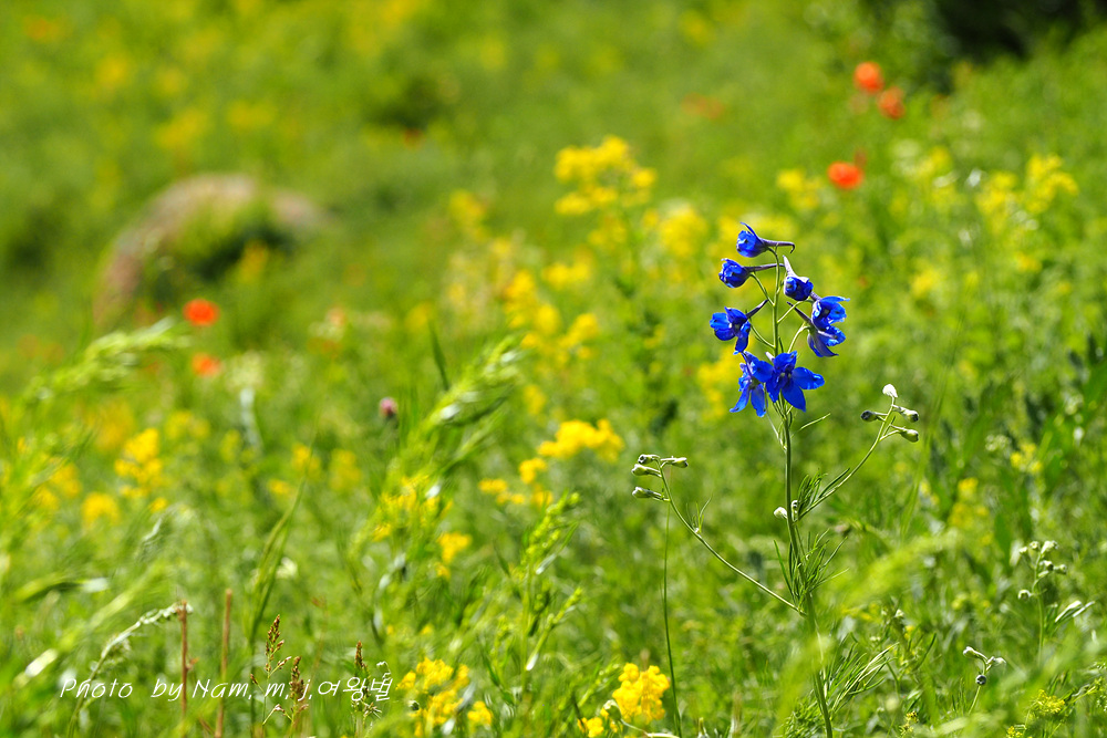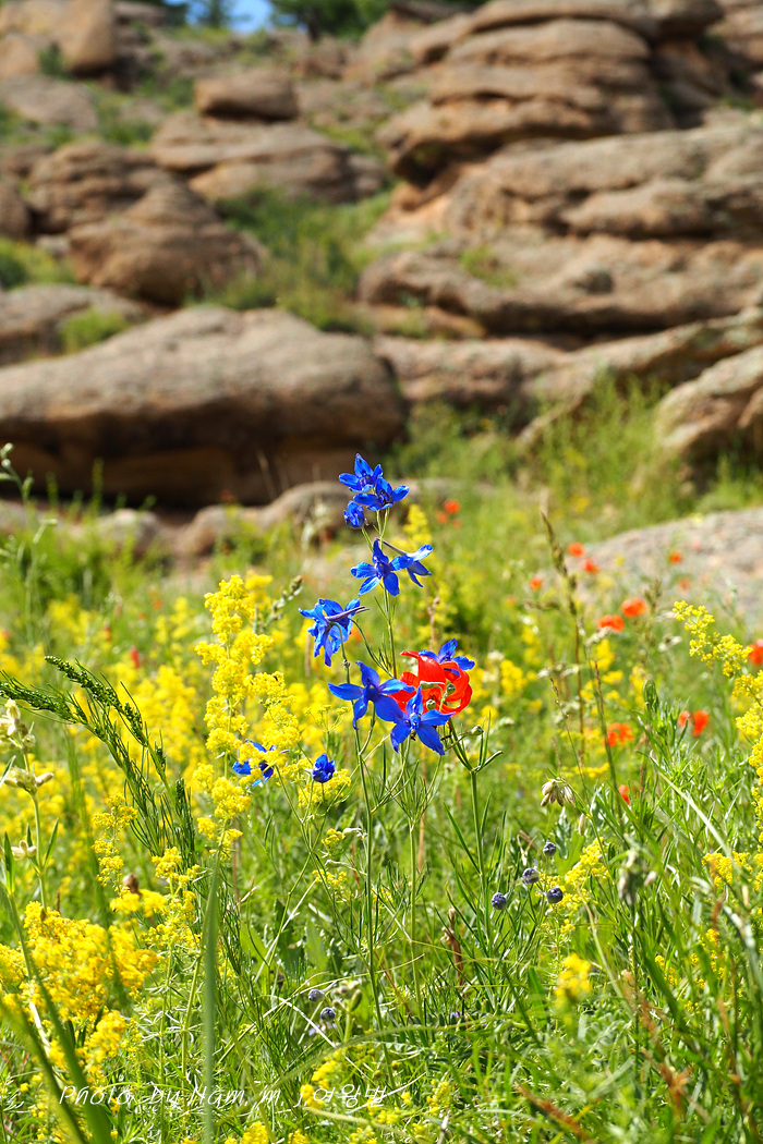 붉은 큰솔나리와 파란 제비고깔이 바위를 배경으로한 초록의 초지에 어울려 있는 모습이 그림 같다.
