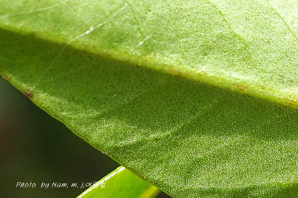 양 끝이 좁으며 가장자리는 밋밋하고, 양면에 샘점이 있다.