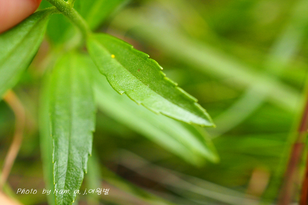 끝은 뾰족하고, 밑은 좁아져서 잎자루처럼 되며, 가장자리에 뾰족한 톱니가 있다.