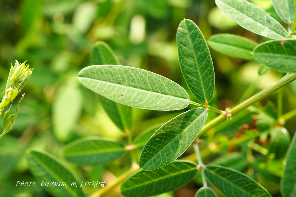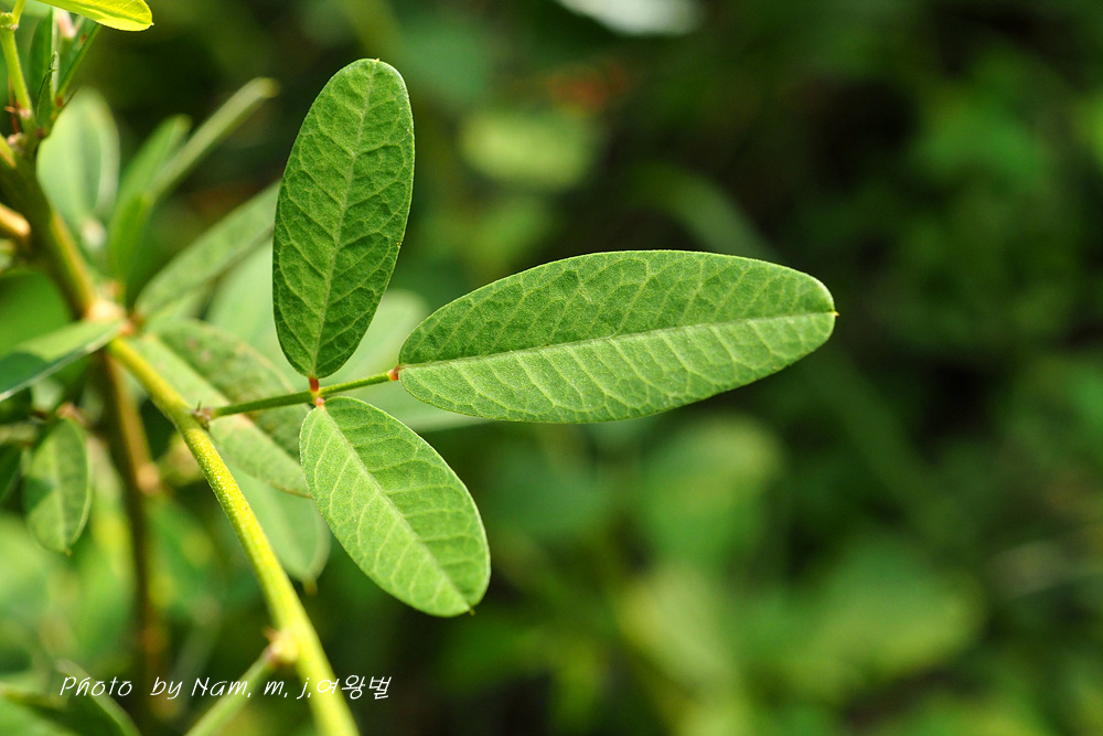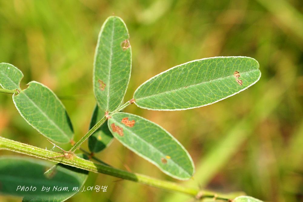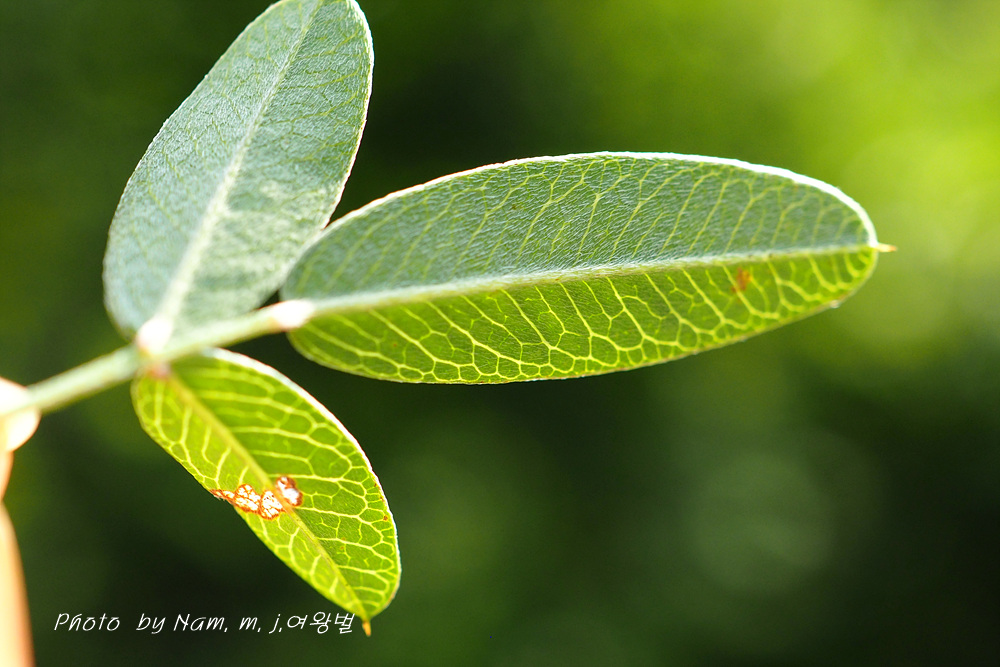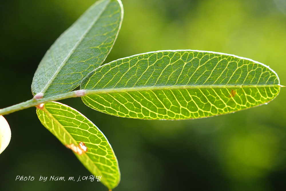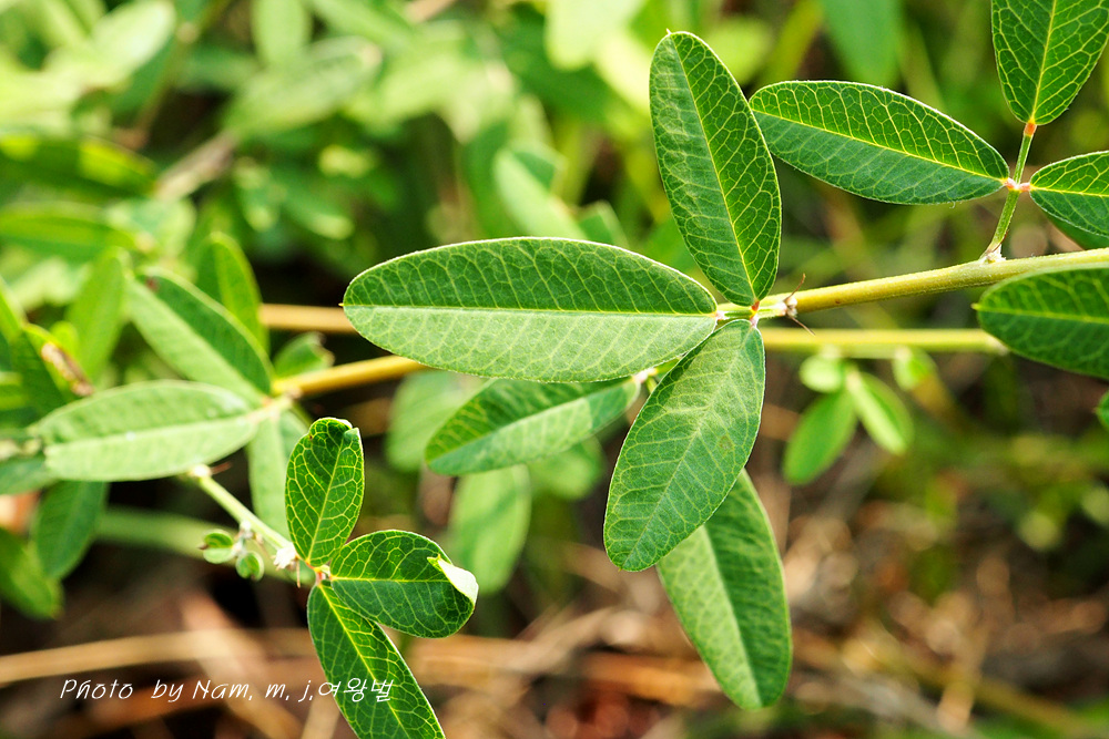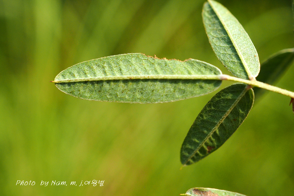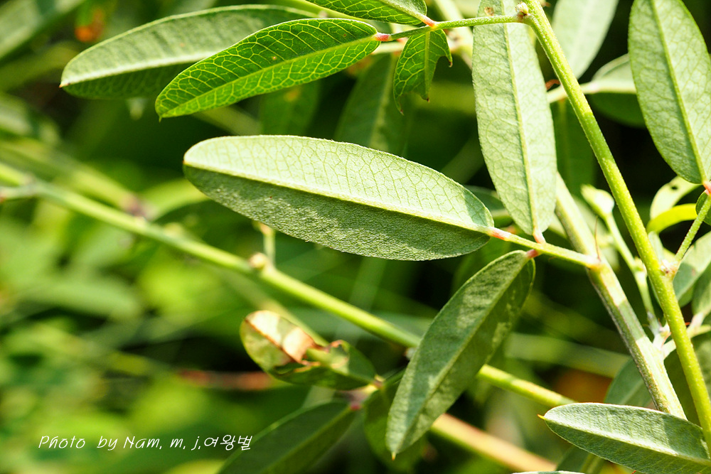 길이 1.5~4.0cm, 너비 5~10mm 잎자루 10-20mm 선상 긴타원형, 비수리보다 잎이 넓고 측맥 사이 그물맥 뚜렷하다 |