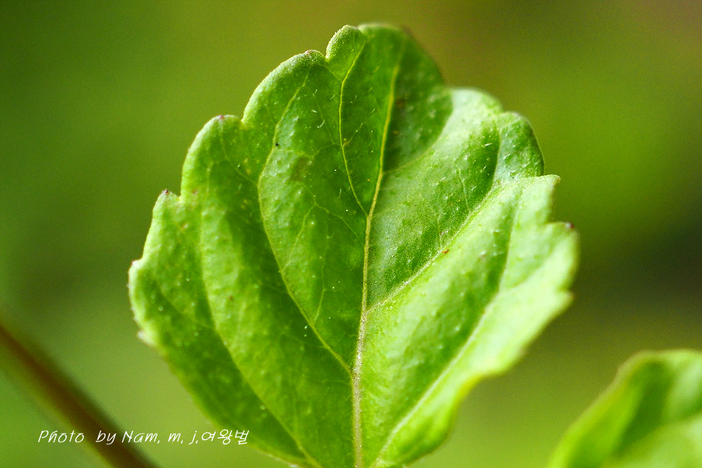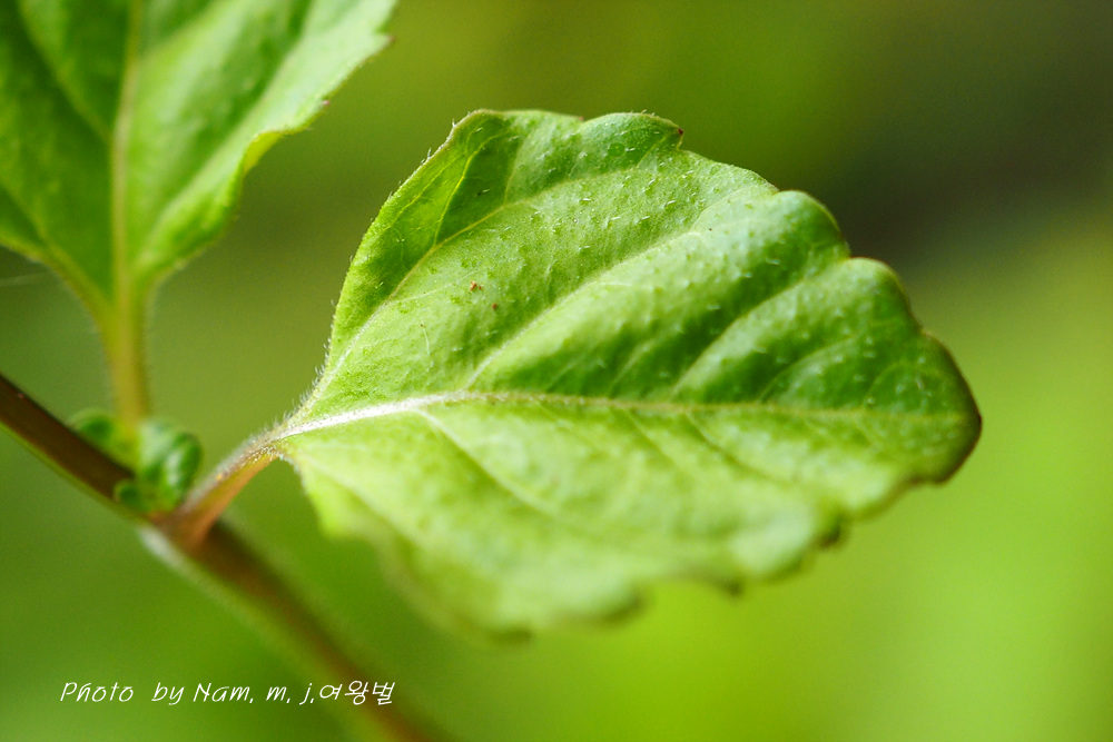 마주나는 잎은 거의 원형, 또는 넓은 난형으로 끝이 둔하고 양면에 털이 거의 없다.