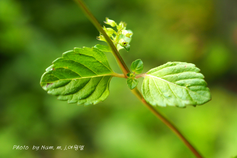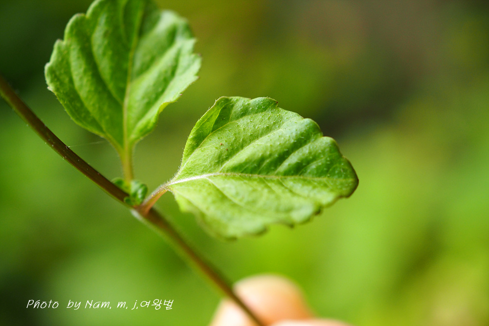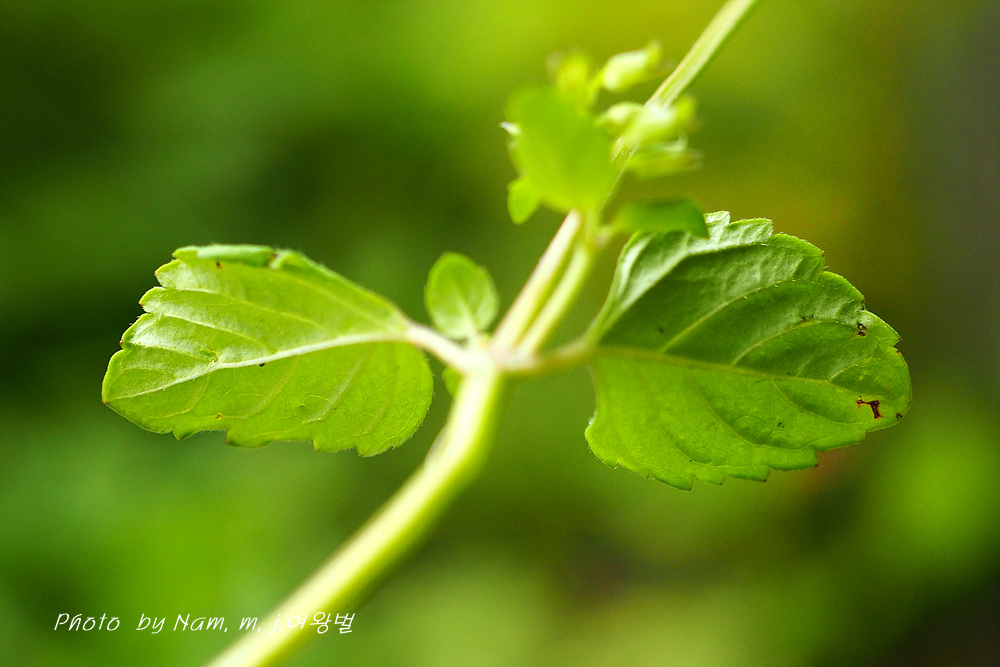 잎은 마주나며, 난형 또는 넓은 난형으로 길이 1~3cm, 폭 0.8~2cm,