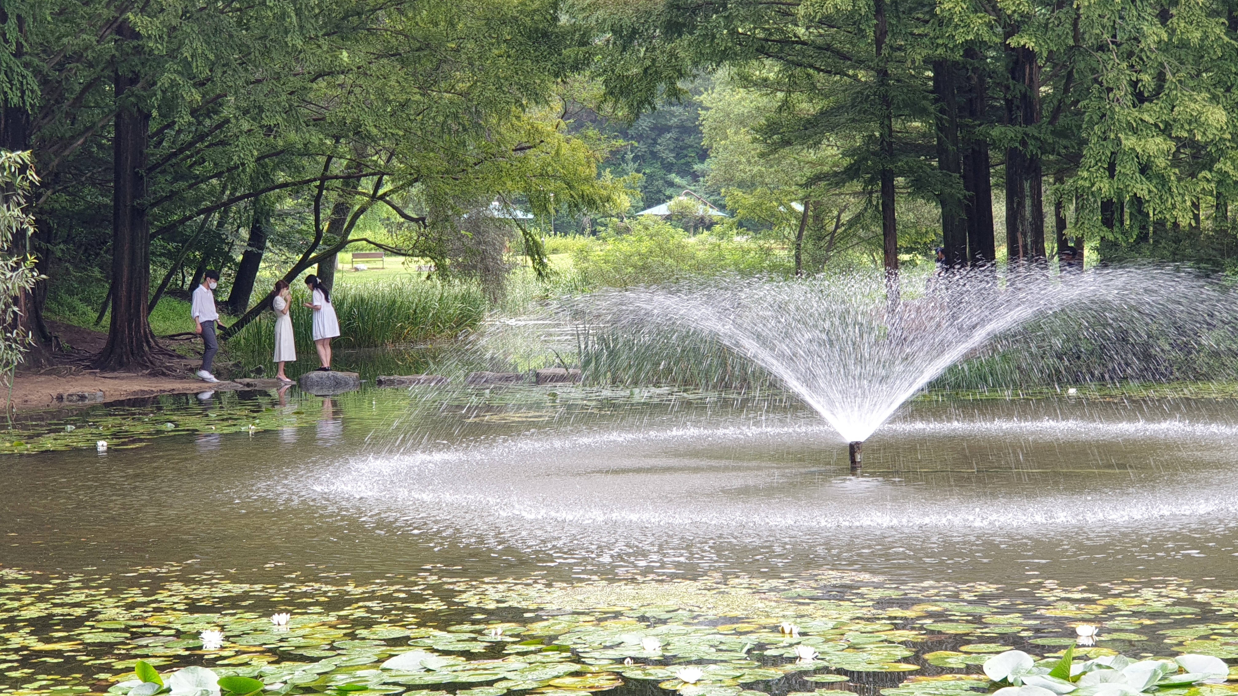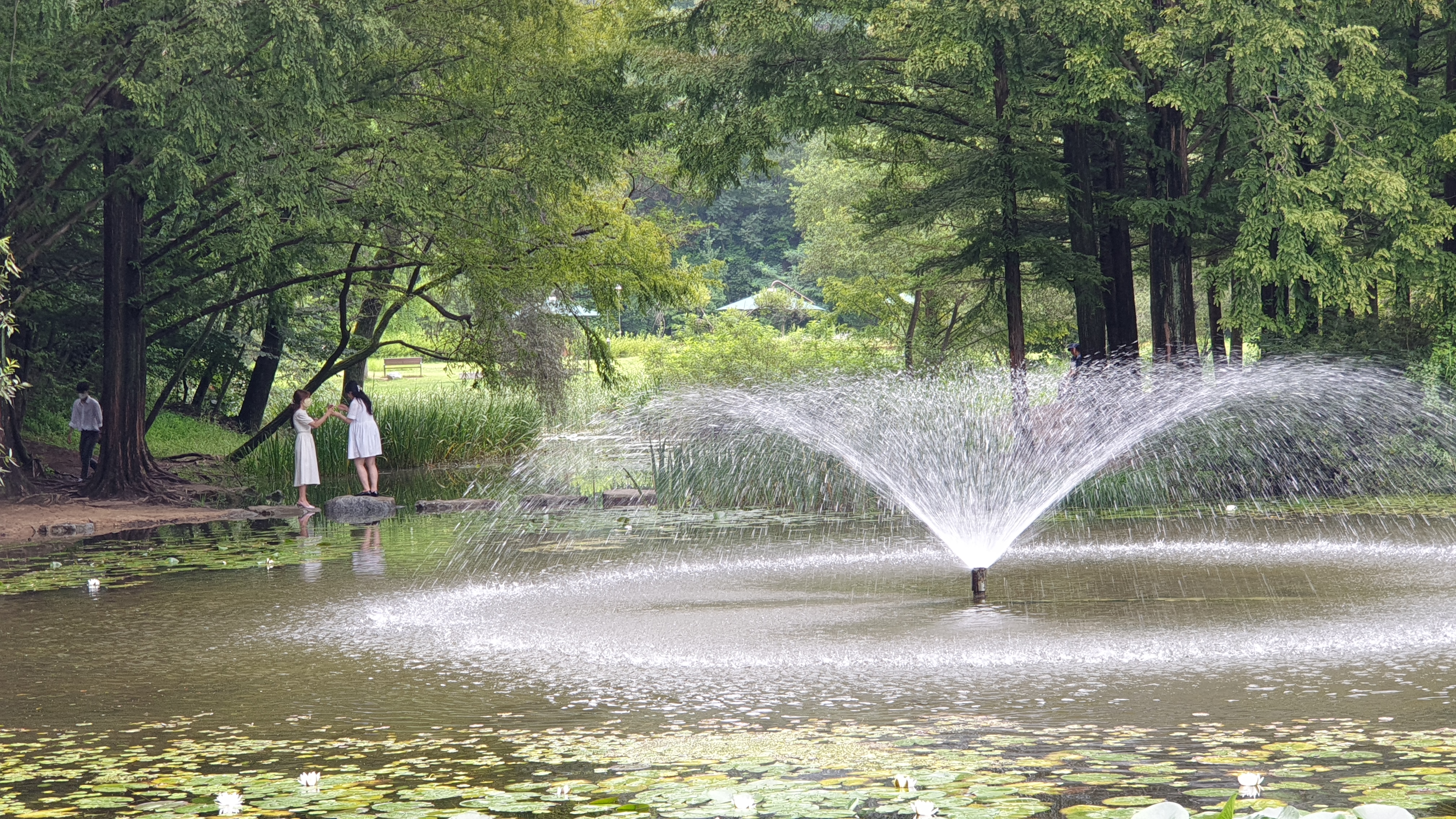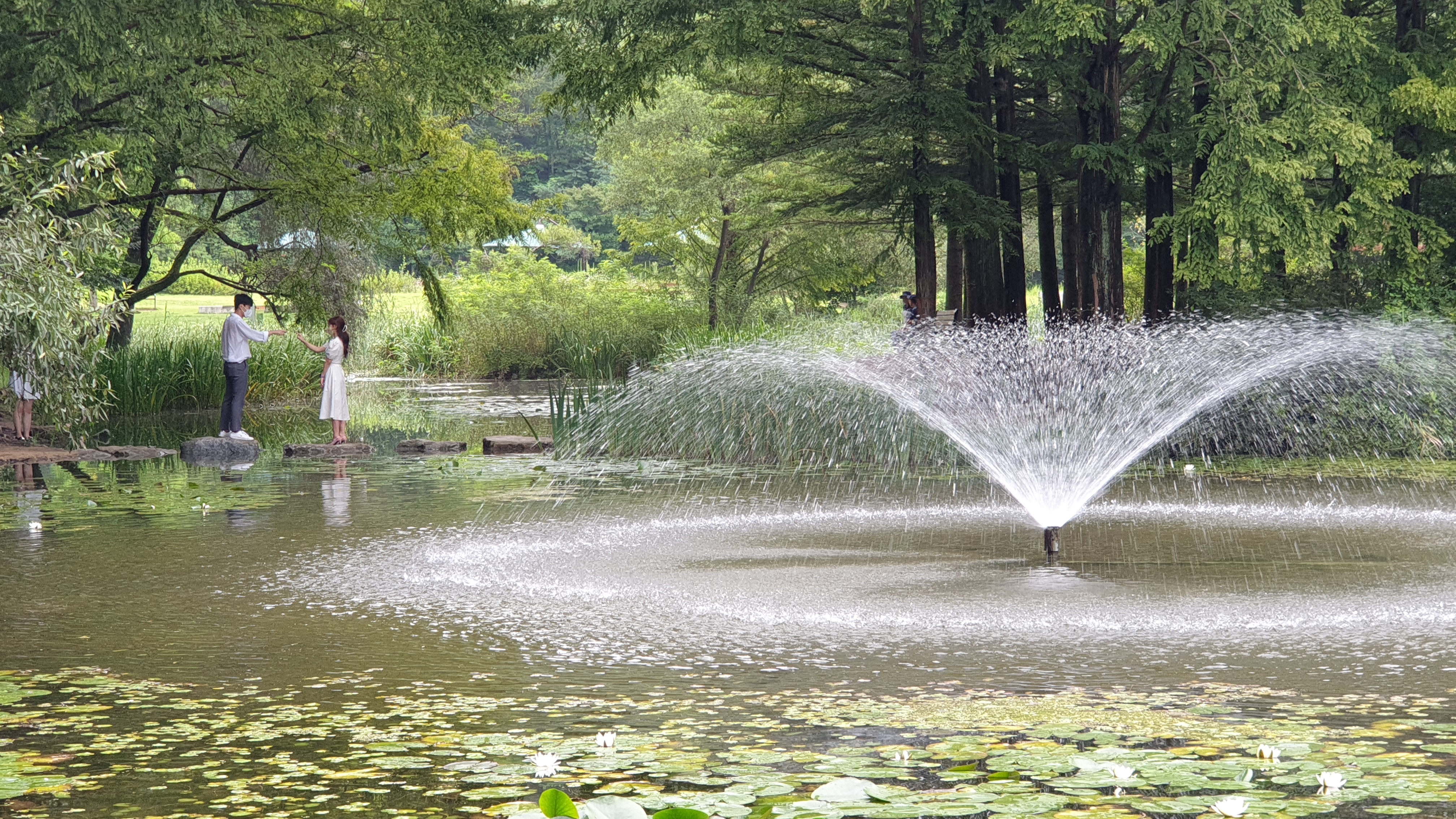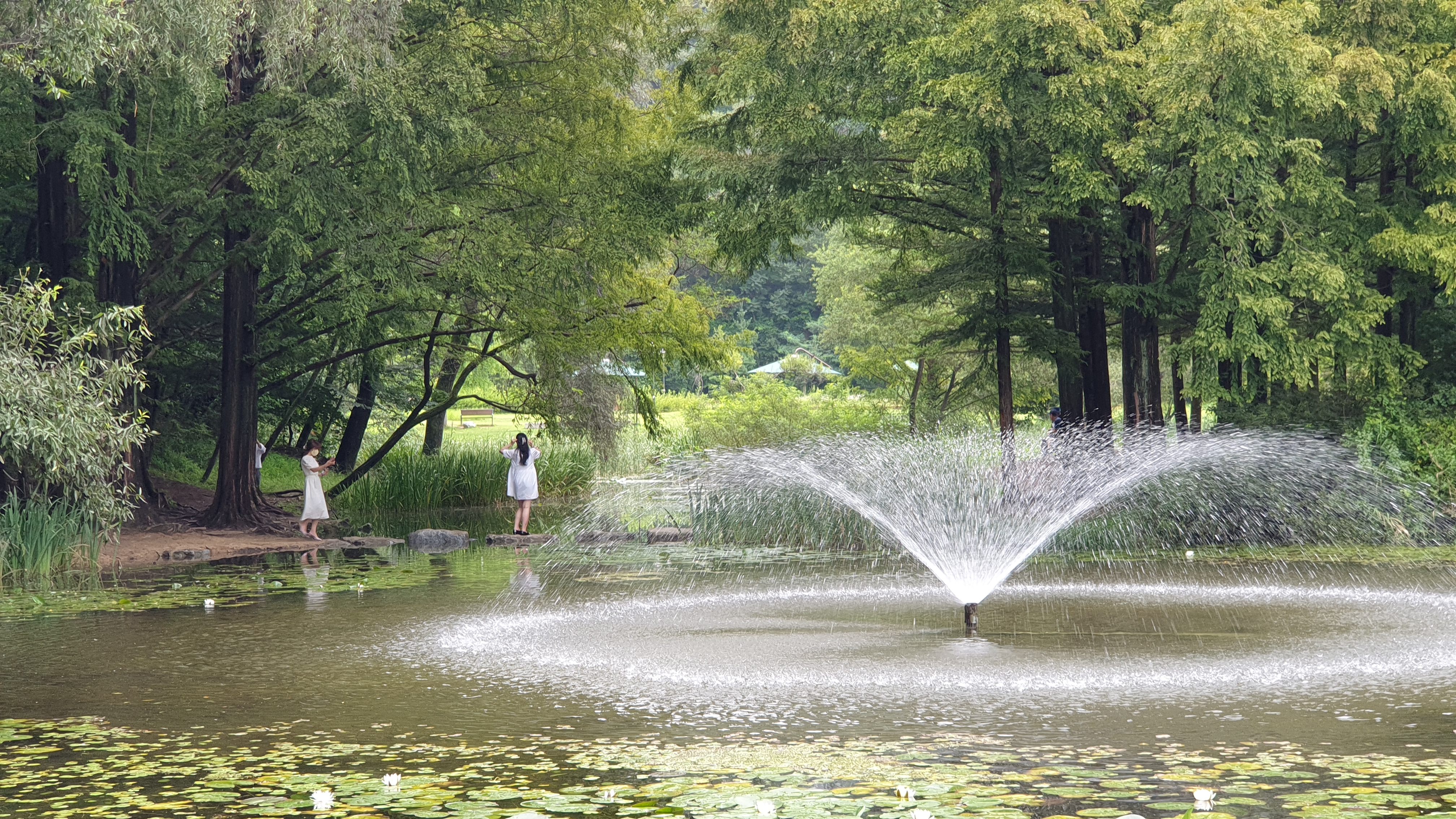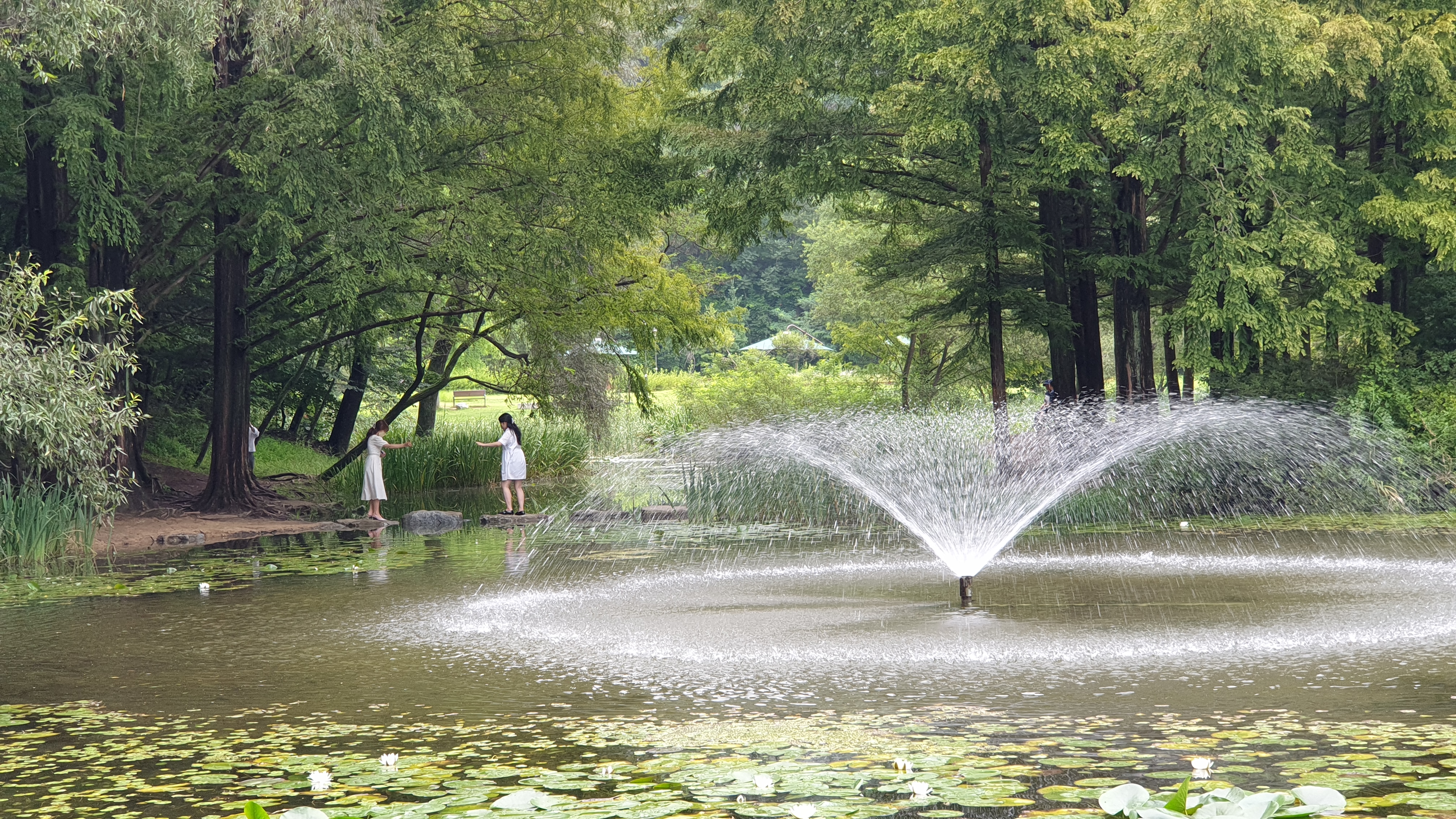 메타세쿼이아 숲이 품고 있는 작은 연못과 징검다리. 작은 분수가 어우러져서 이국적인 풍광을 만들어 내는데