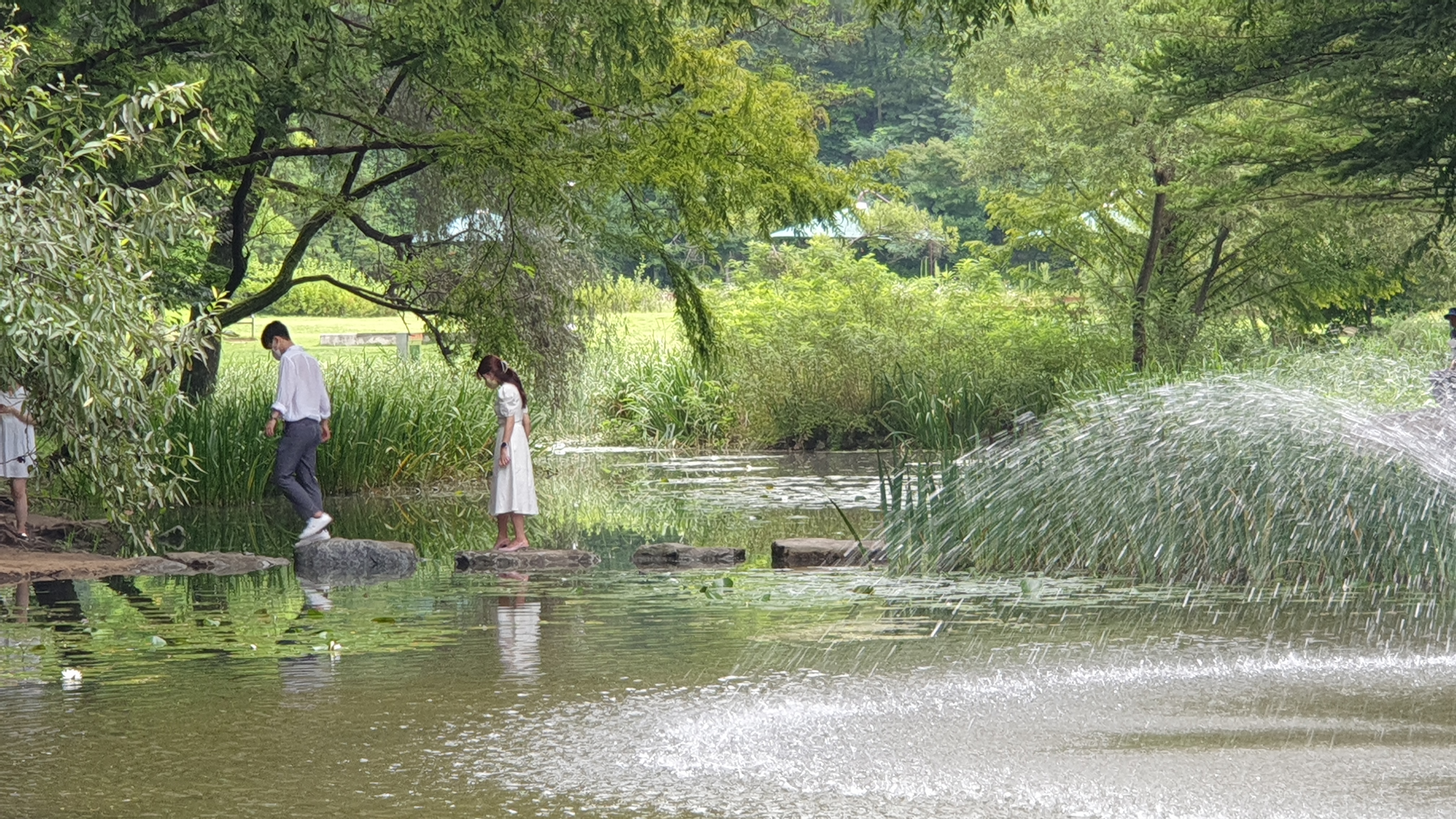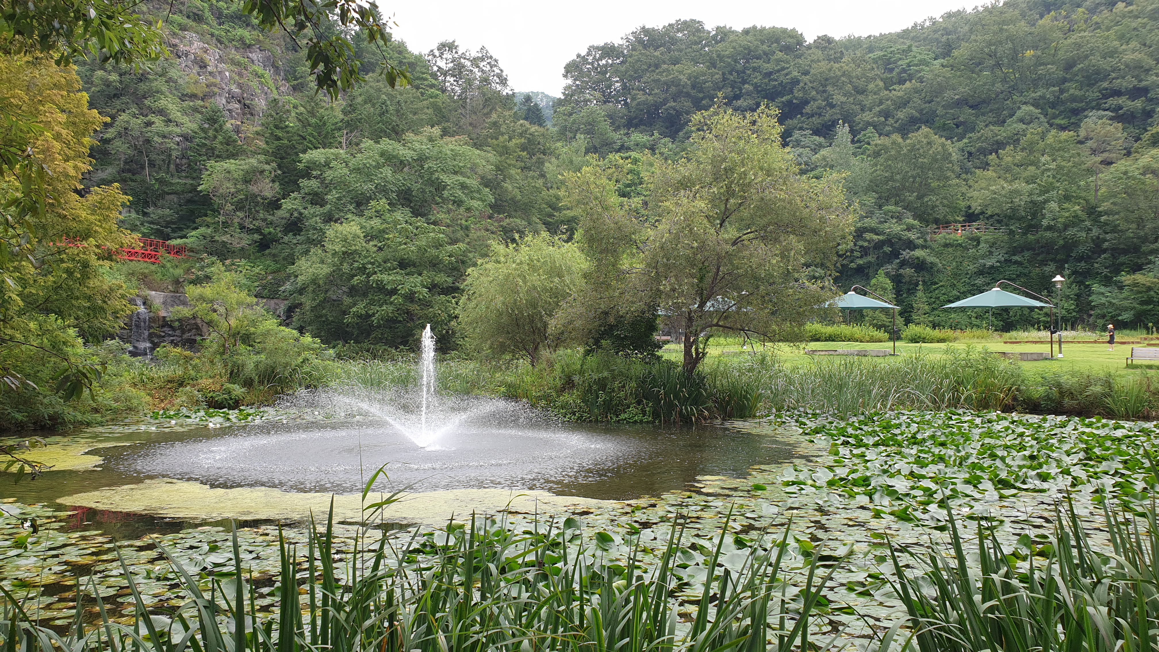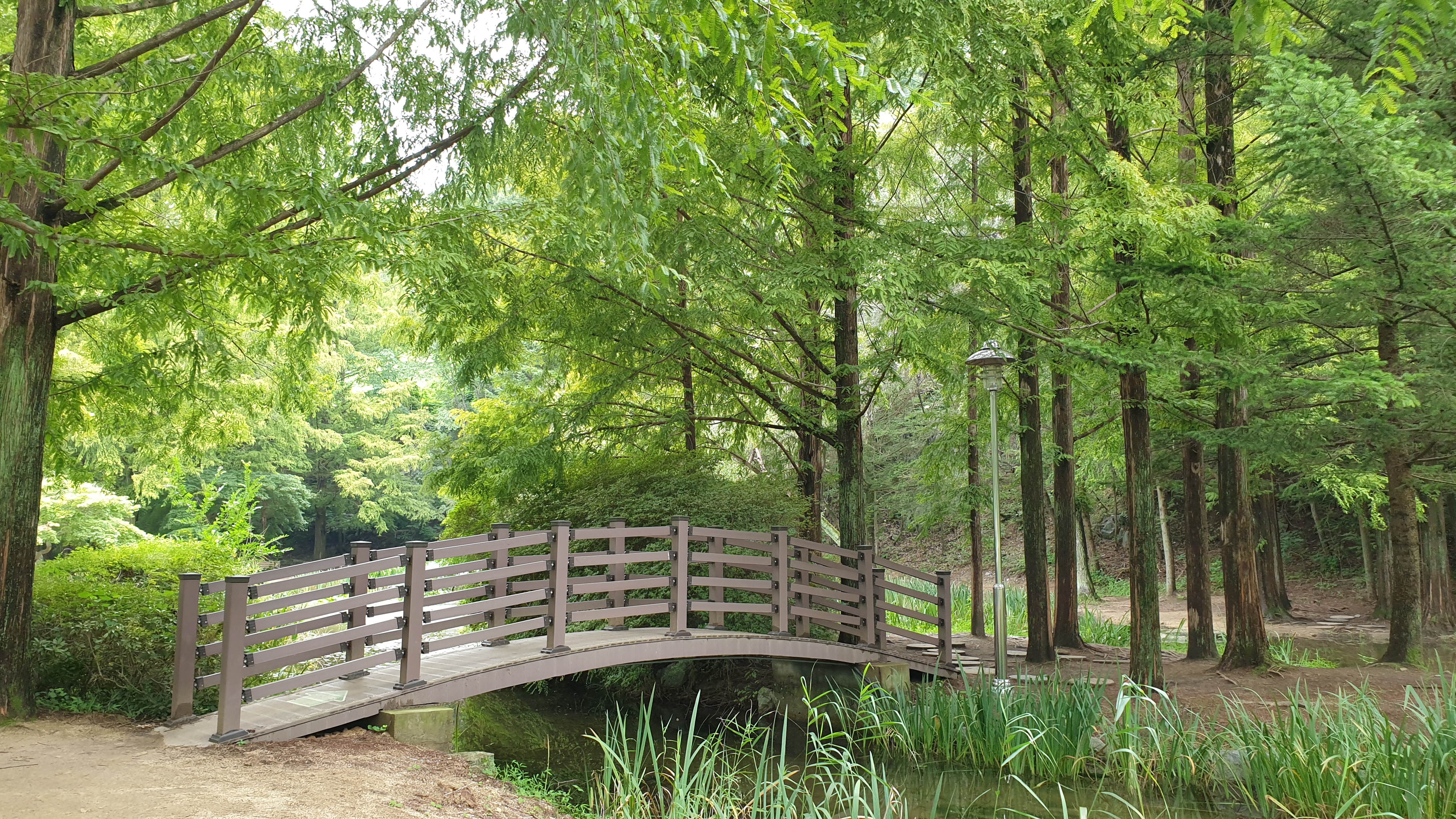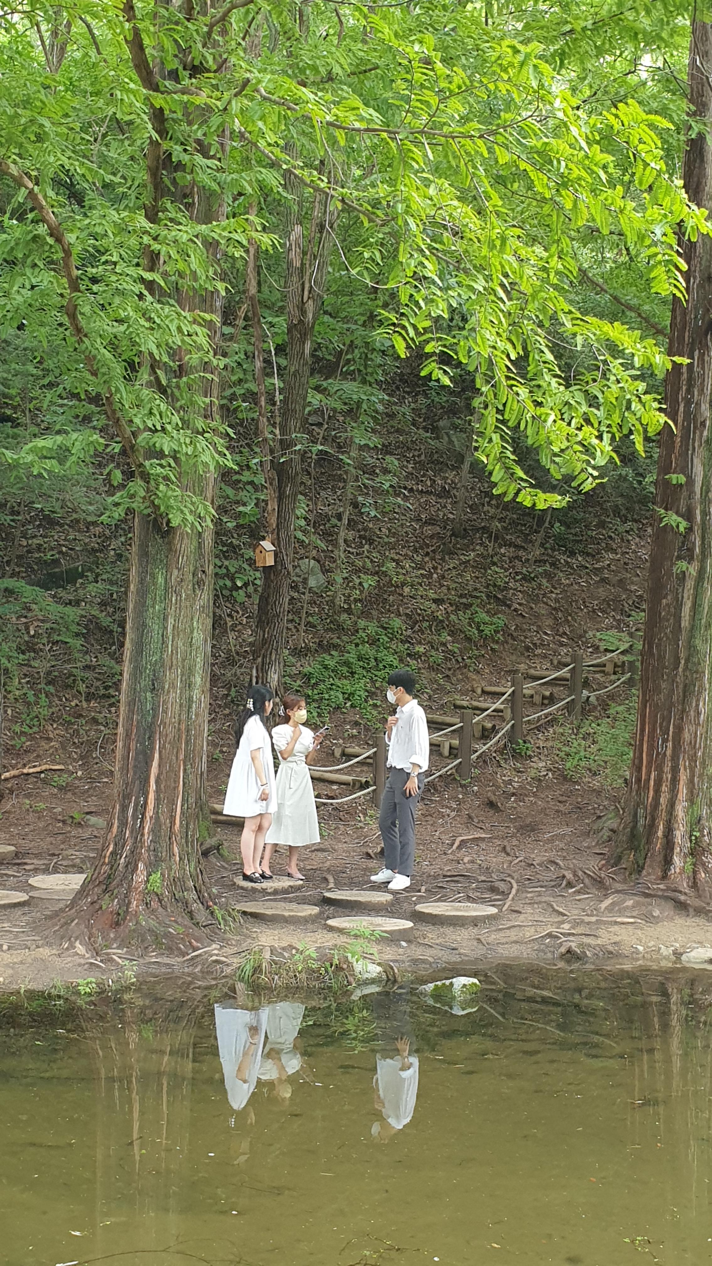 메타세쿼이아 숲이 품고 있는 작은 연못과 징검다리. 작은 분수가 어우러져서 이국적인 풍광을 만들어 내는데