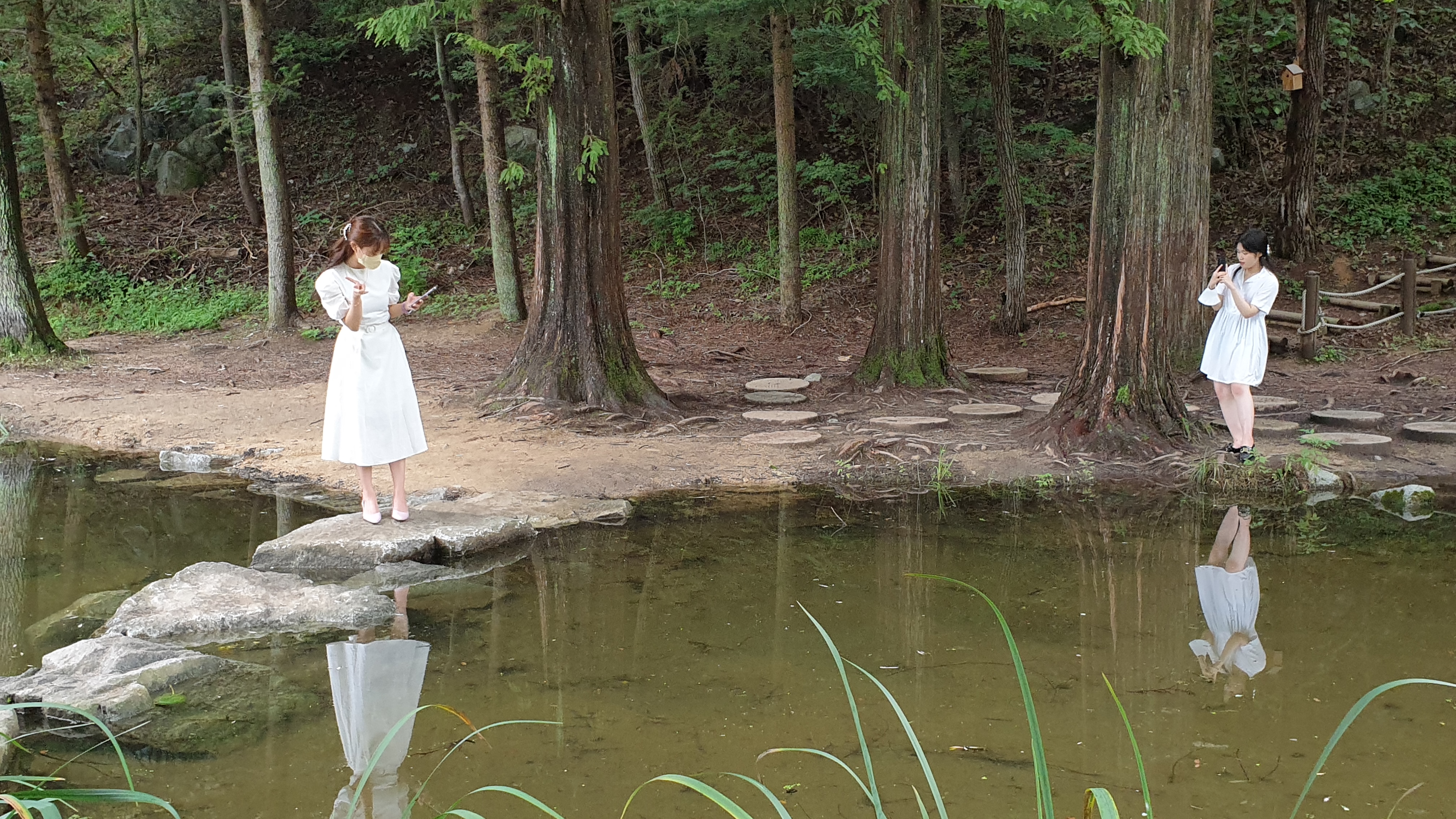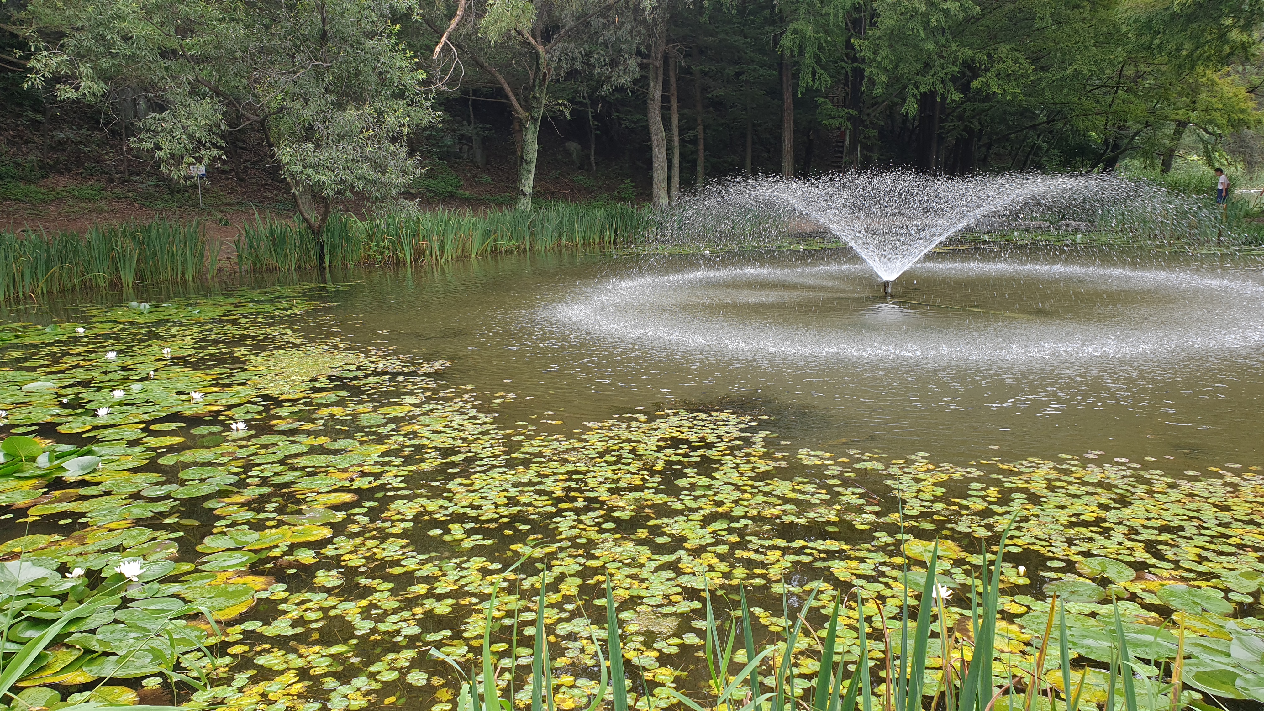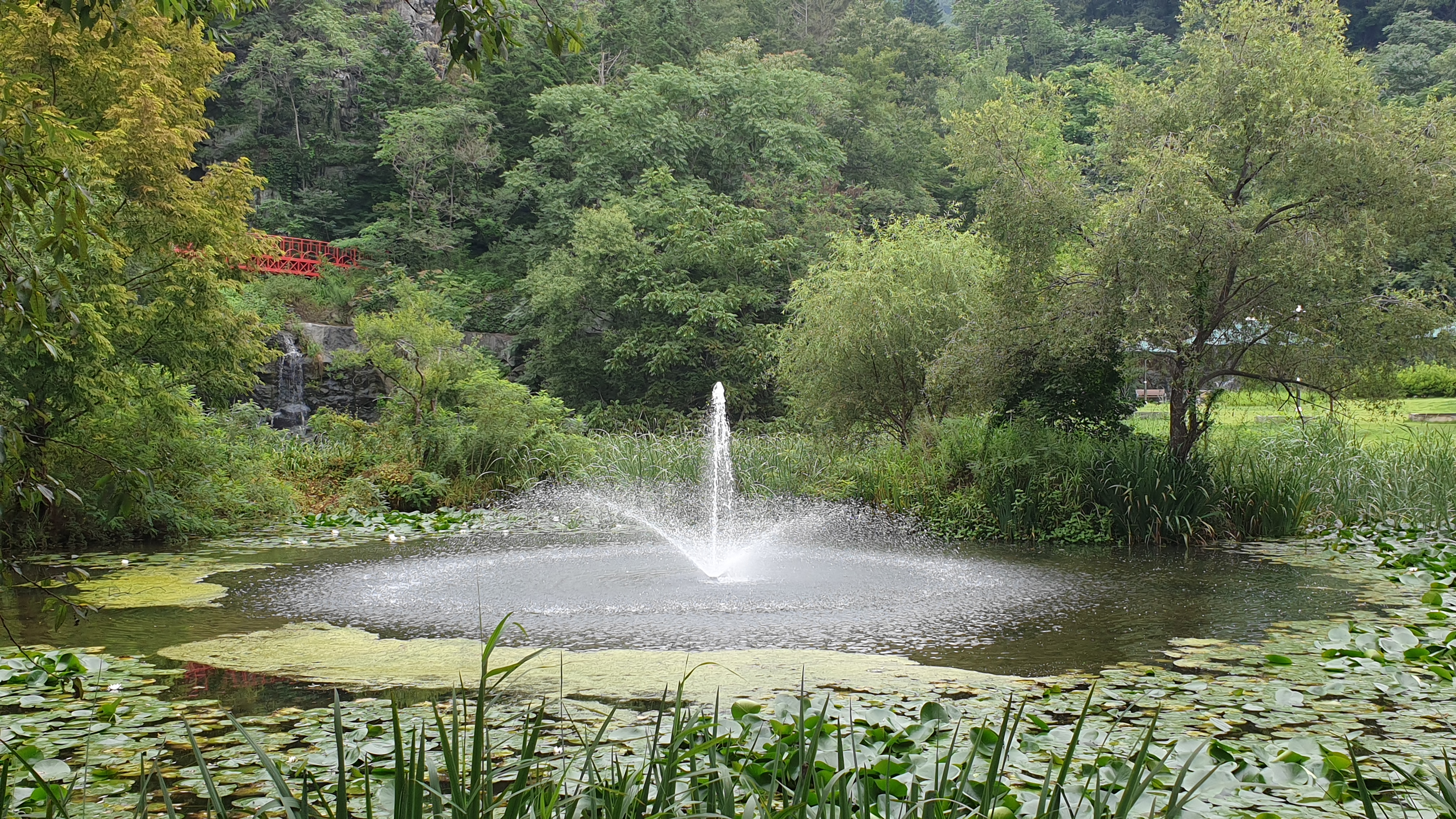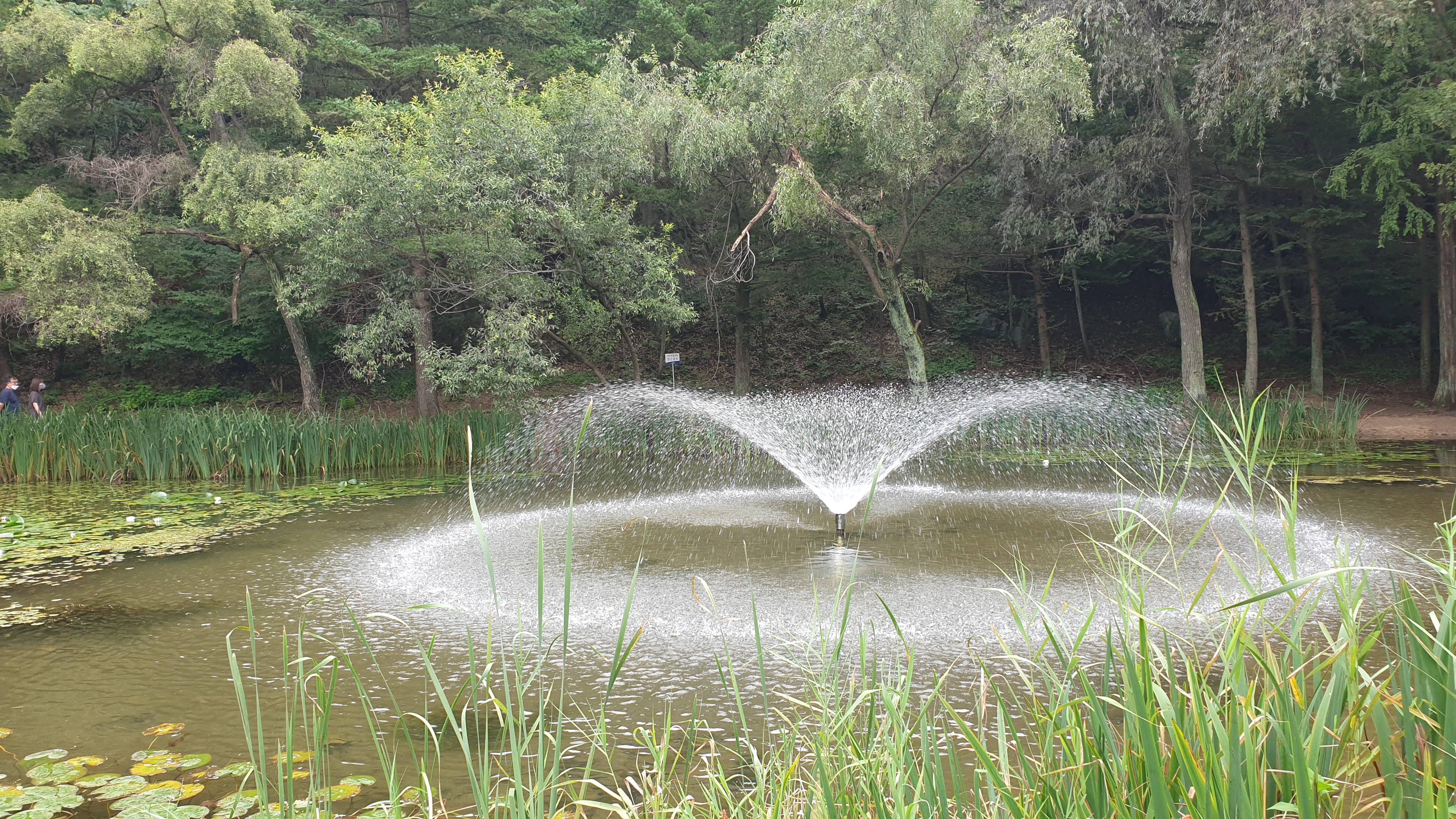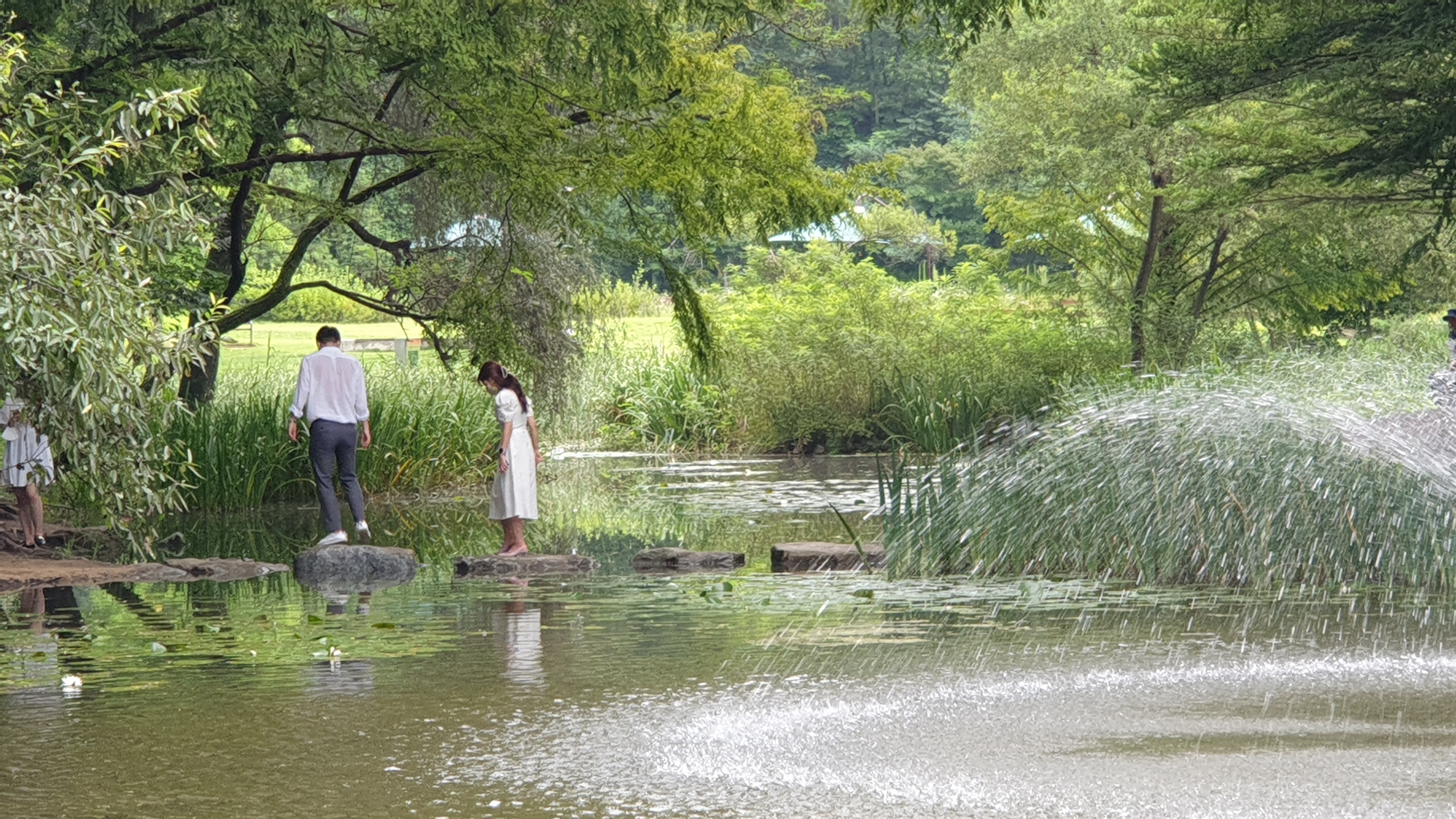 메타세쿼이아 숲이 품고 있는 작은 연못과 징검다리. 작은 분수가 어우러져서 이국적인 풍광을 만들어 내는데
