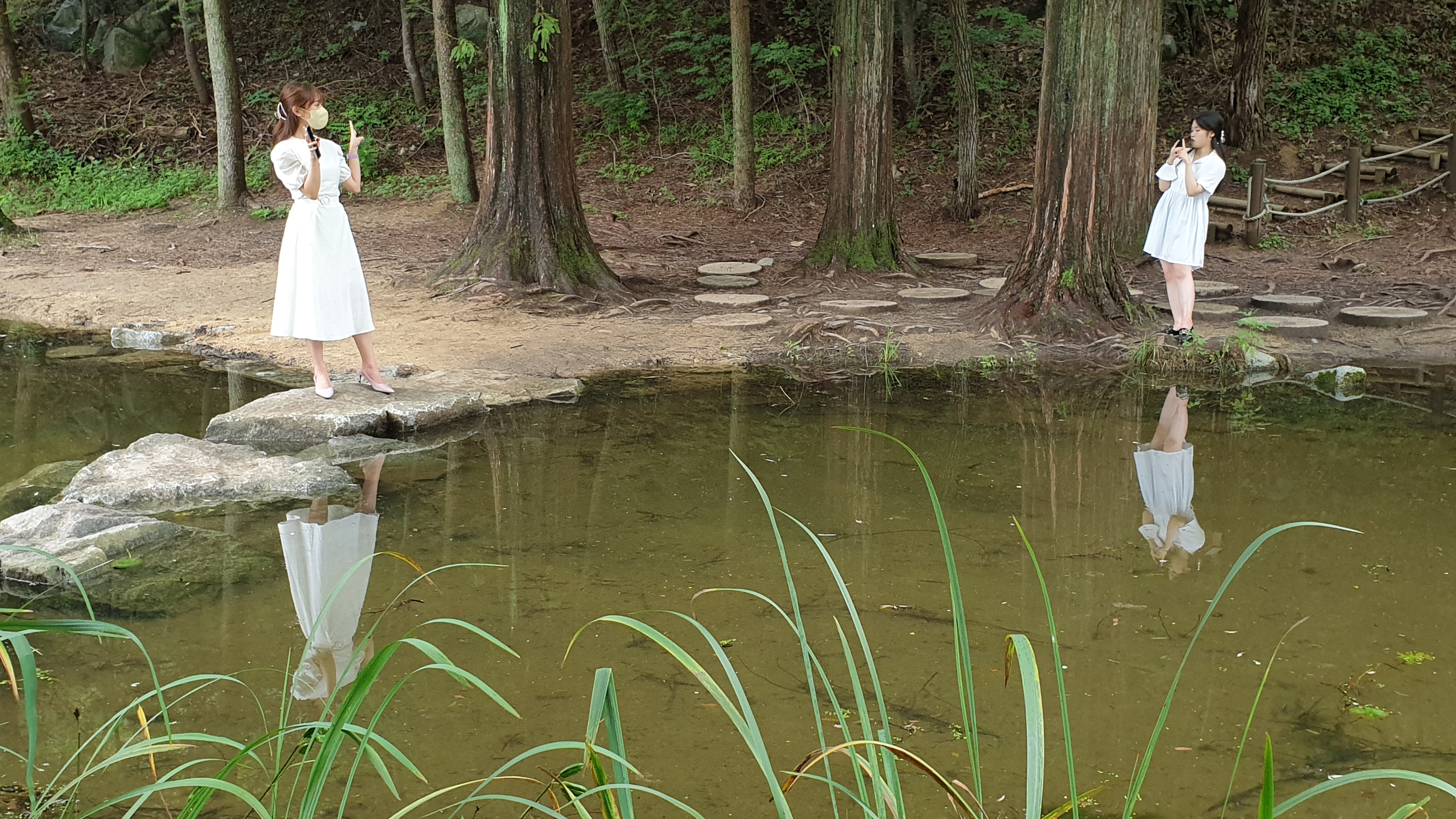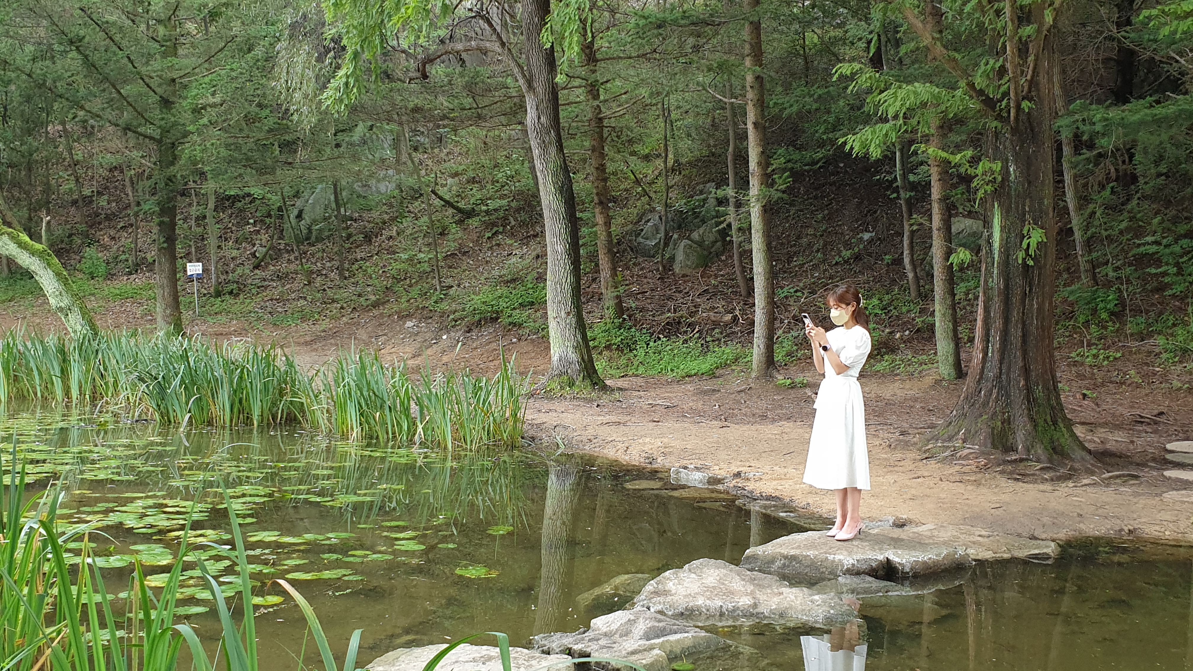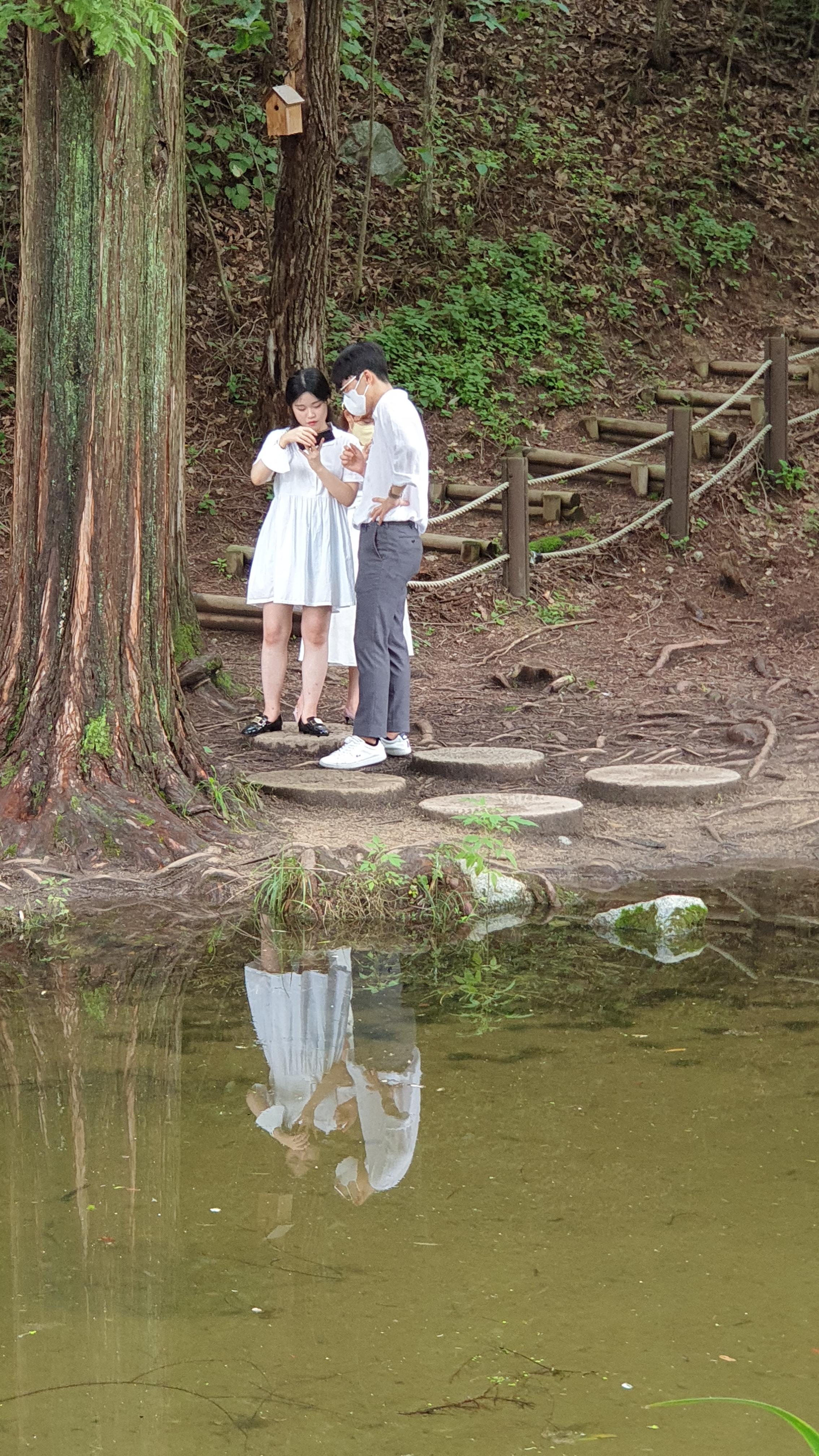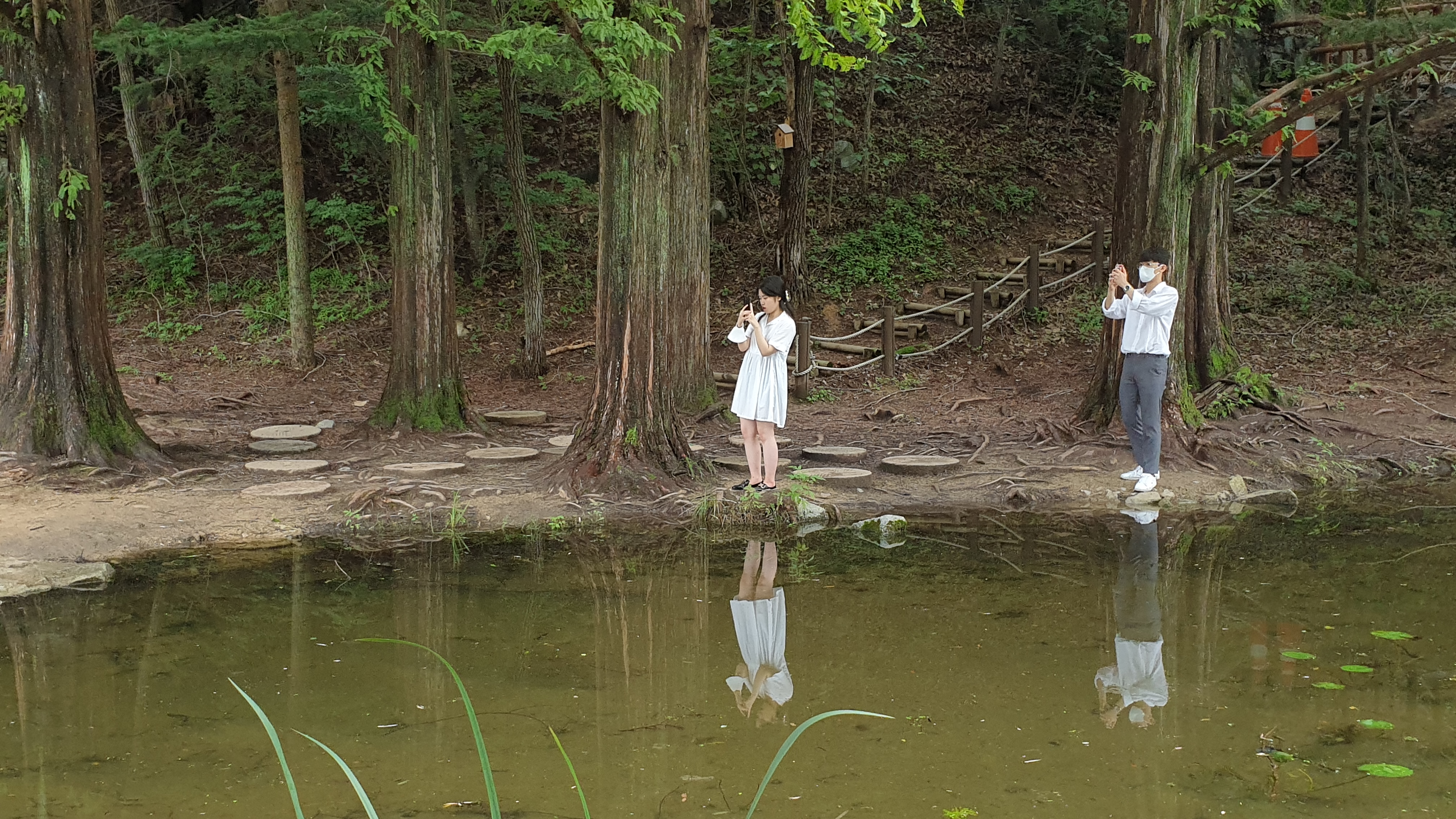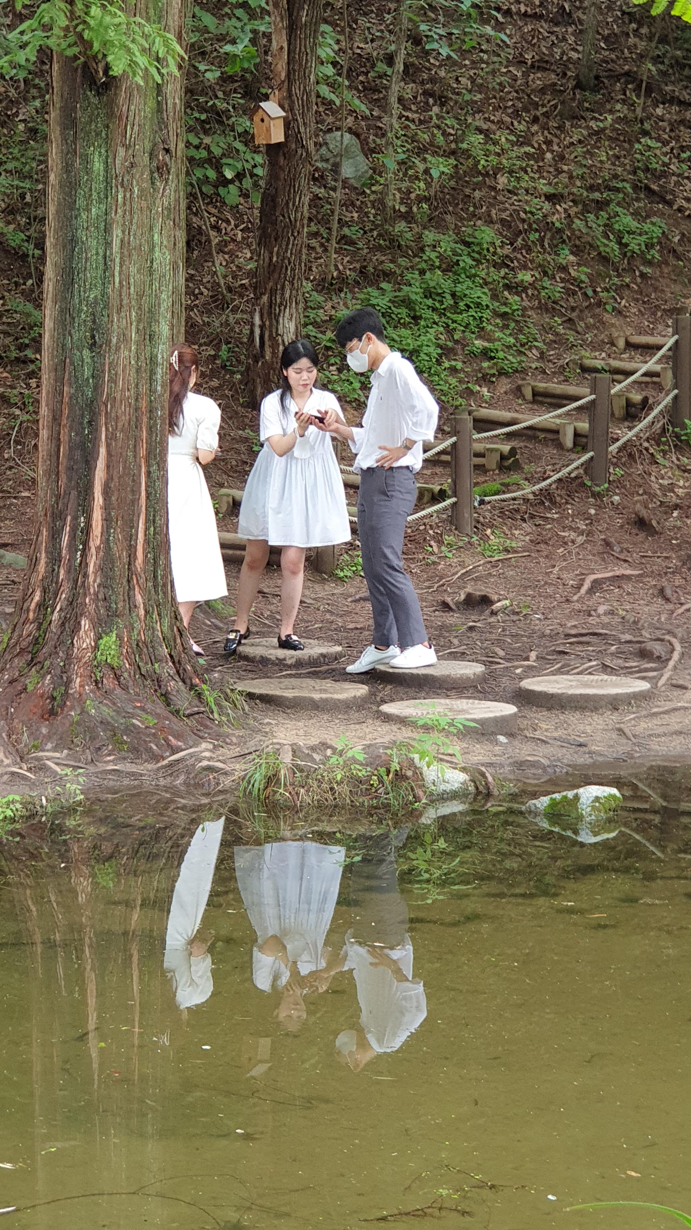 메타세쿼이아 숲이 품고 있는 작은 연못과 징검다리. 작은 분수가 어우러져서 이국적인 풍광을 만들어 내는데