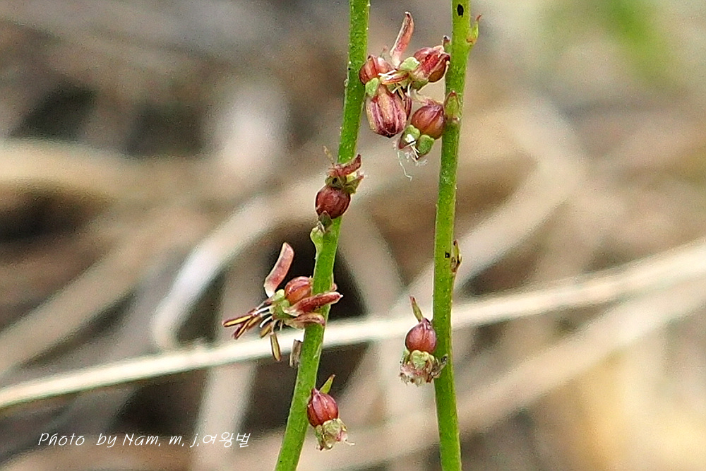 먼지처럼 달려 있는 꽃은 꽃은 직립하여 발달하다가 아래를 향하고, 4수성으로, 웅예선숙한다.