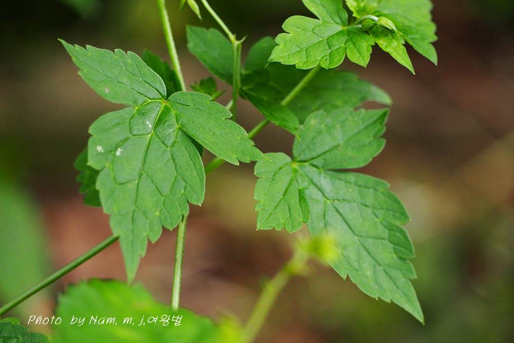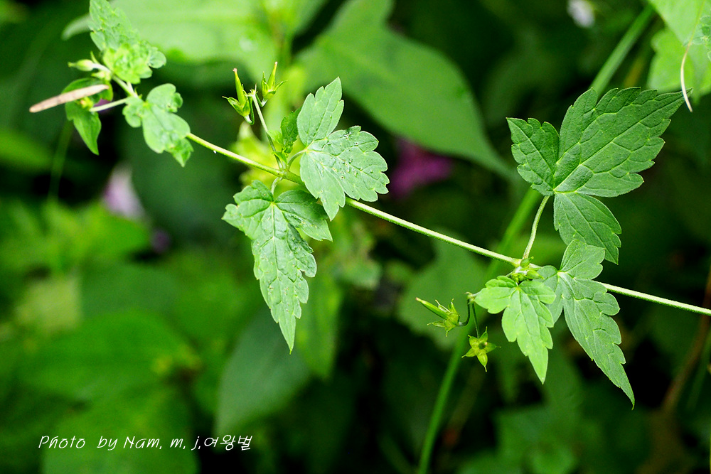 잎은 마주나며, 5갈래로 갈라지는 아래쪽 잎을 제외한 잎은 3갈래로 깊게 갈라지고, 가장자리에 불규칙한 톱니가 있다.