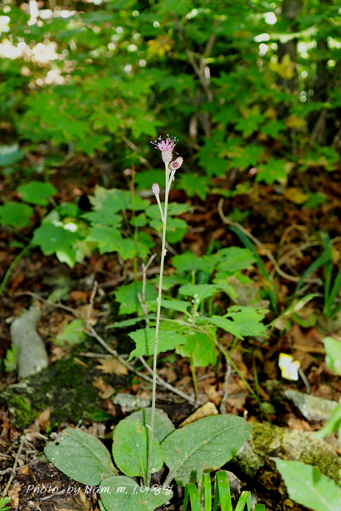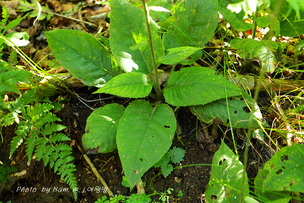 뿌리잎은 끝이 뾰족하고 양면에 백색 털로 덮여 있고 가장자리에 잔 톱니가 있다.