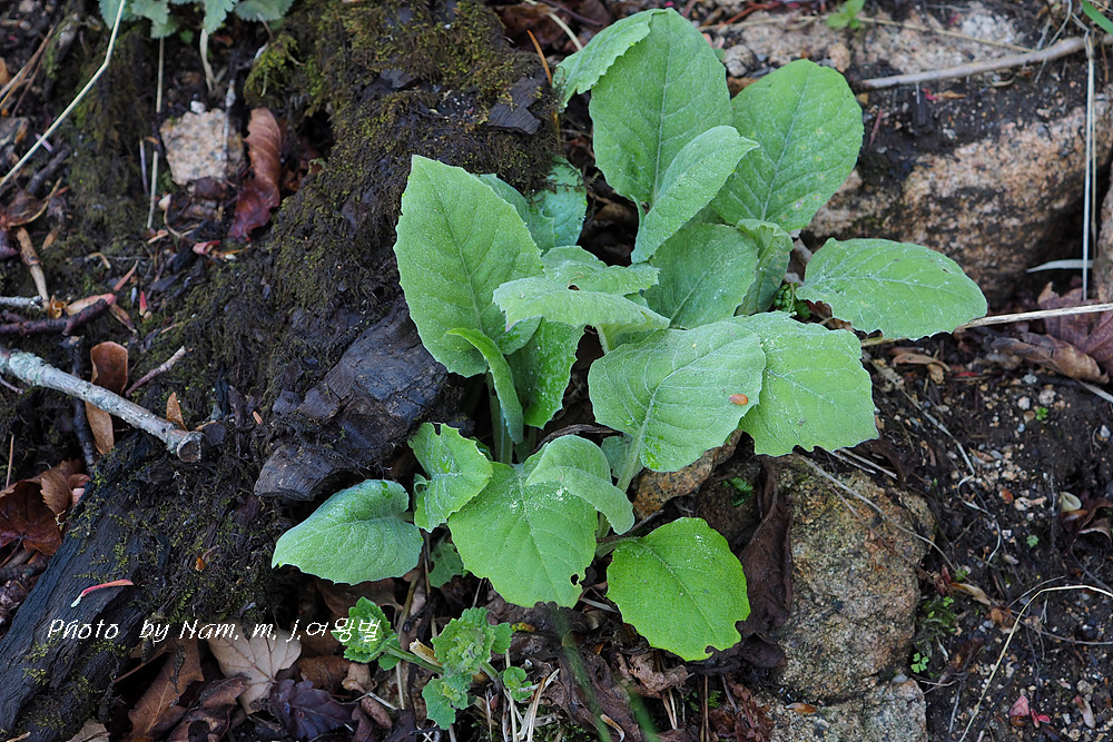 뿌리잎은 잎자루가 있으며 길이 5~10cm정도로 길며, 엽형은 난상 장타원형 또는 원형으로 매우 넓다.