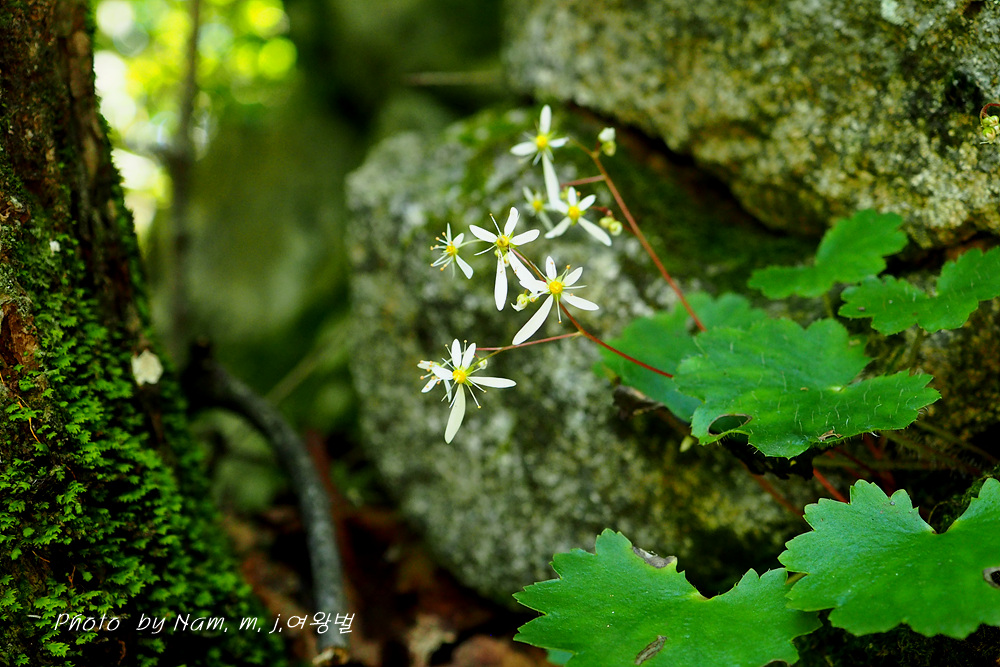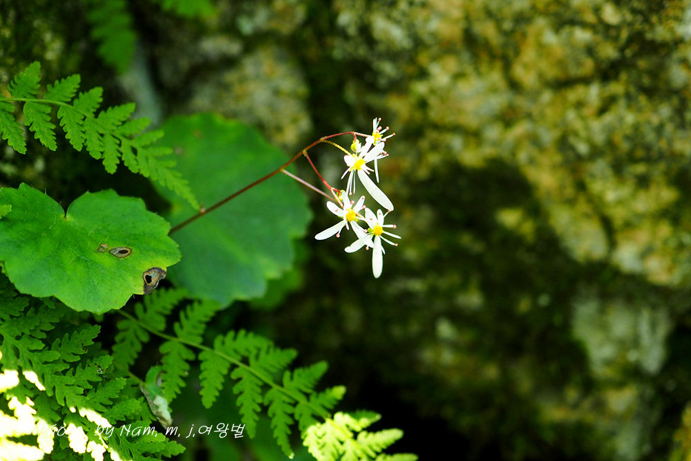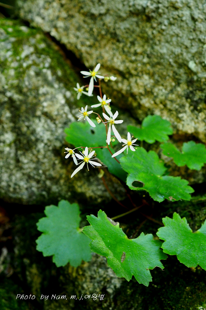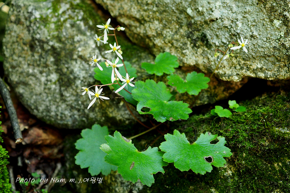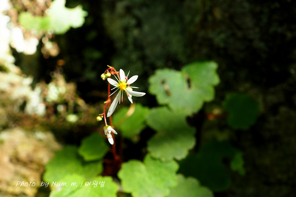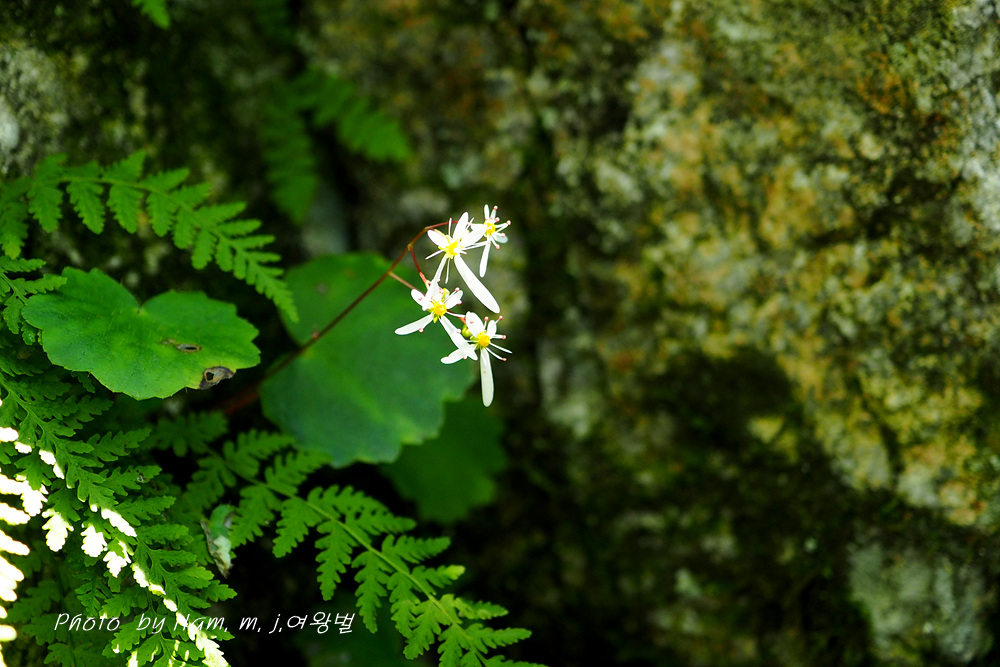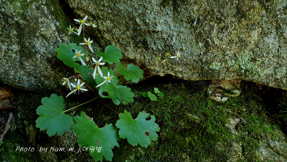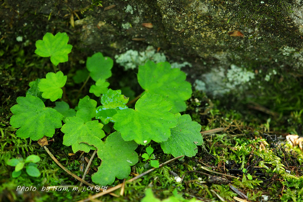 습한 바위벽에는 이끼와 함께 동글동글 귀여운 잎을 가진 바위떡풀이 토끼 귀를 늘어뜨리고 개화 중이다.