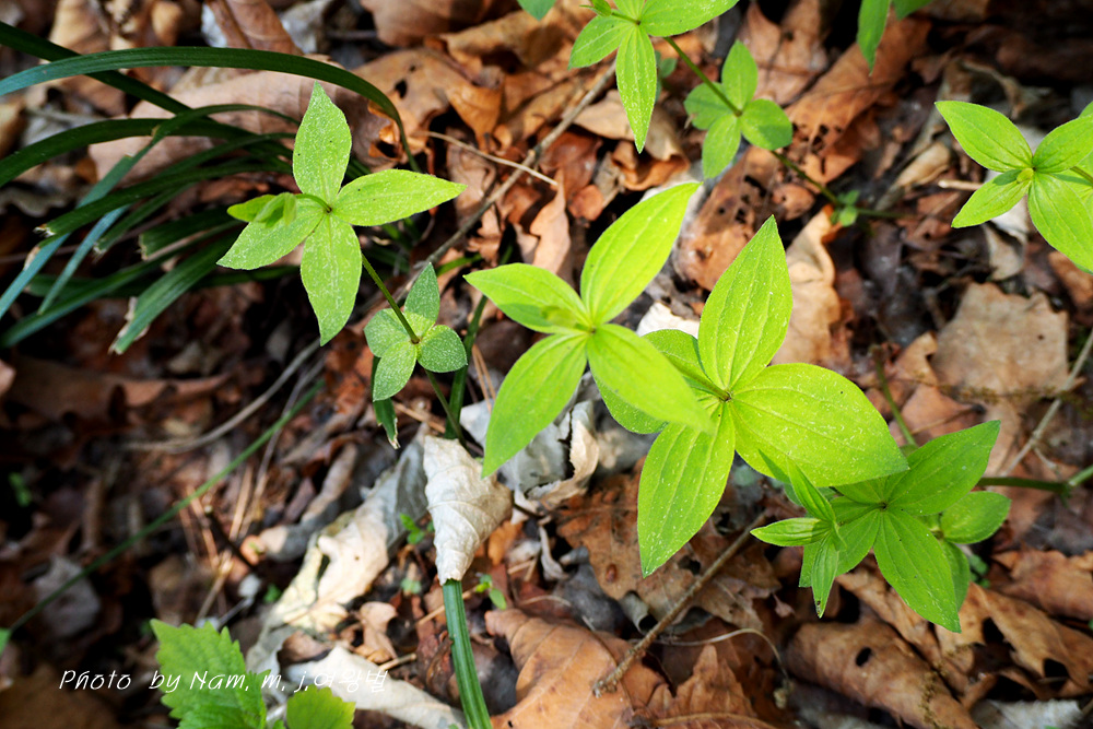잎자루가 없고 잎끝이 뾰족한 잎이 4 장씩 돌려난다.