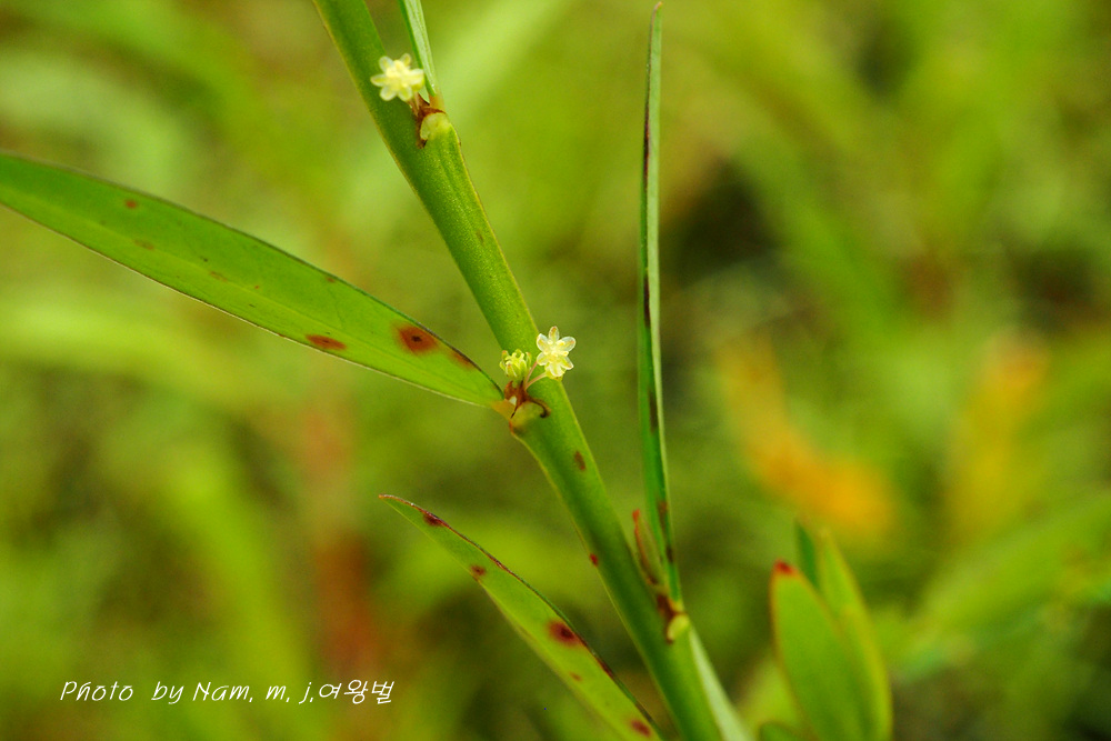 수꽃에는 꽃받침잎 6장, 수술 3개씩 있다. 암꽃에는 꽃받침잎 6장과 암술 1개가 있다.