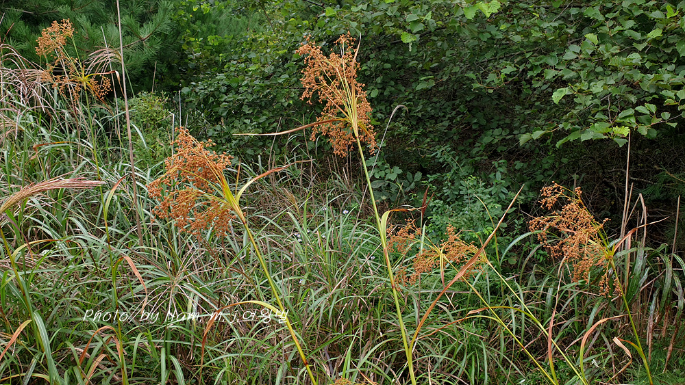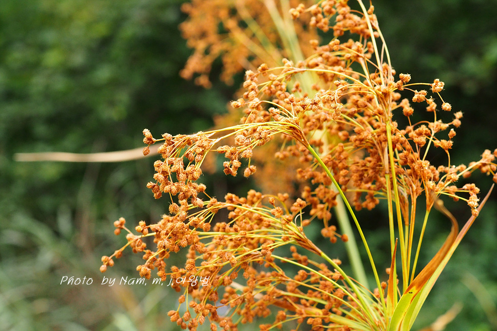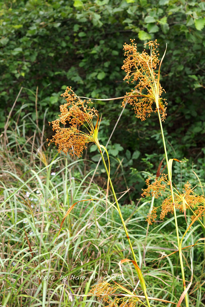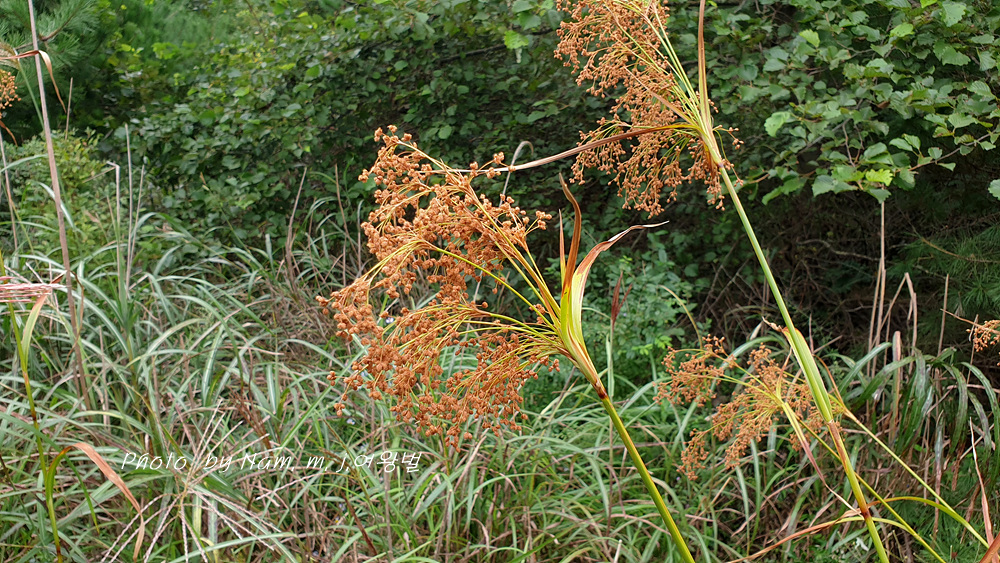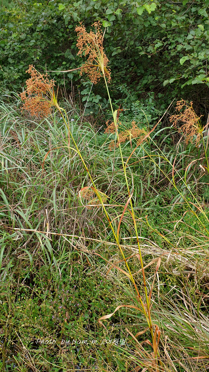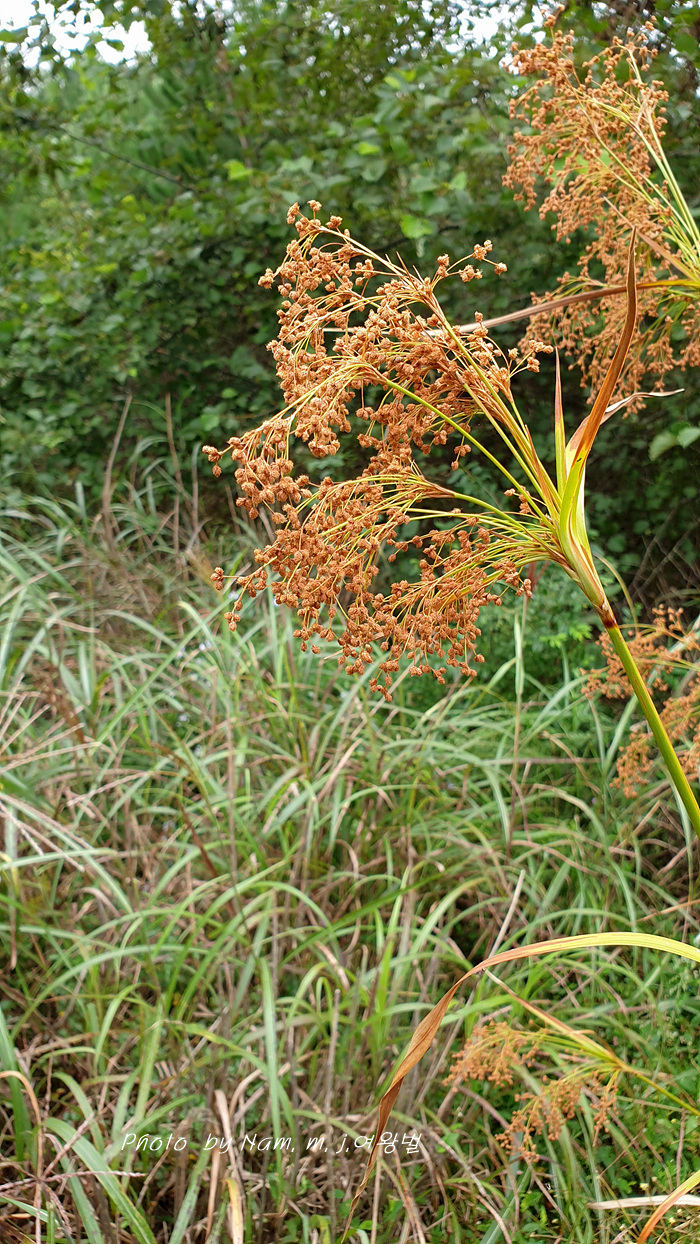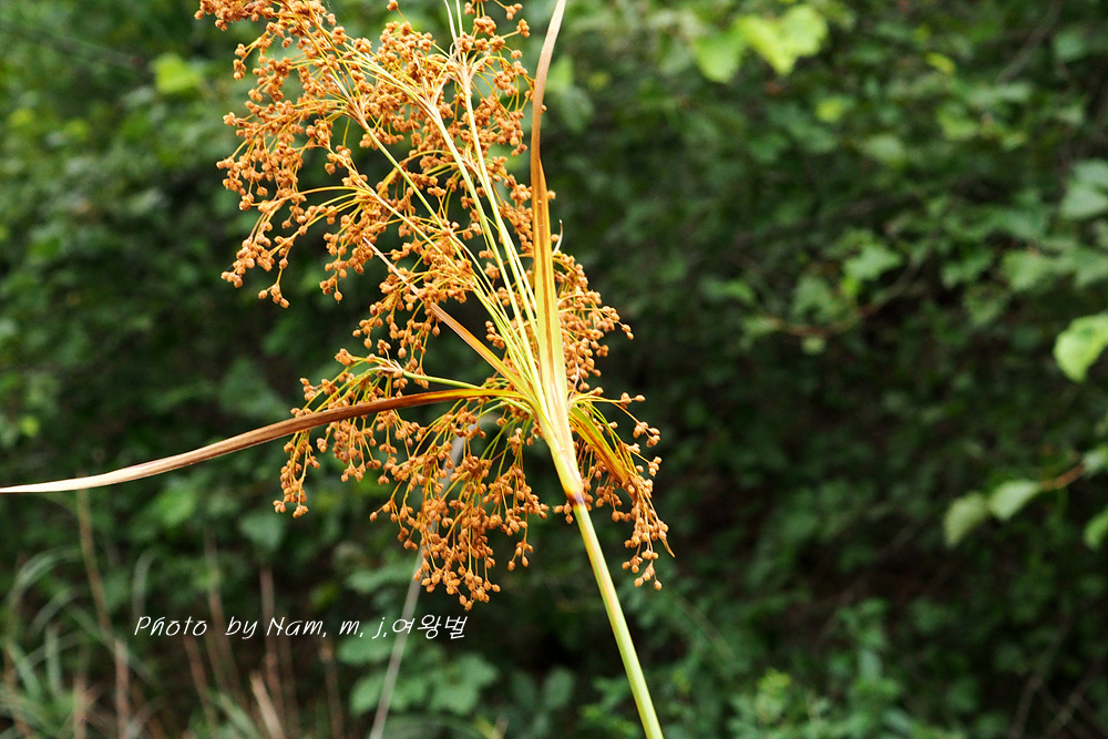 방울고랭이 ; 소수 3~7개 열매가 구형에 가까운 타원형 이삭이 아래로 늘어진다. 화서 가지가 까끌거린다. 개화기 8~9월