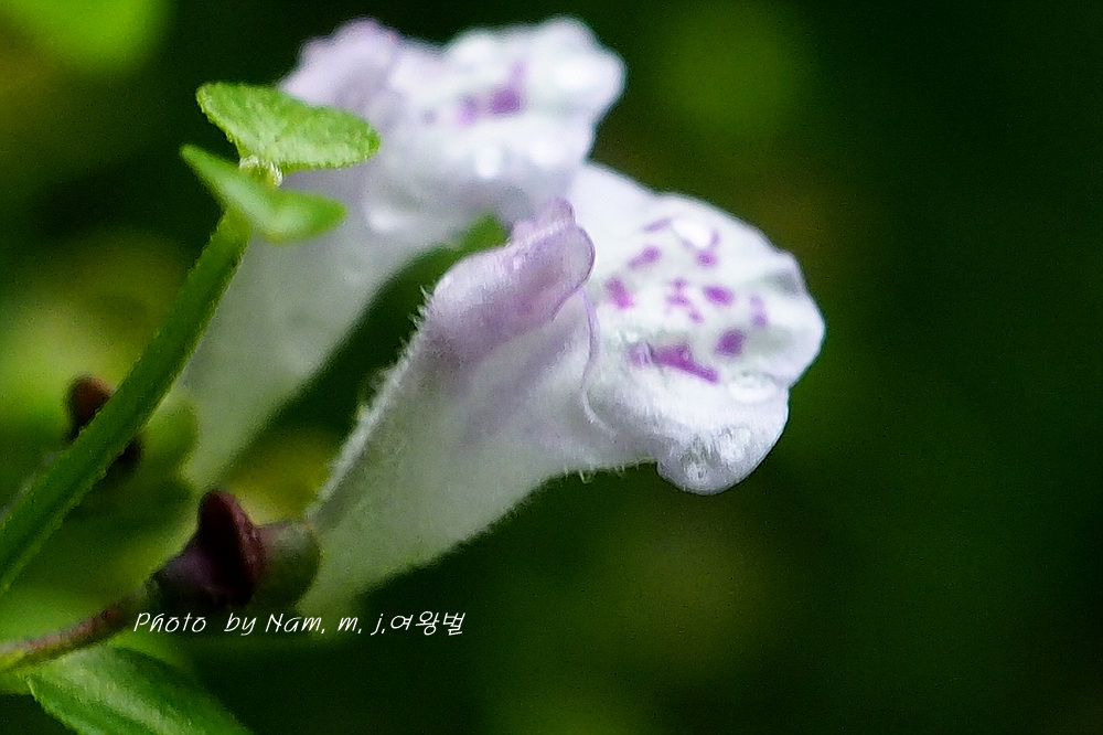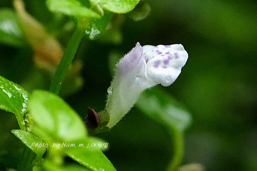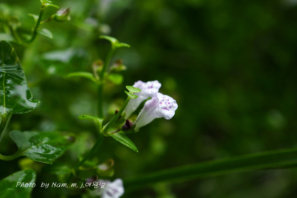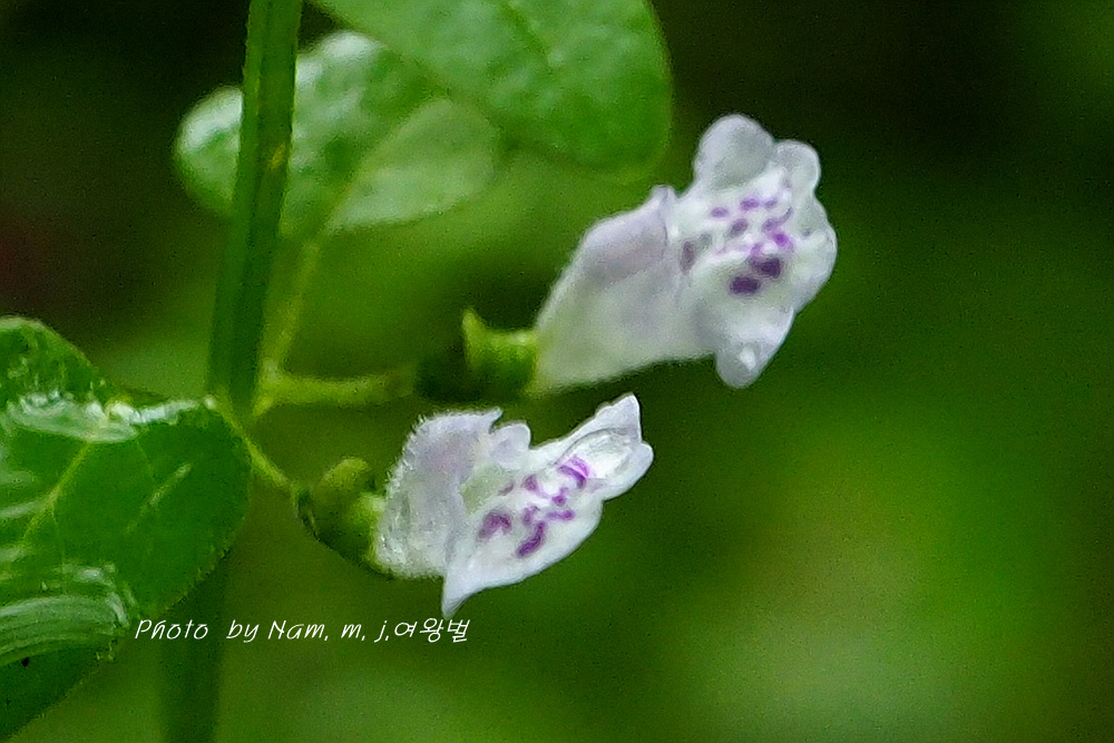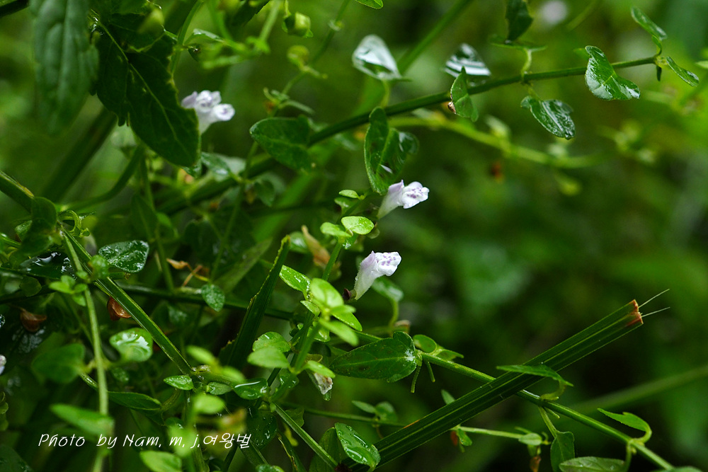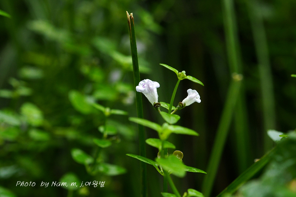 꽃은 잎겨드랑이에 두 개씩 달리는데 꽃부리의 상순이 하순보다 1/2 정도로 짧고, 흰색을 띤다