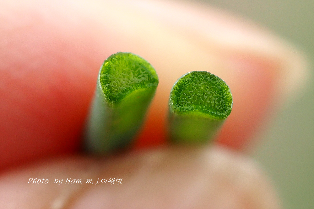 잎은 하나씩 어긋나며 얇고 긴 통 모양이고 단면은 반원형이다