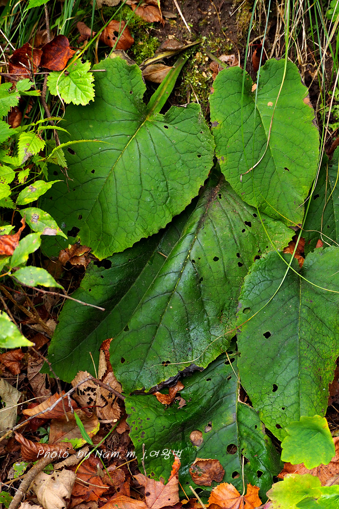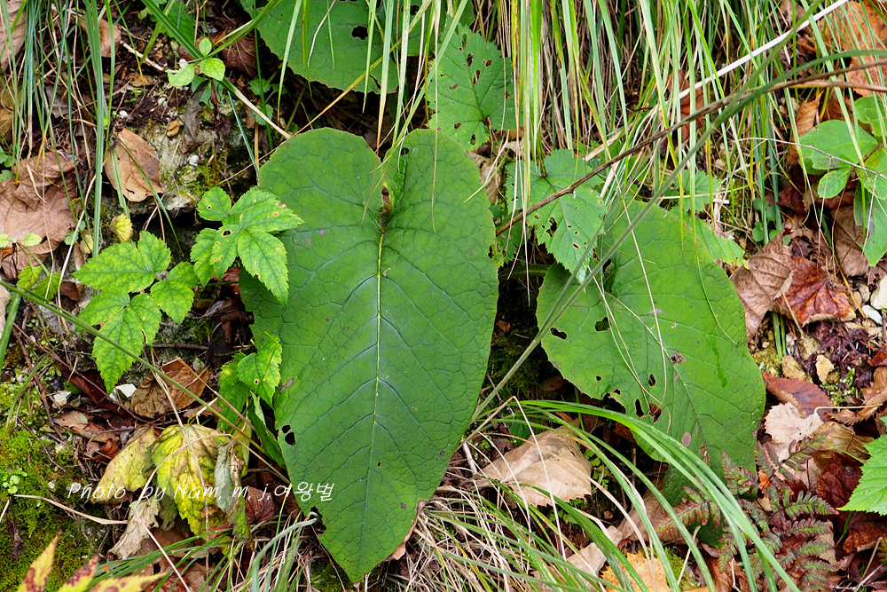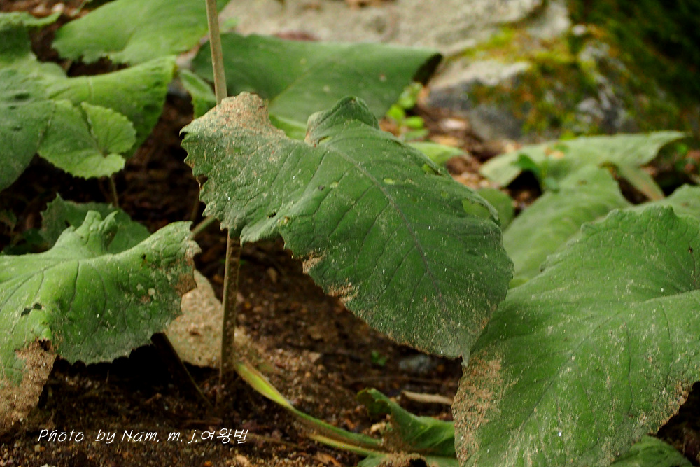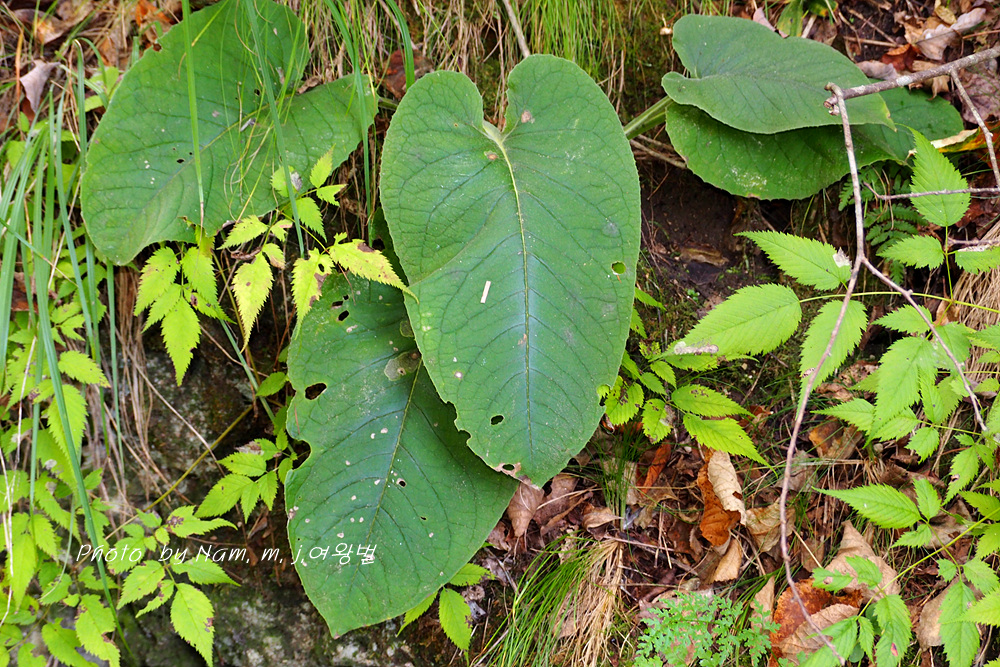 뿌리잎은 꽃 필 때 없어지며 잎자루까지 30cm에 이르는 대형이다.