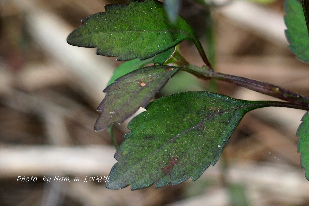 난형, 넓은 난형 톱니 크고 4~7쌍 털이 없거나 표면에 누운 털 화서 아래까지 잎자루가 길다 |