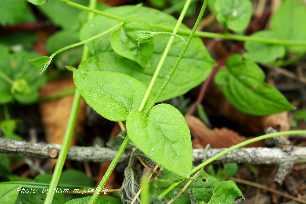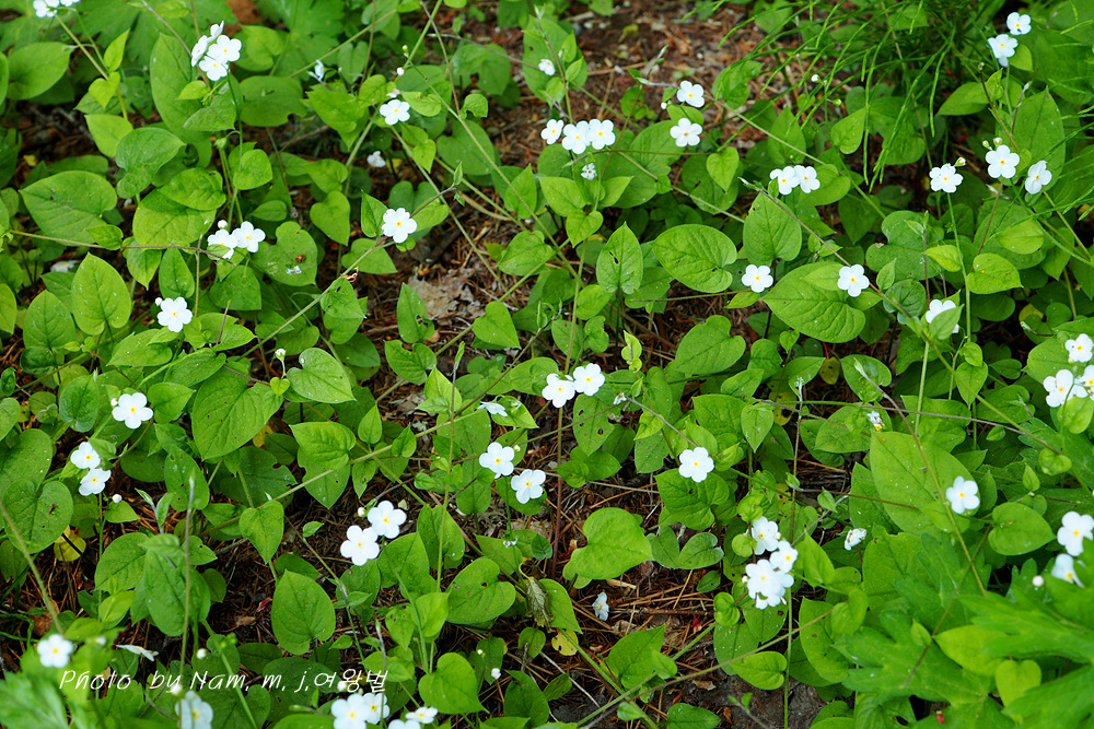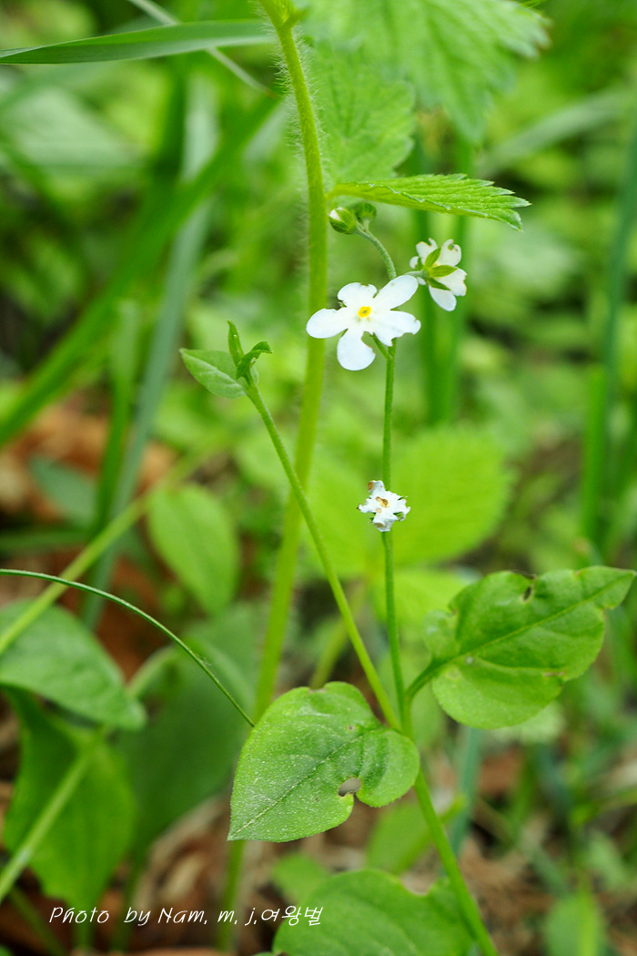 참꽃마리 : 덩굴을 길게 벋지만 꽃차례에 잎이 한 개씩 나오면서 피운다. 전체에 눌린 털이 있다.