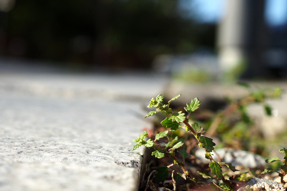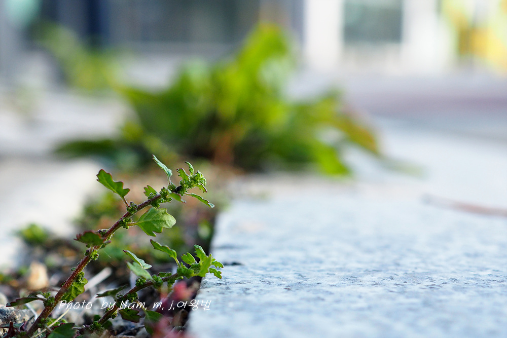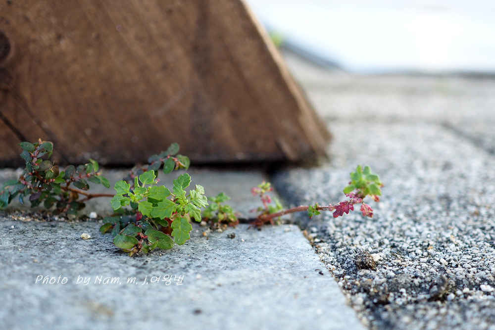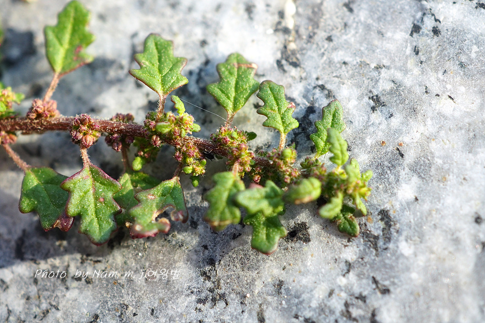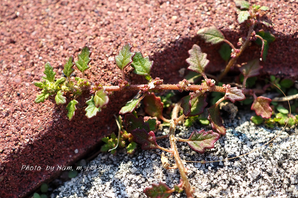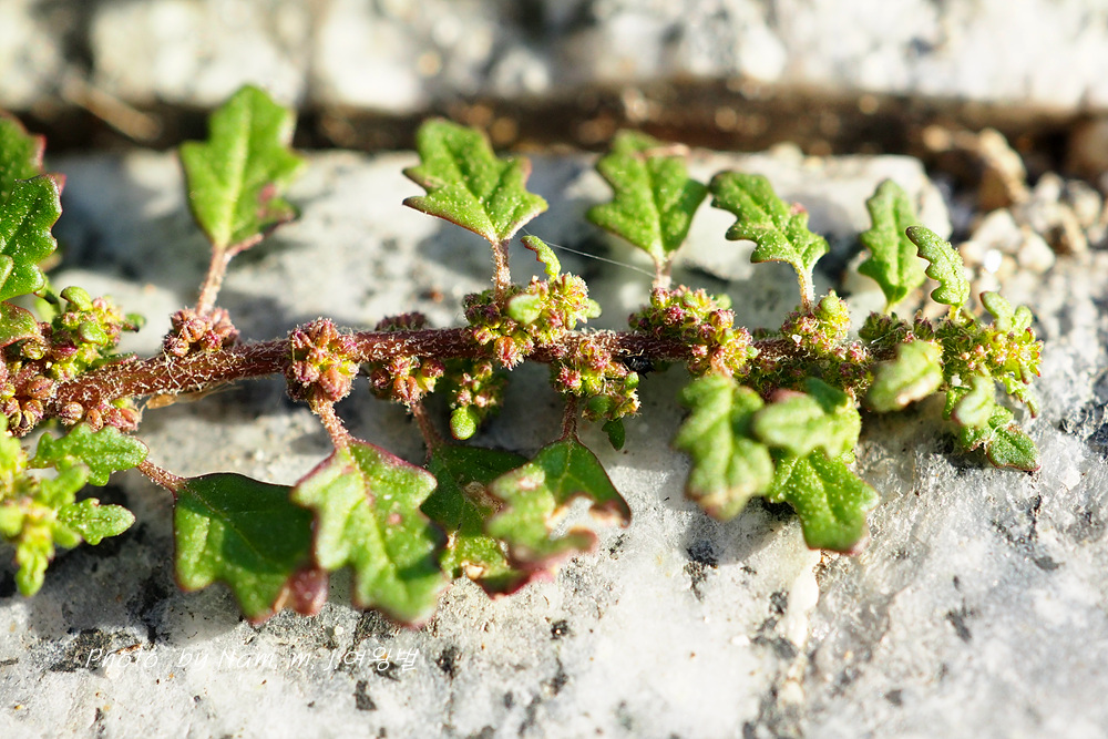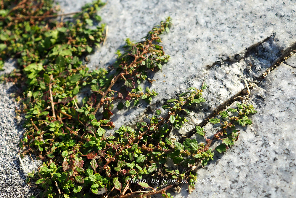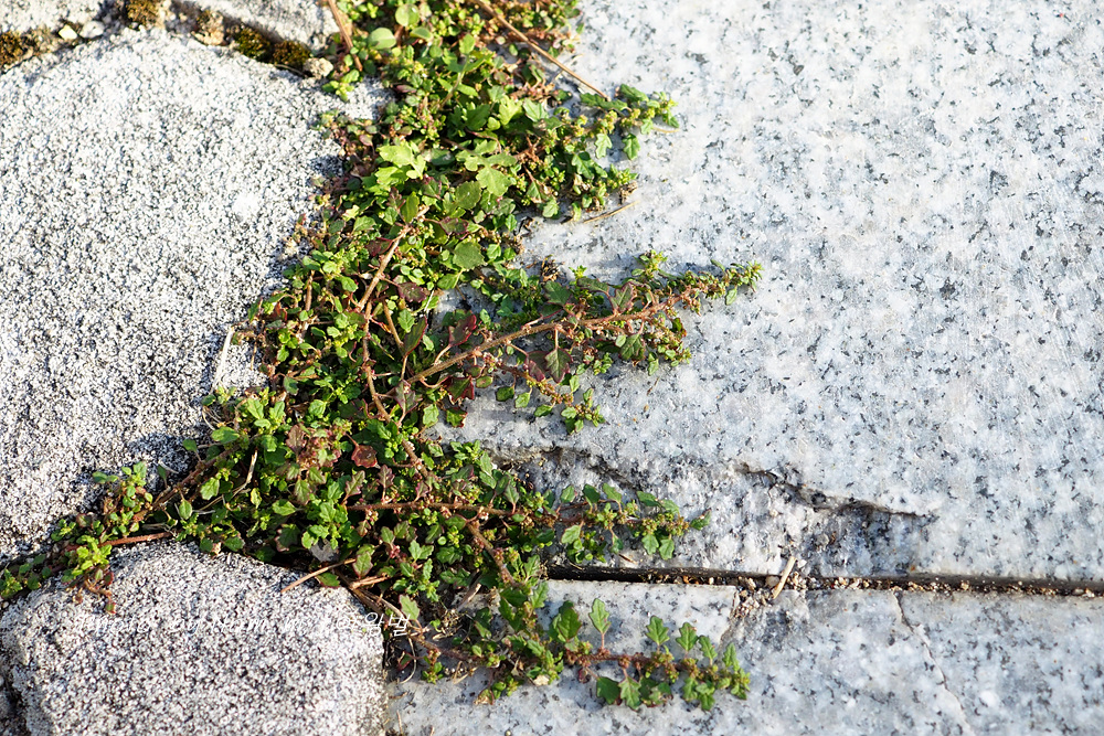 보도블럭 틈새에 뿌리 내리고 자잘하게 자라나서 좁쌀같은 꽃을 피우고 있다.