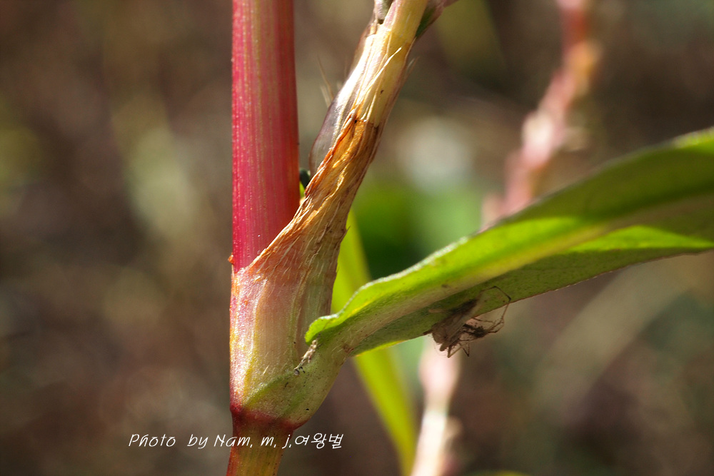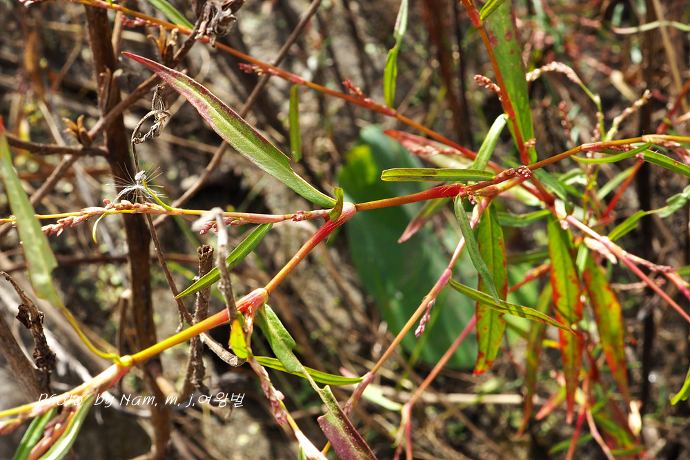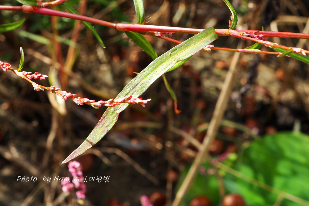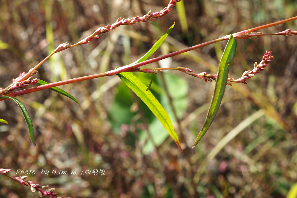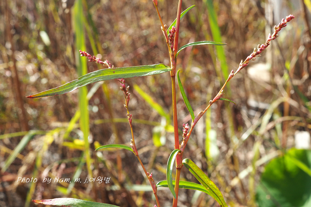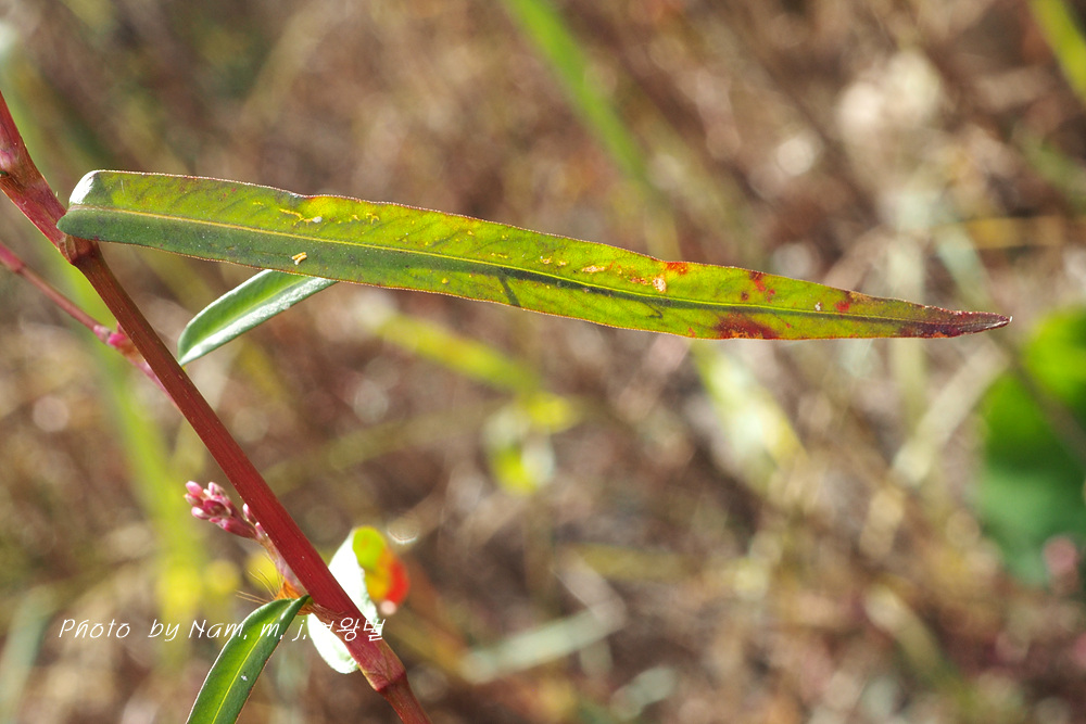 | 습지에서 키 20~30cm 정도로 자라는 여러해살이풀이다. 줄기는 연약하고 윗부분에서 가지가 갈리며 밑부분이 땅에 닿고 전체적으로 적갈색이 돈다. 잎은 넓은 선형 또는 피침형이며 길이 2~5cm, 너비 2~8cm로서 털이 없고 뒷면에 흔히 선범이 있다. 잎집 모양의 턱잎은 길이 5~10mm로서 거의 연모가 없으며 식물체는 마르면 적갈색으로 된다. 꽃은 8~9월에 피는데 줄기 윗부분의 잎겨드랑이와 원줄기 끝의 이삭꽃차례에 달린다. 꽃차례는 가늘고 길이 3~5cm로서 꽃이 드문드문 달리며 표면에 털이 없다. 화피는 붉은빛이 돌며 길이 1.5~1.8mm이다. 열매는 수과로서 렌즈형이고 검은색이며 윤채가 있다. |