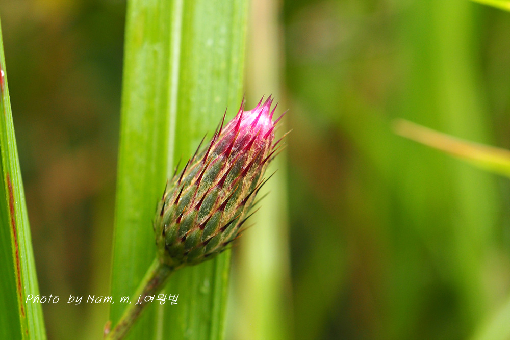 총포편의 자상 돌기털이 아주 길게 발달하고 총포편이 자색을 띤 녹색이다.