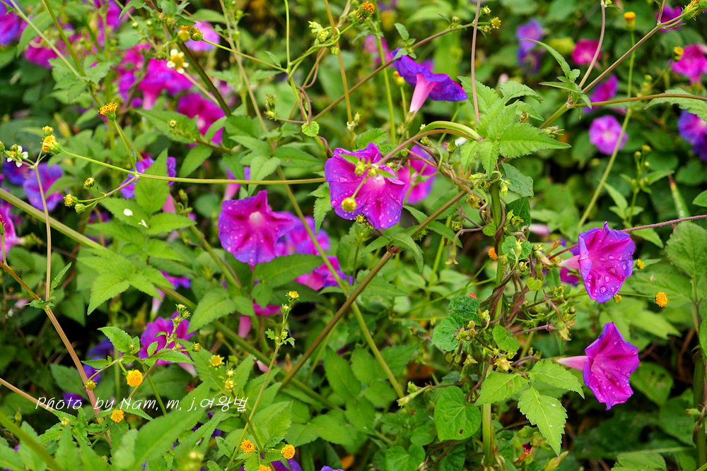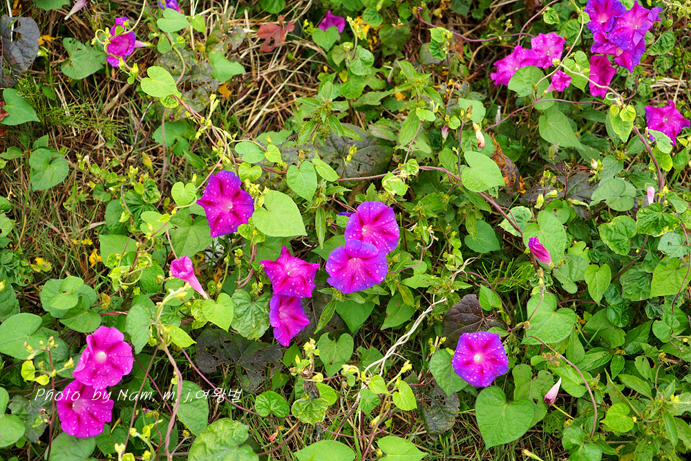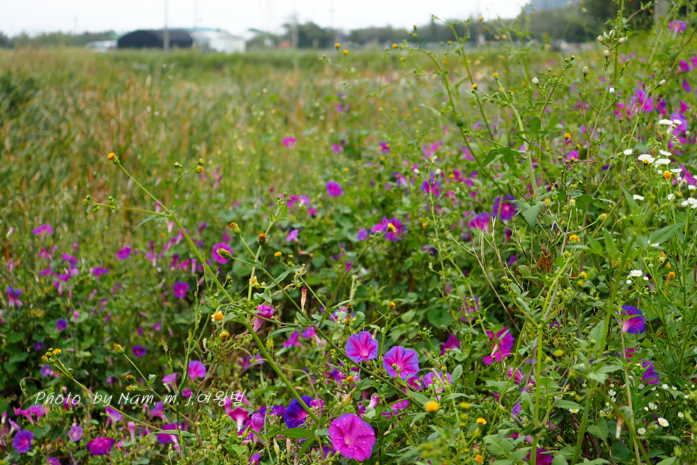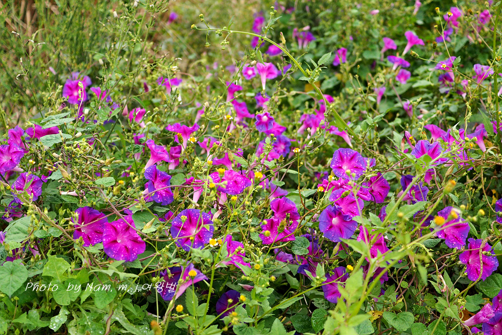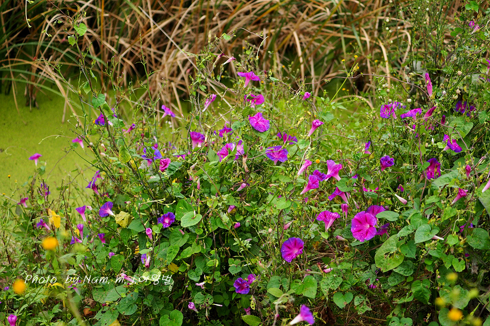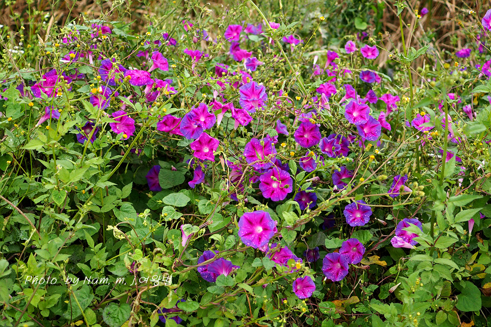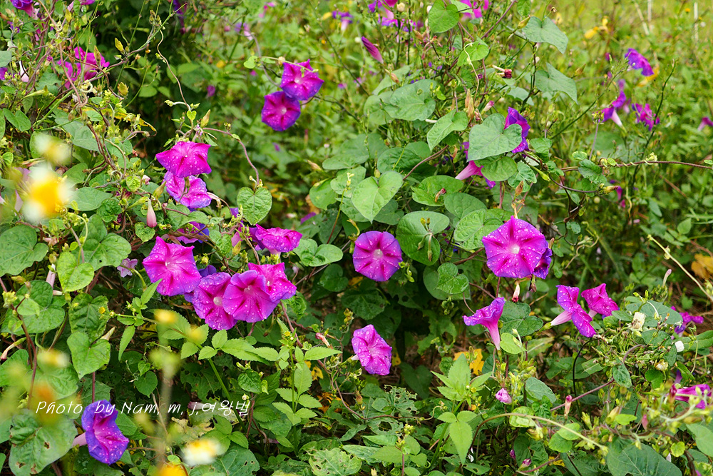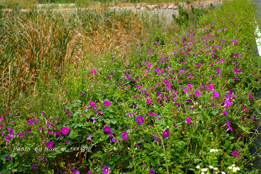 제방 안쪽에 둥근잎나팔꽃이 밭뙈기를 이루고 있다. 붉은자색의 꽃색이 여느 꽃보다 더 이쁘다.