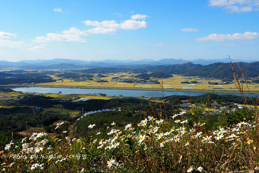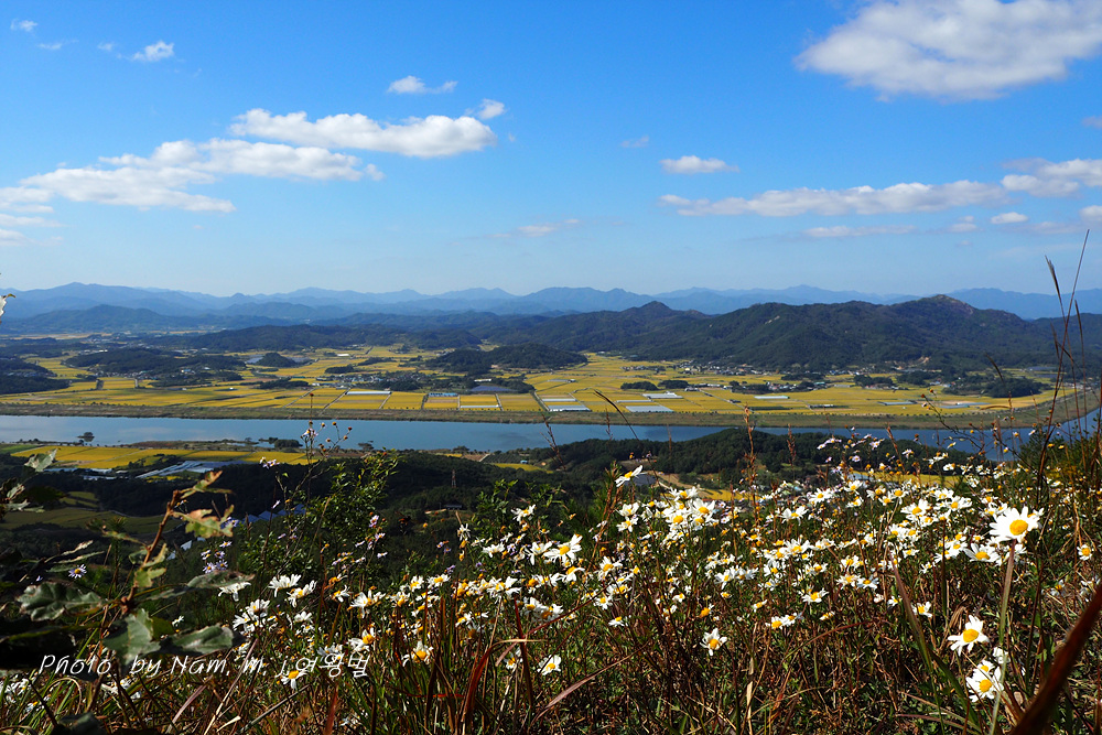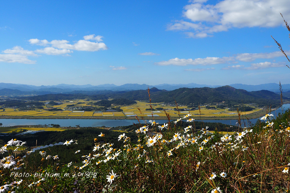 언덕같은 산능선에서 내려다 보는 낙동강과 노랗게 물 든 들판, 비취빛 하늘의 구름 조각이 어우러져서
