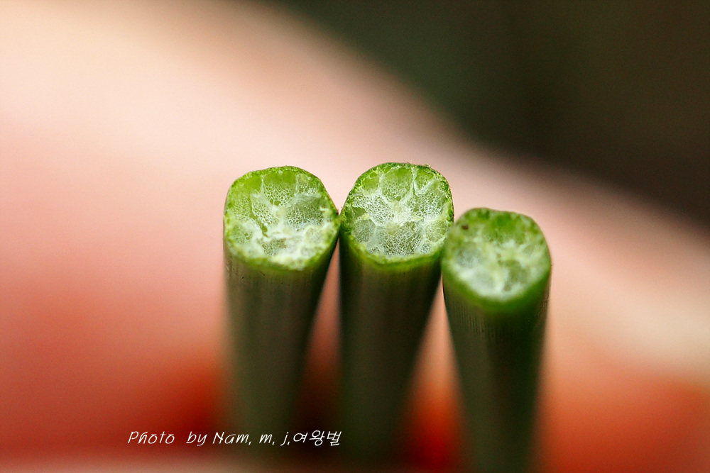 줄기 단면이 약하게 모가 난 듯한 원형이다