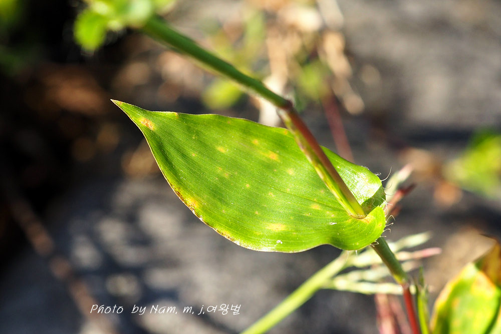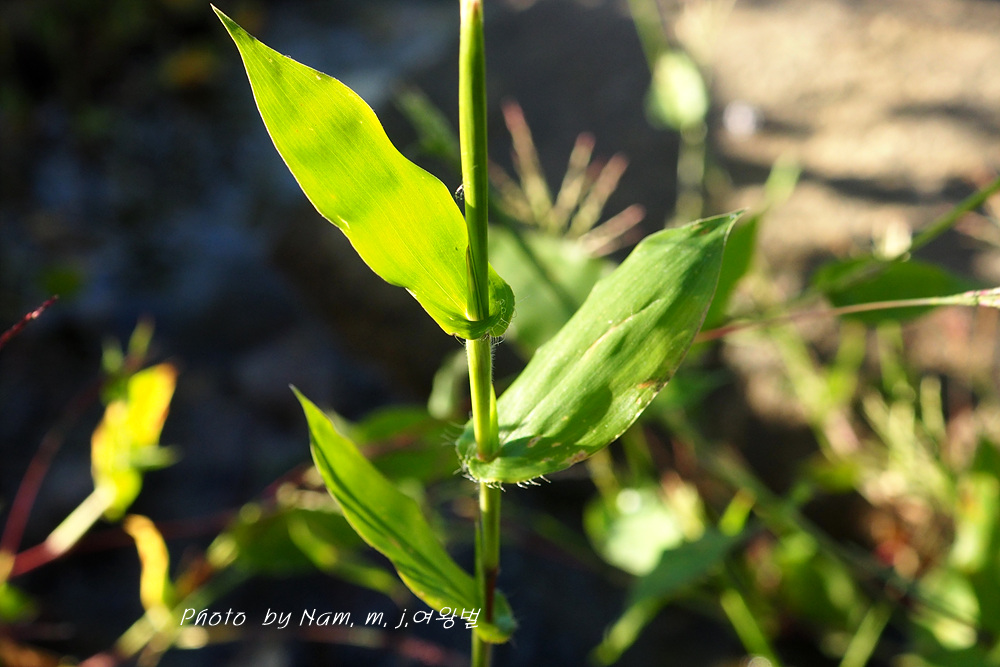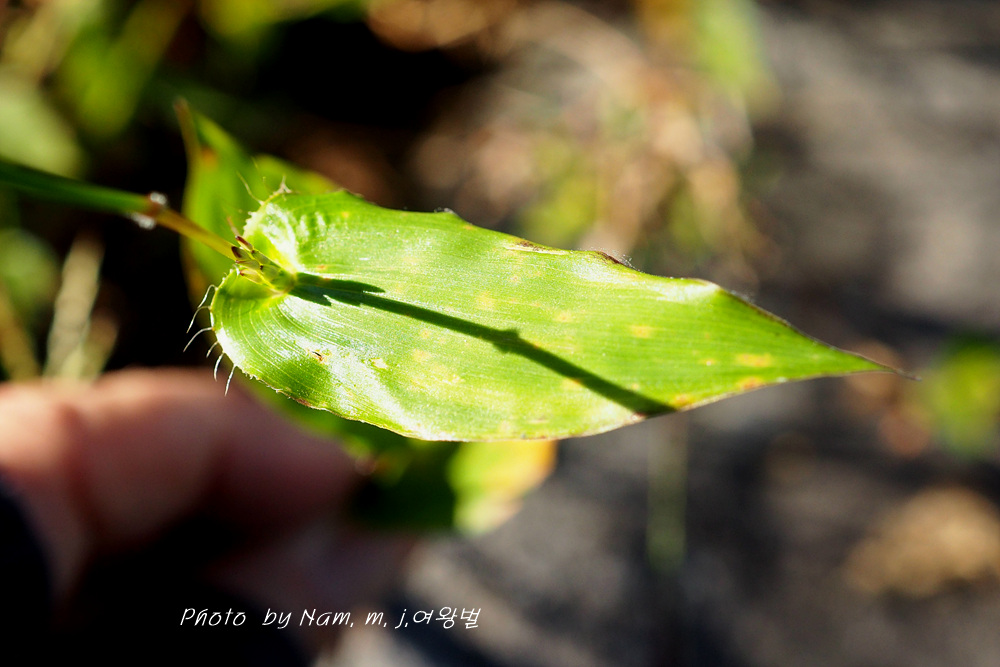 잎집은 짧고, 긴 털이 성기게 나거나 털이 없다. 잎이 긴 난형이고 가장자리에 털이 있는 것이 특징이다.