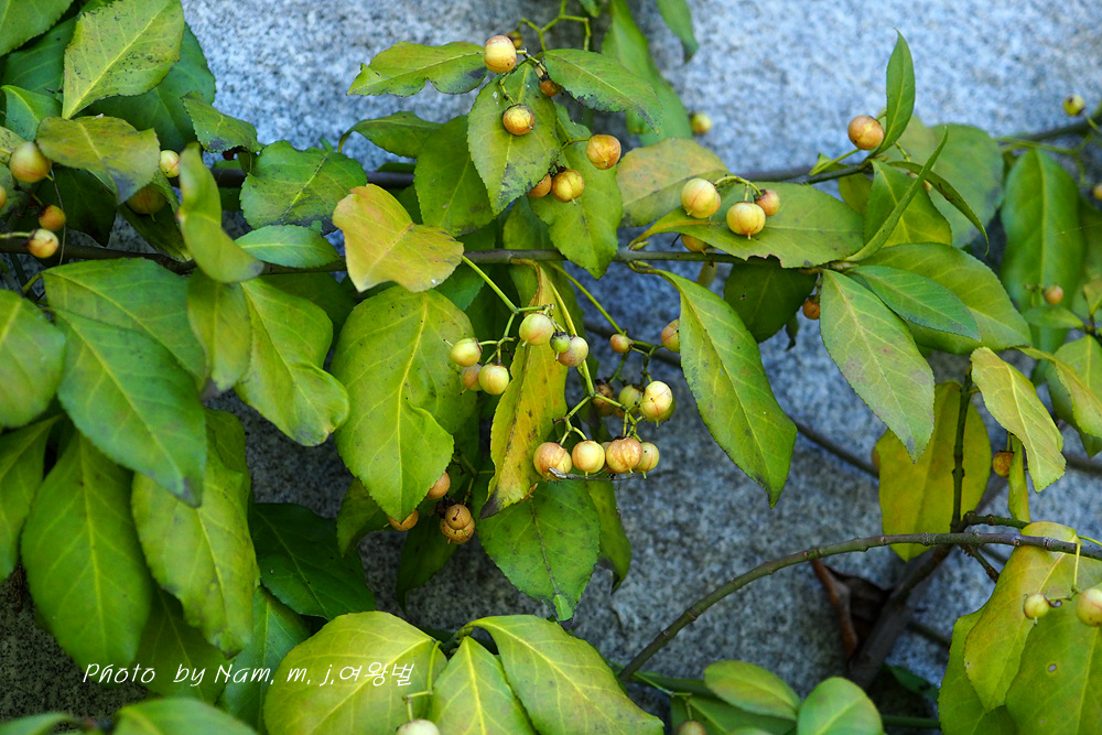 줄기에 기근을 내어서 바위나 나무 기둥을 타고 10m 까지 자란다. 사철나무보다 잎과 열매가 작다.