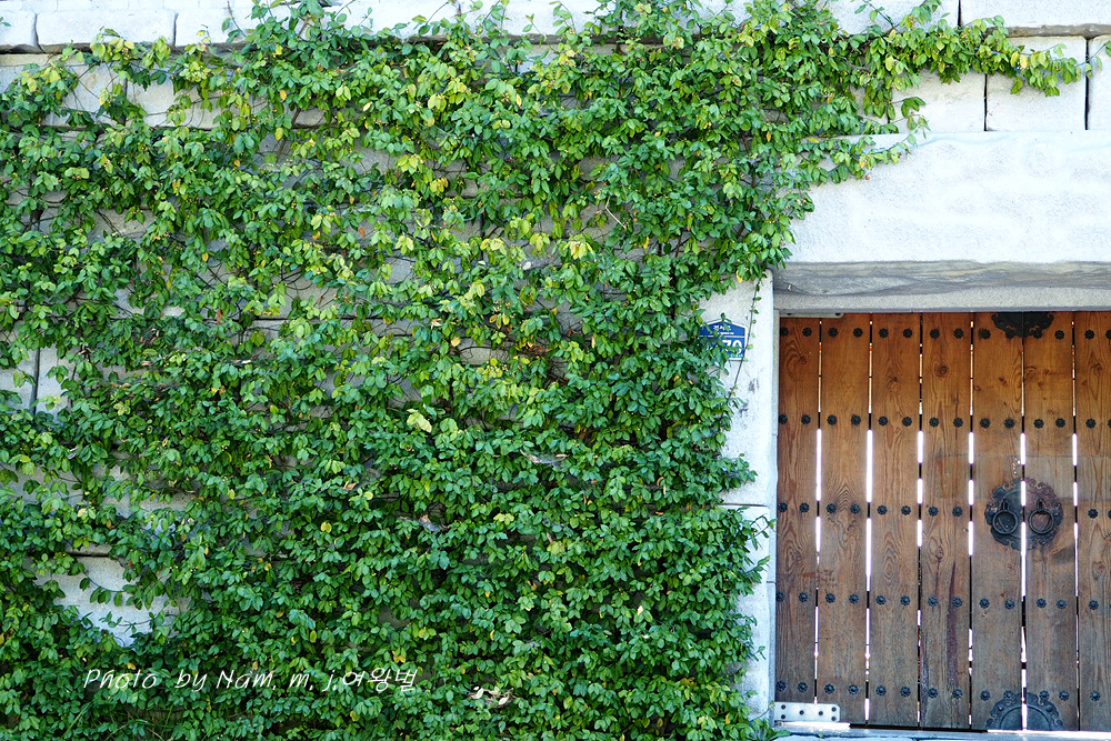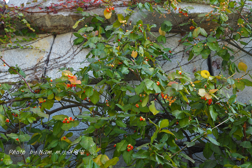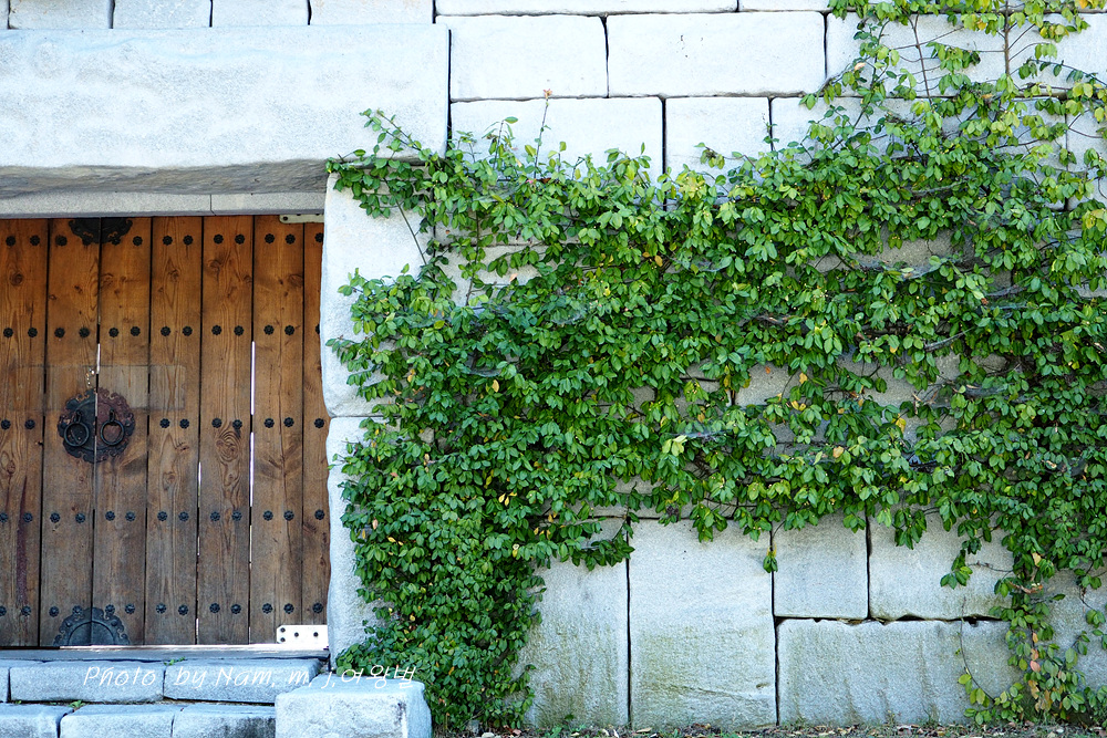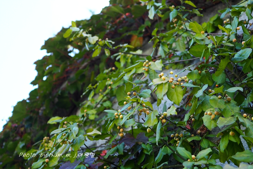도로변에 난데없이 성루 같은 건물이 서 있는데 그 석벽을 줄사철나무가 뒤덮고 있었다.