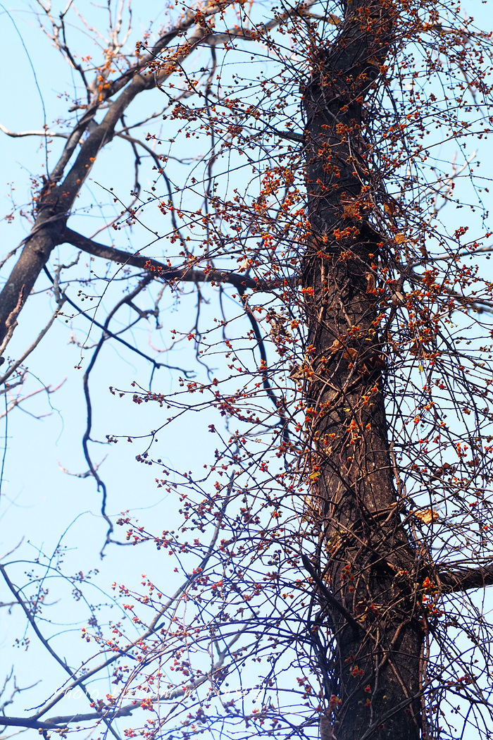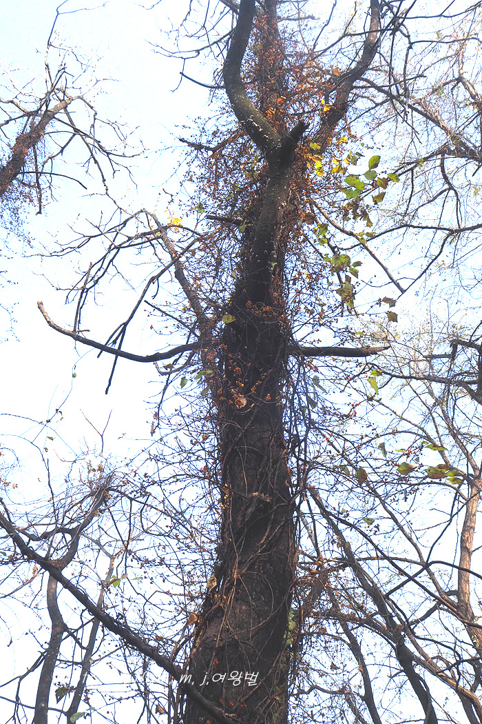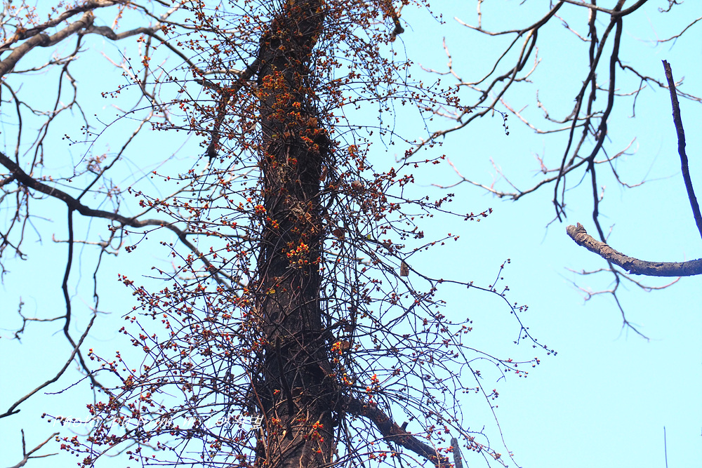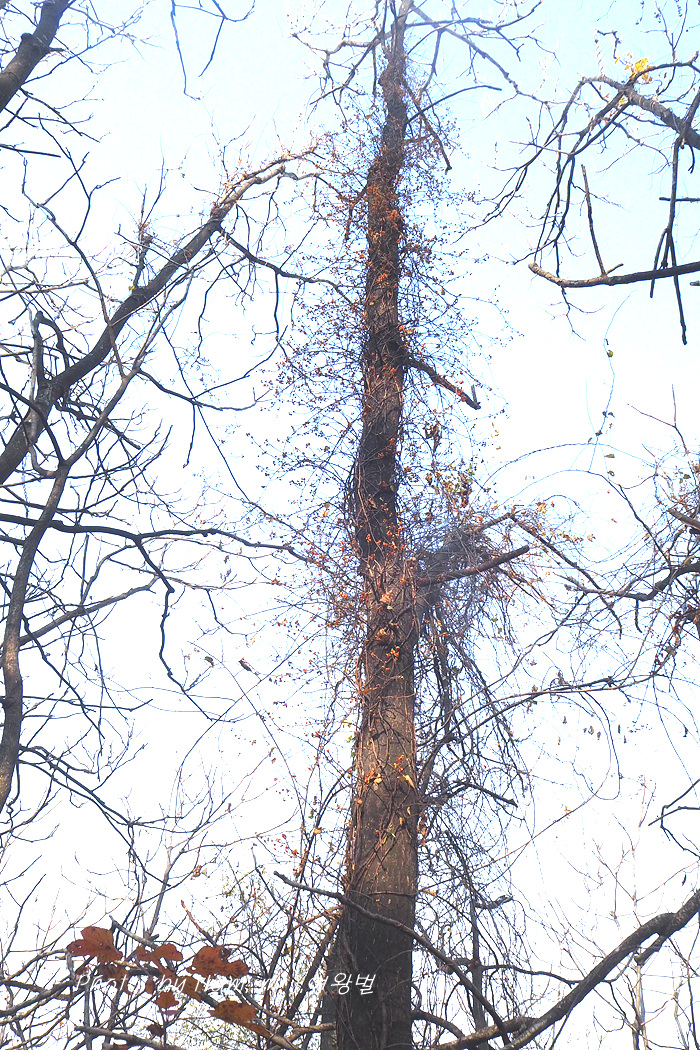 동네 인근 야산에 20m 정도 되는 가죽나무 기둥을 타고 올라 살고 있는 세력이 엄청난 푼지나무다.