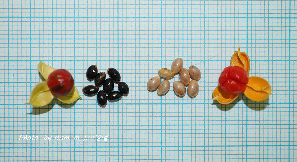 푼지나무 종자는 검은 색을 띠고 노박덩굴은 진주구슬처럼 은은한 백색을 띤다