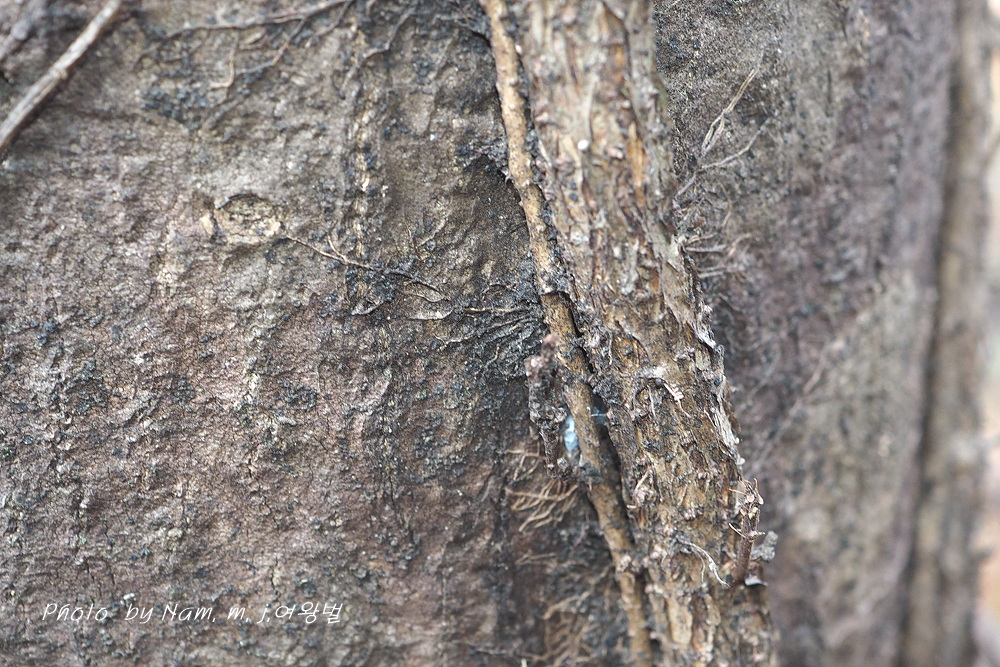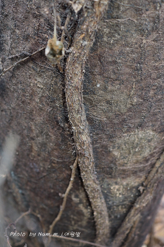 기근을 확인하기 쉽지 않았는데 아래 쪽 나무 기둥에 딱 달라붙어 있는 손가락 굵기의 굵은 덩굴을 살피다가