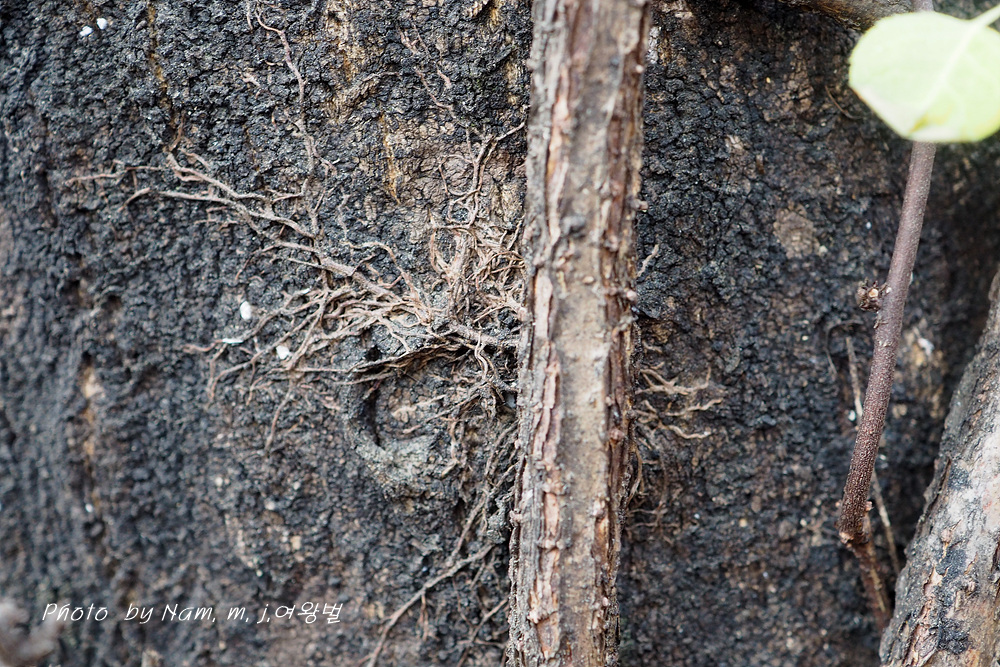 어린 덩굴이 기어오를 때 나무의 수피에 기근이 활착이 되면 잔뿌리가 점점 길게 퍼져 자라면서