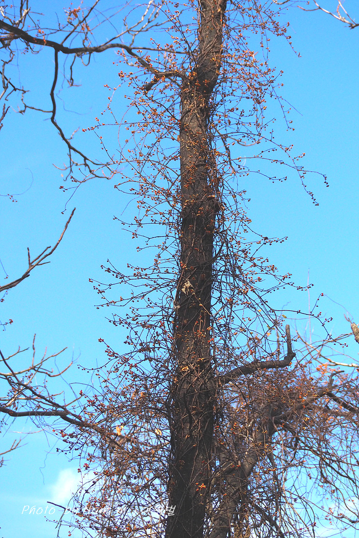 20m 정도 높이의 가죽나무를 기어올라 있는 오래 묵은 푼지나무 덩굴이 있는 곳을 다시 찾았다.