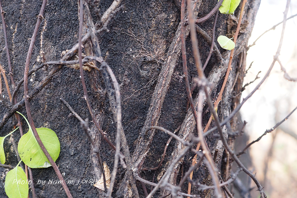 나무에 붙어 있는 푼지의 덩굴을 손으로 떼어 보려 해도 나무 수피에 아주 찰싹 달라붙은 덩굴은 꼼짝도 하지 않았다.