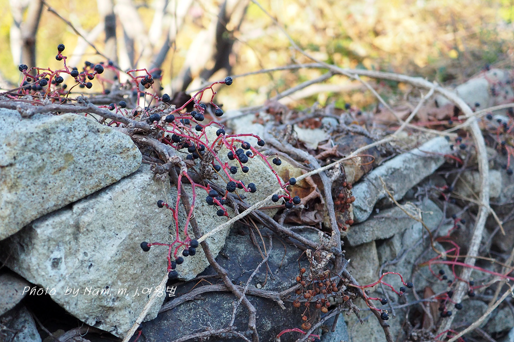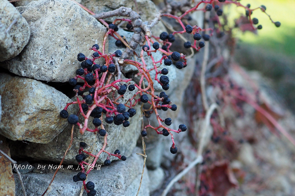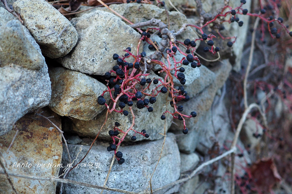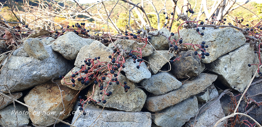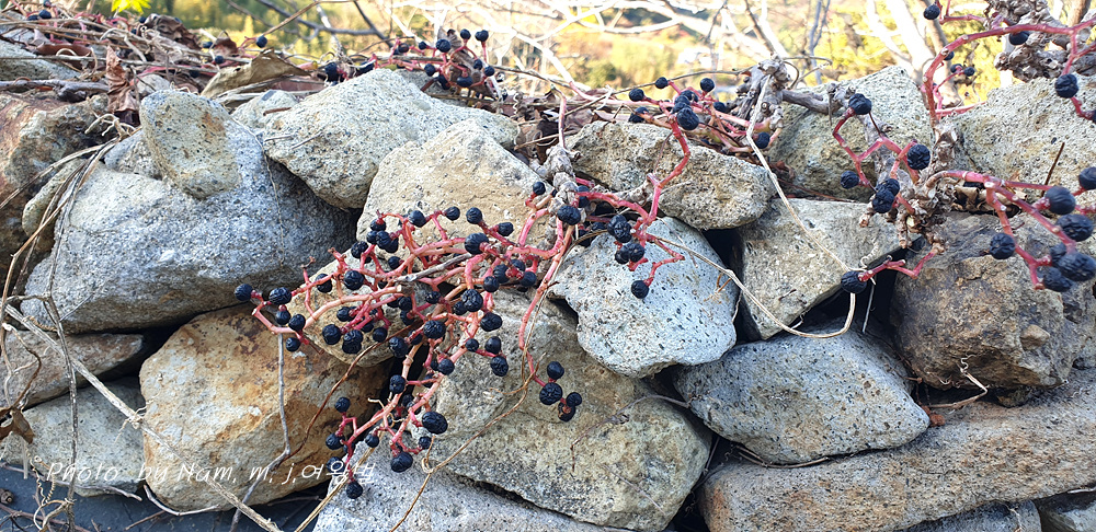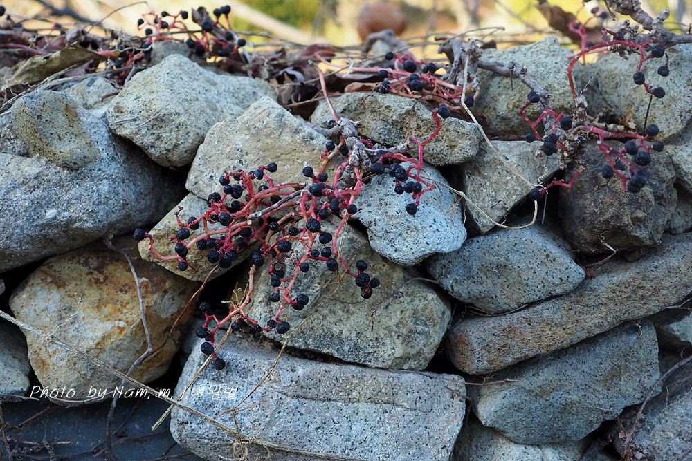 집 흔적은 전혀 없고 밭으로 경작을 한지 꽤 오래 된 듯한데 돌담에 기어오른 담쟁이덩굴에 열매가 까맣게 달려 있다.