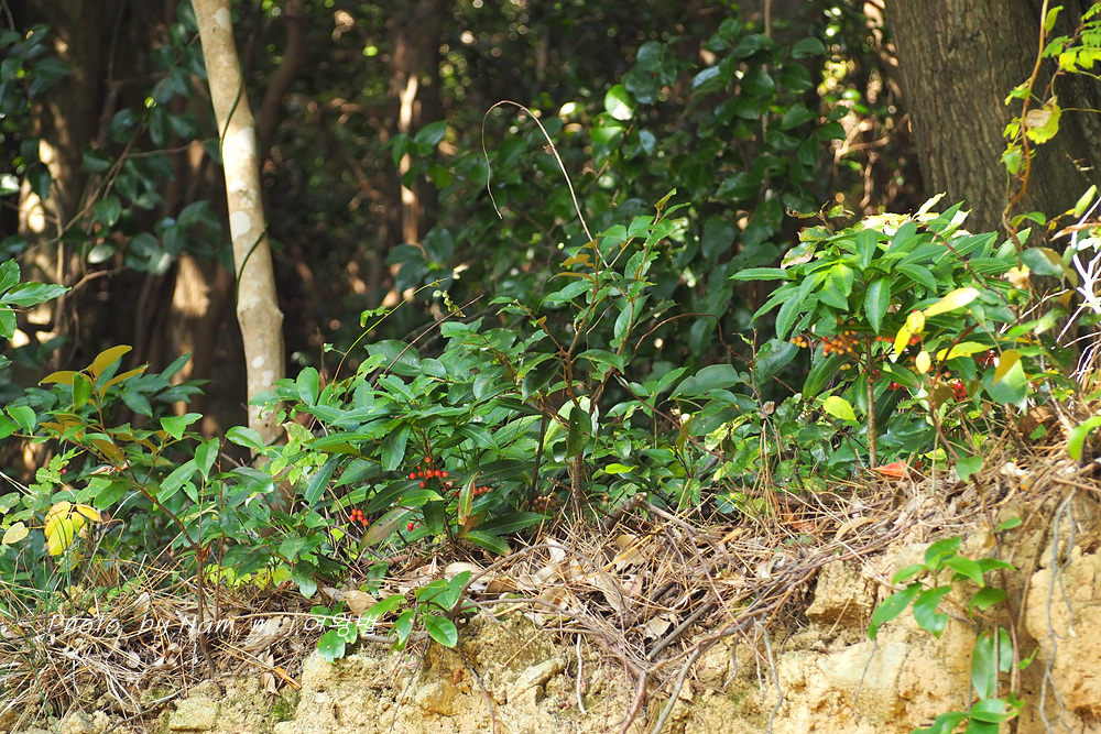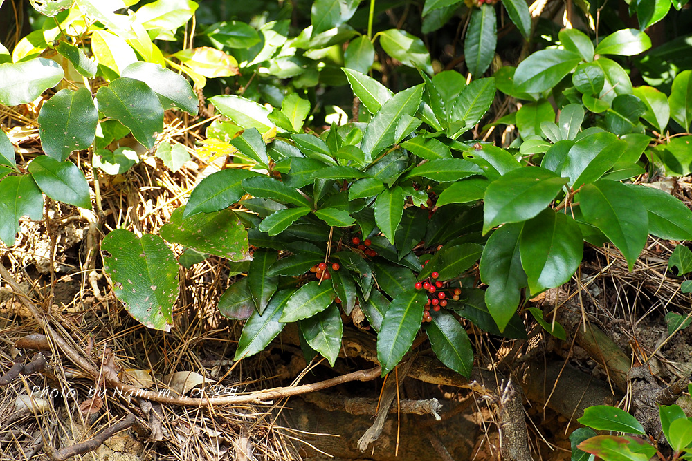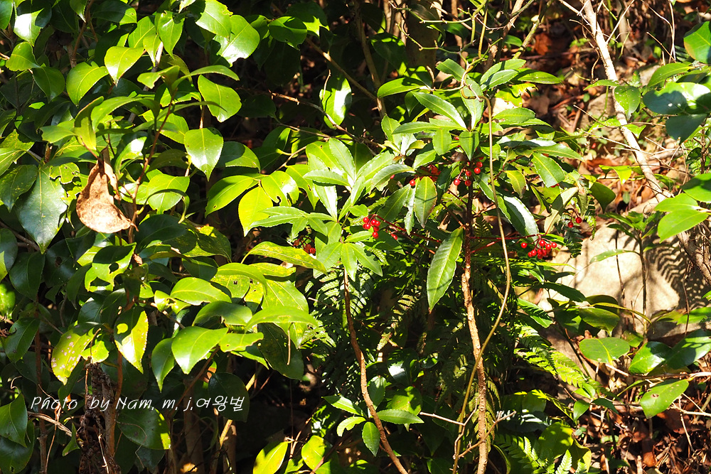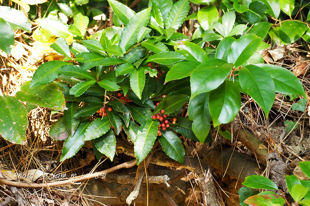 자금우, 산호수와 함께 남부지역에 숲 그늘에 자생하는 자금우속 식물 중 하나로 1m 까지 자라는 가장 큰 녀석이다.