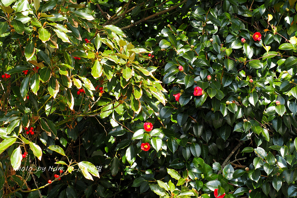 남도의 섬 해안 산책로를 도는데 동백나무가 점점이 붉은 꽃을 피우고 있다.