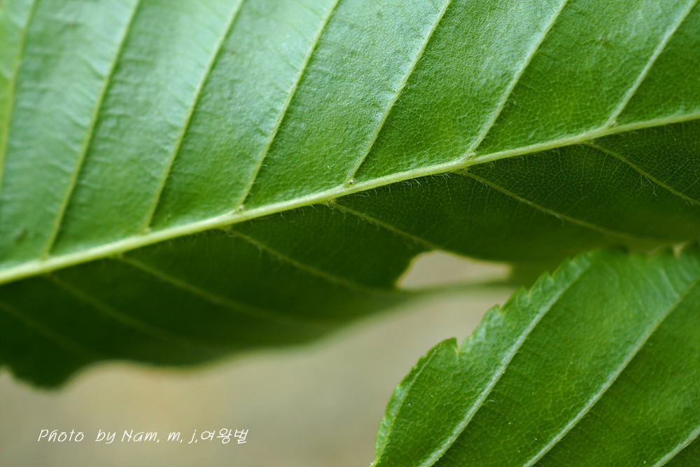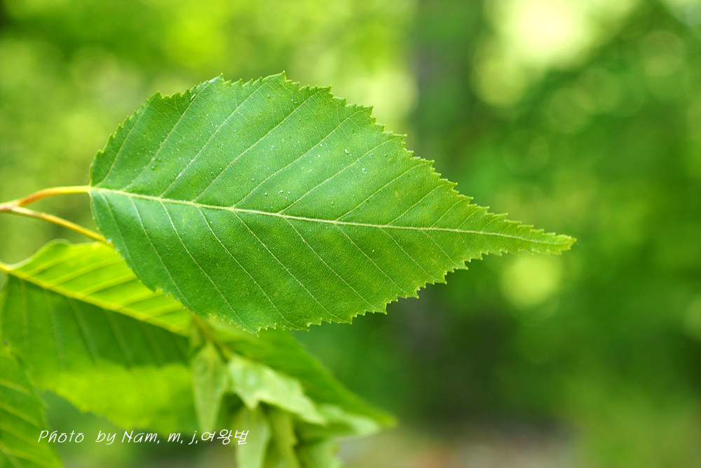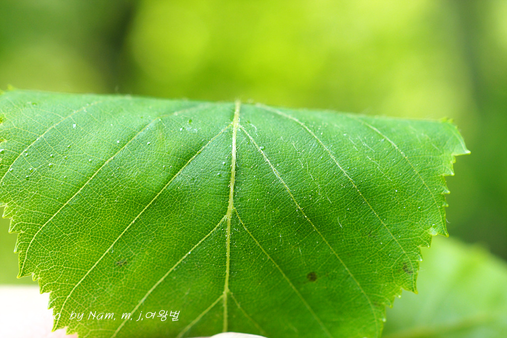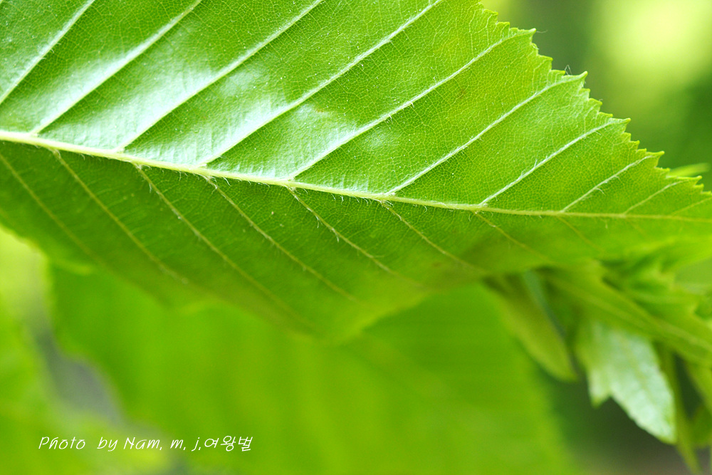난형, 긴 난형 또는 타원형 길이 7-14cm, 불규칙한 거치 측맥은 12-20쌍이고 표면은 털이 없으며 뒷면은 엽액과 맥 사이에 털이 있다. |