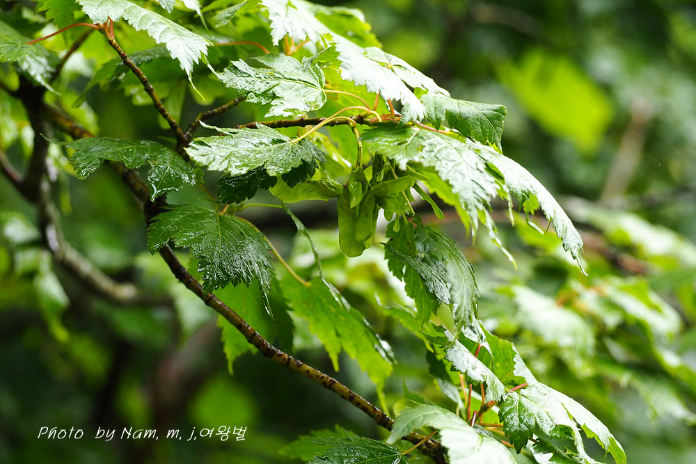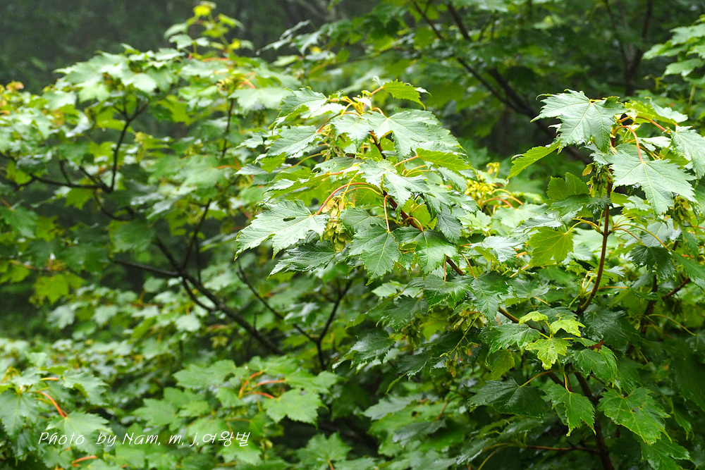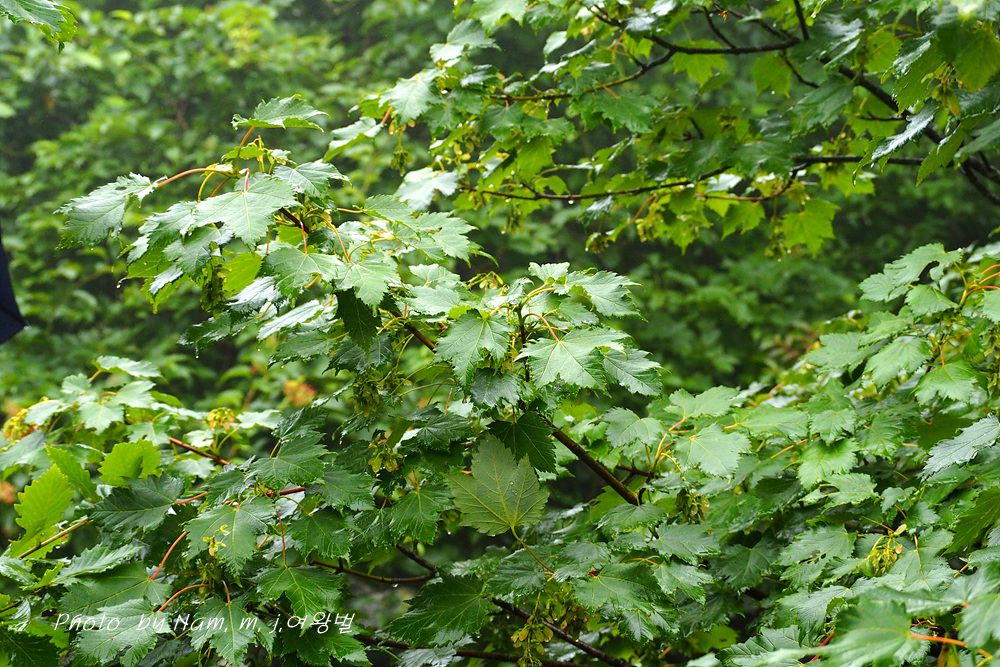 우산을 쓰고 우의까지 입고 임도를 걸으면서 촬영한 것이라 잎이 물기로 번들거린다.