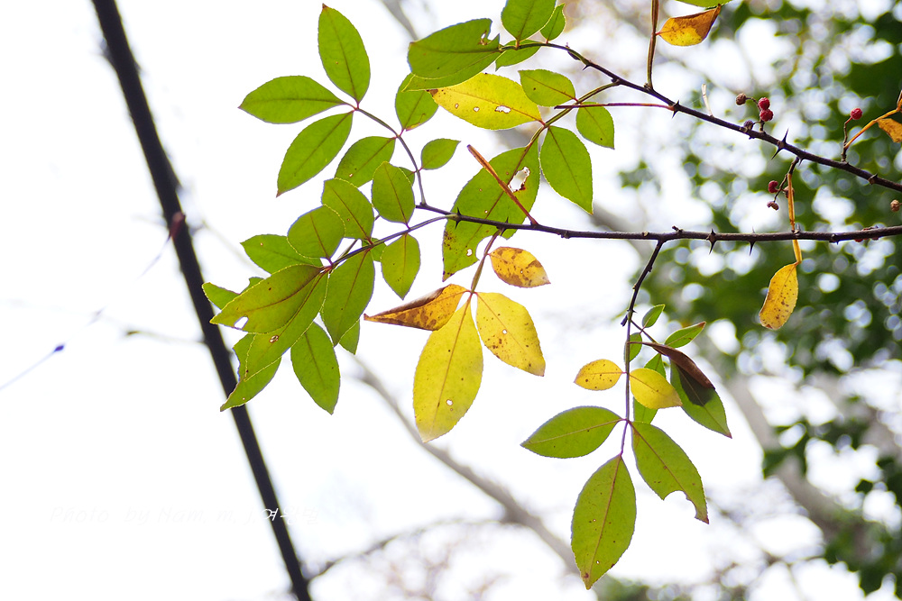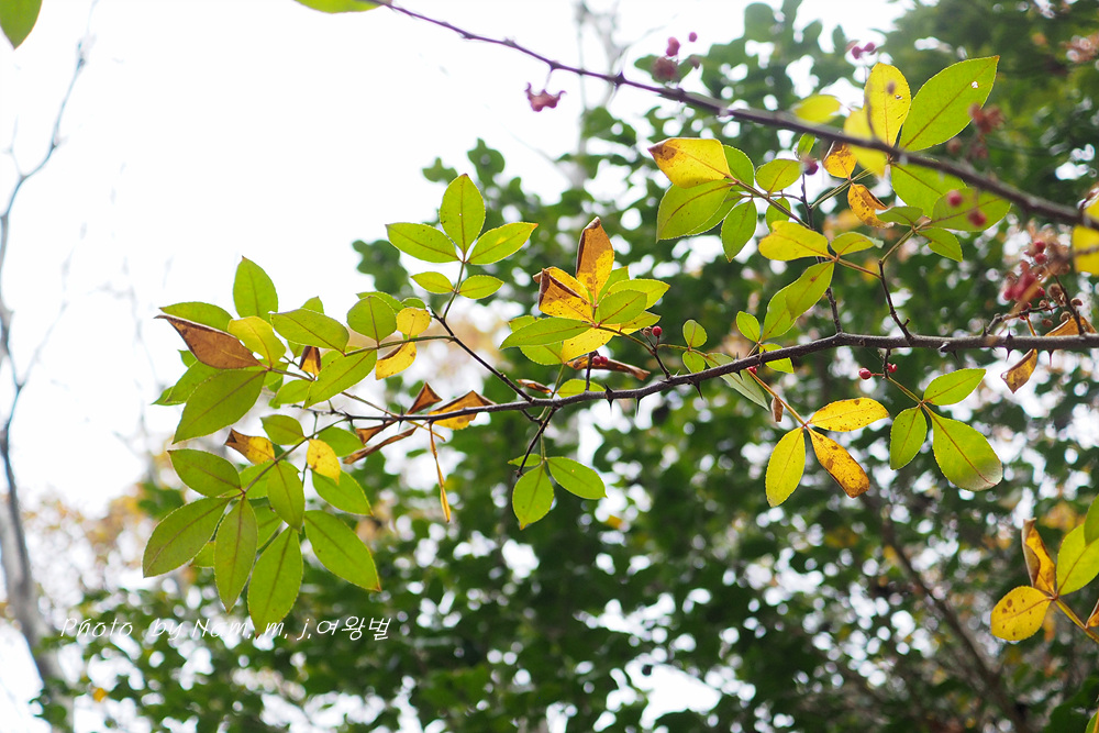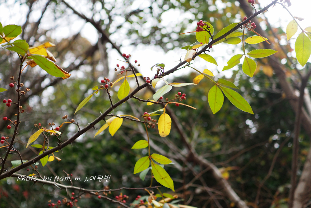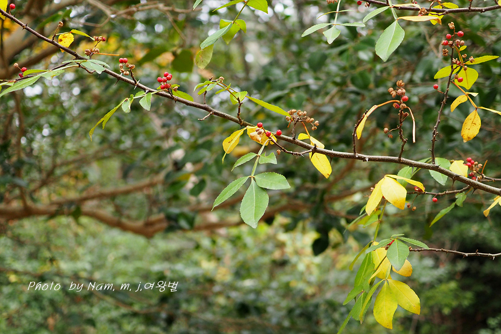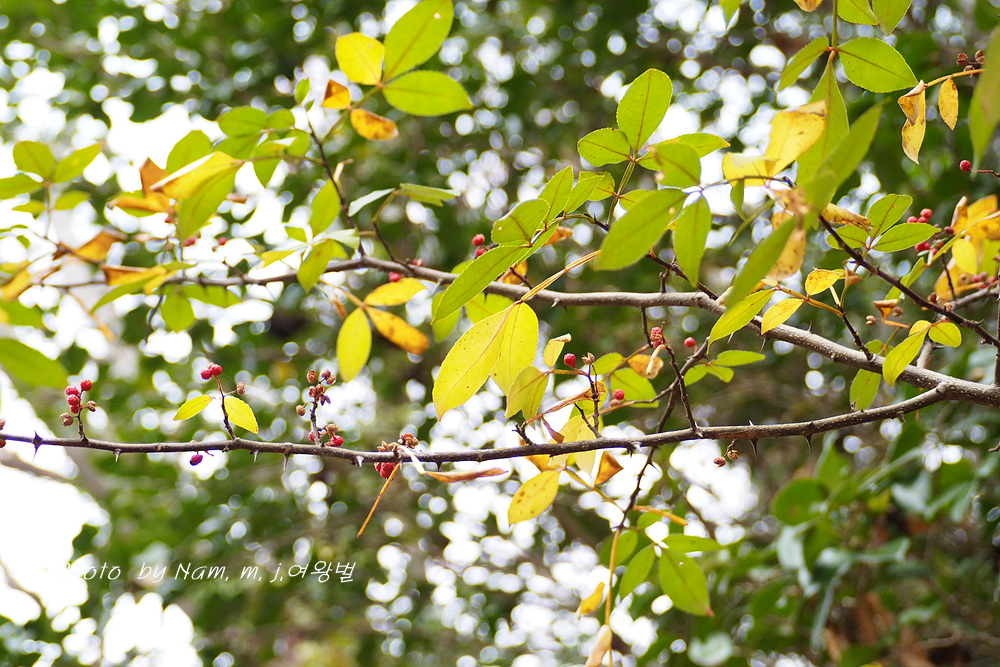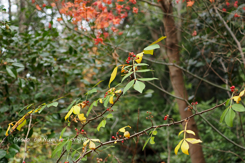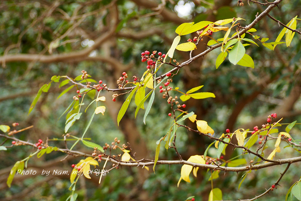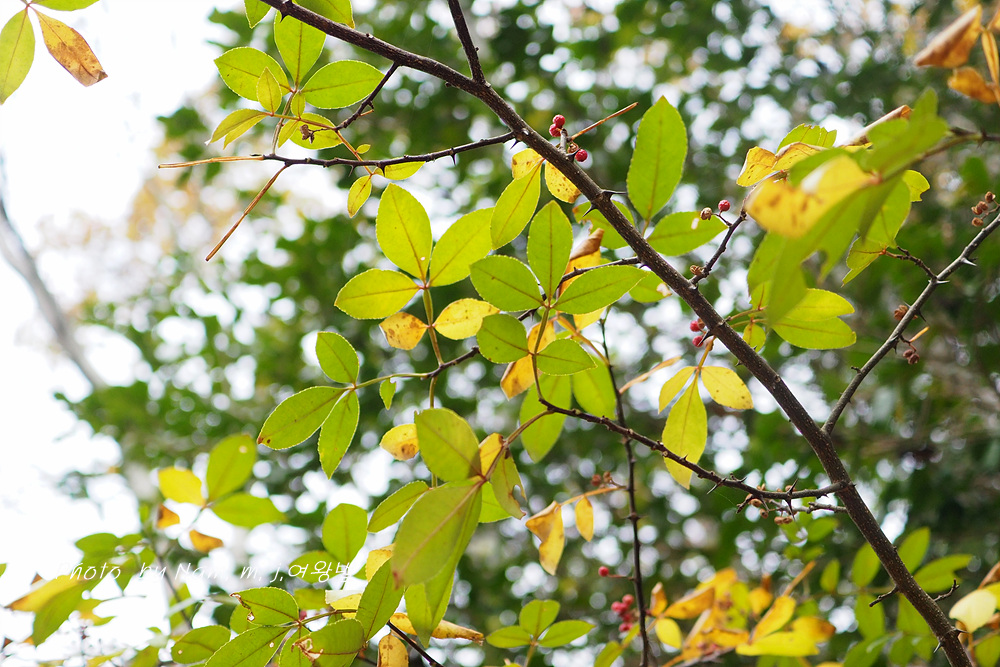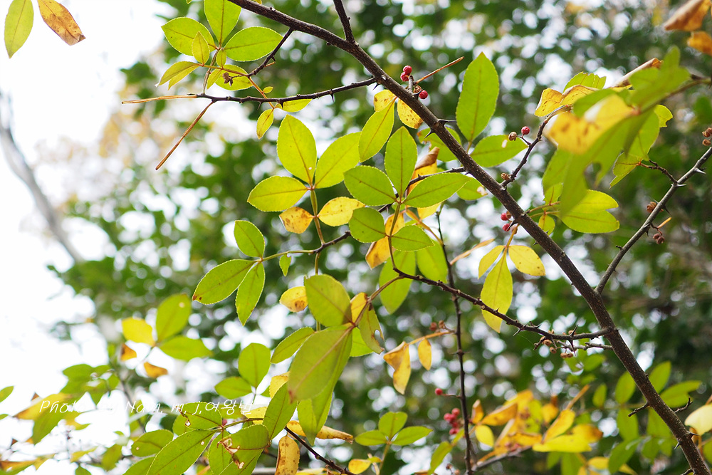 산초나무에 비해 잎이 상록성이며 엽축에 날개가 특징인 녀석은 남부지역 숲에서 쉽게 만날 수 있는 녀석이다.