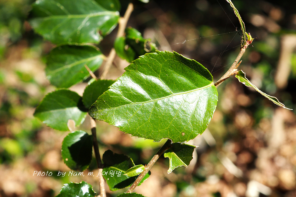 유목의 잎은 끝이 뵤족한 광난형으로 사스레피나무 잎과 비슷하다.